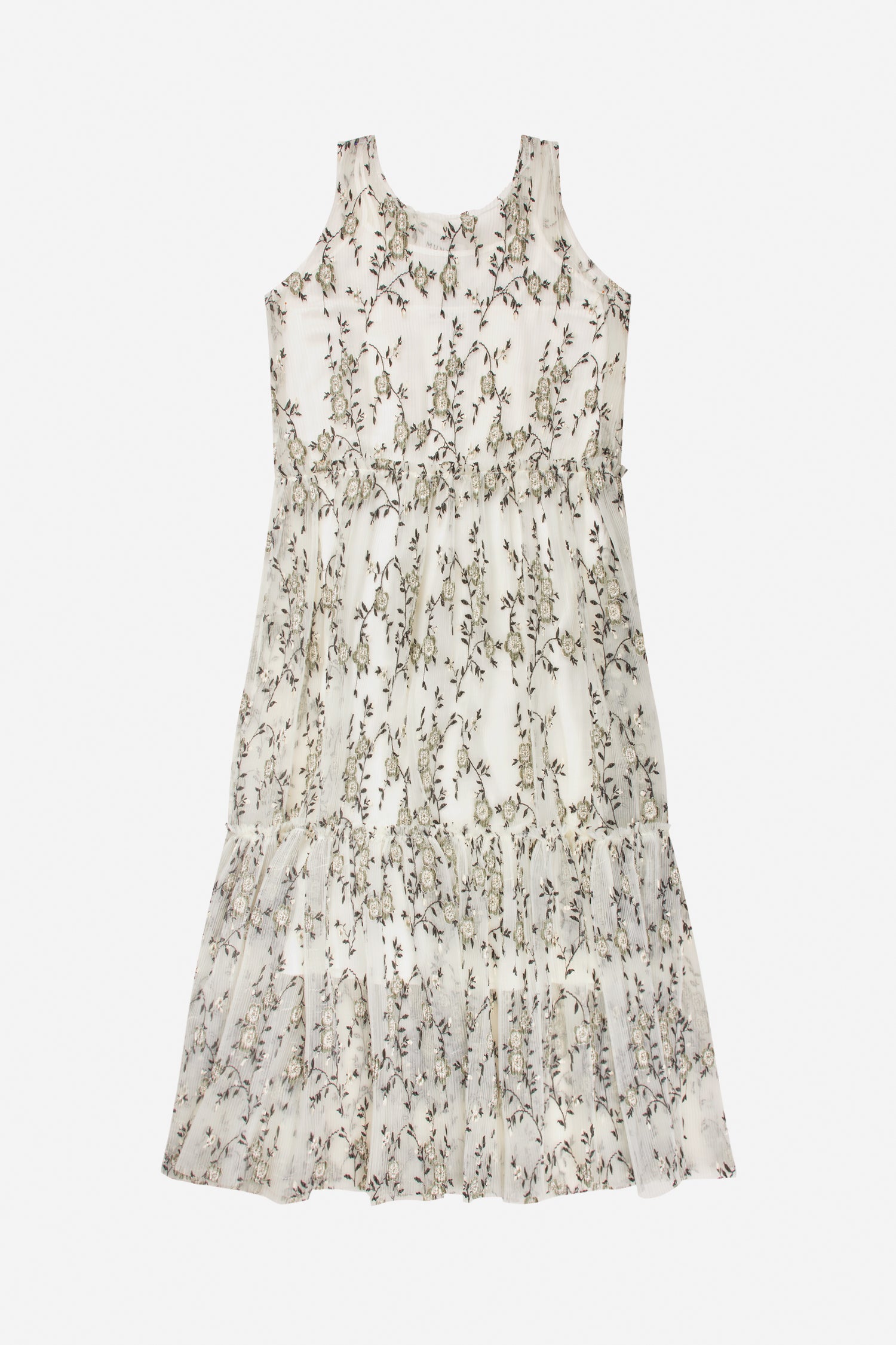 Jurk gemaakt van een lichte, doorschijnende stof met een all-over bloemenborduursel. Hij is mouwloos en wordt geleverd met een neutraal gekleurde onderjurk onder de doorschijnende stof.