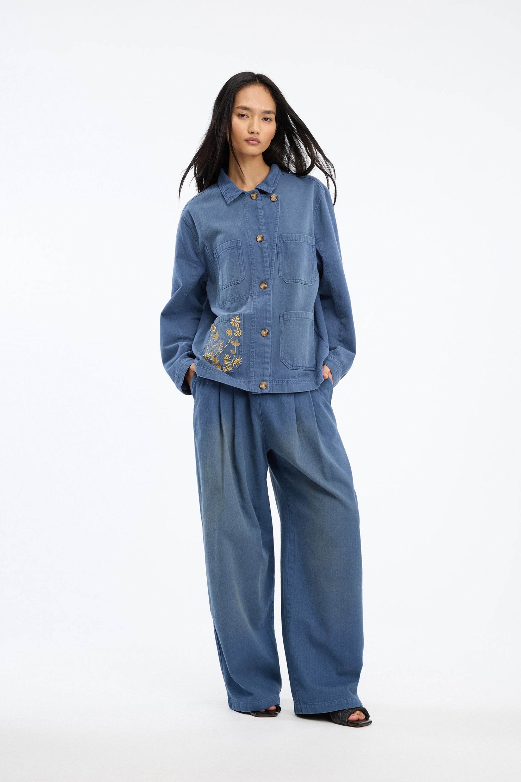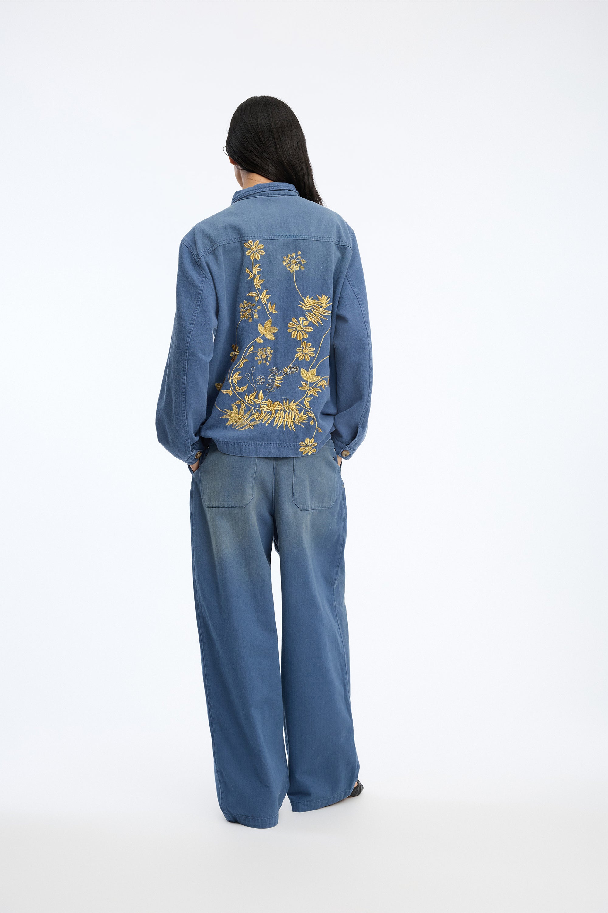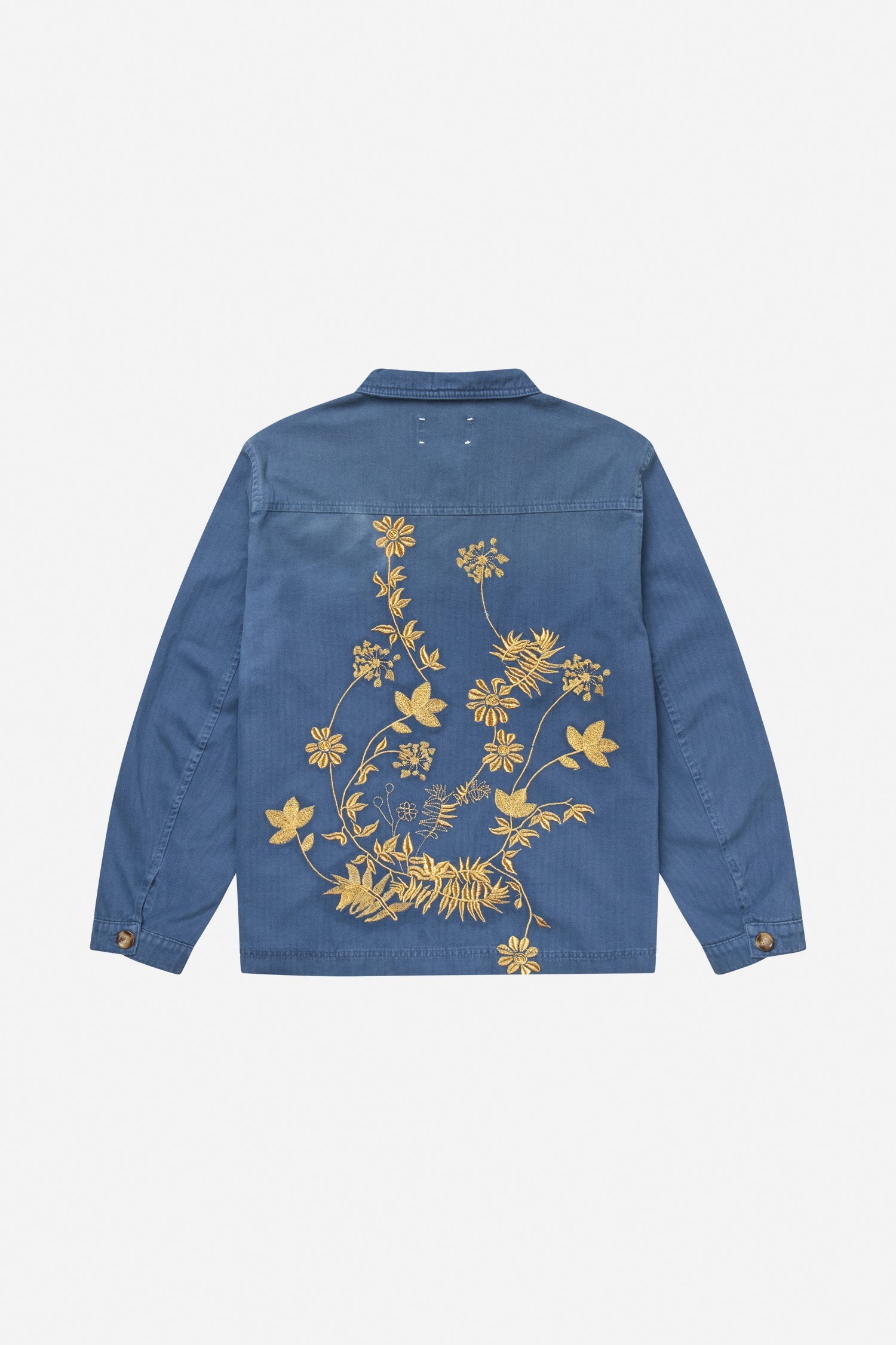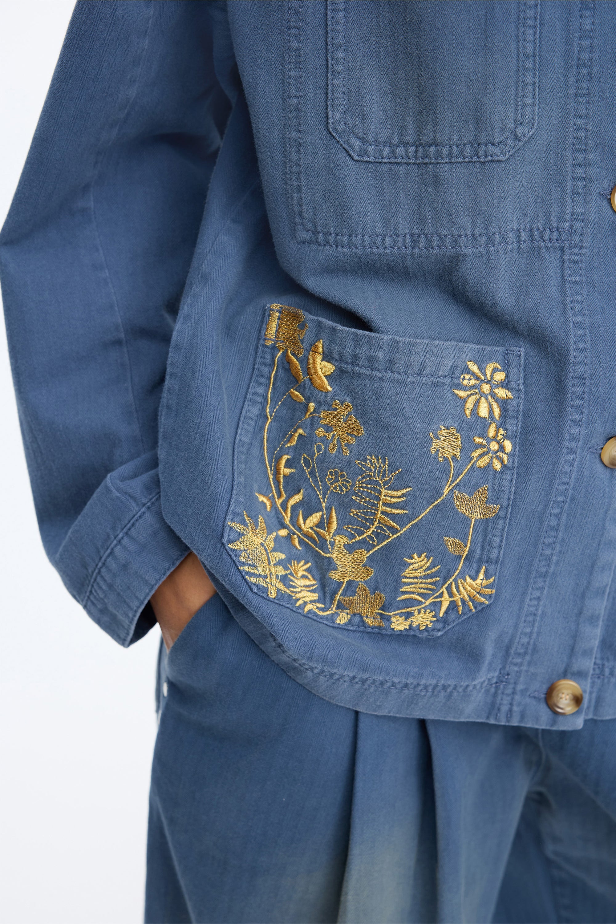 Dit jasje is gemaakt van een zachte geweven stof en heeft vier voorzakken en een knoopsluiting. Het is afgewerkt met een opvallend geborduurd motief op de zak en een grotere, vloeiende bloemenborduring op de achterkant, wat een artistiek en verfijnd accent toevoegt.