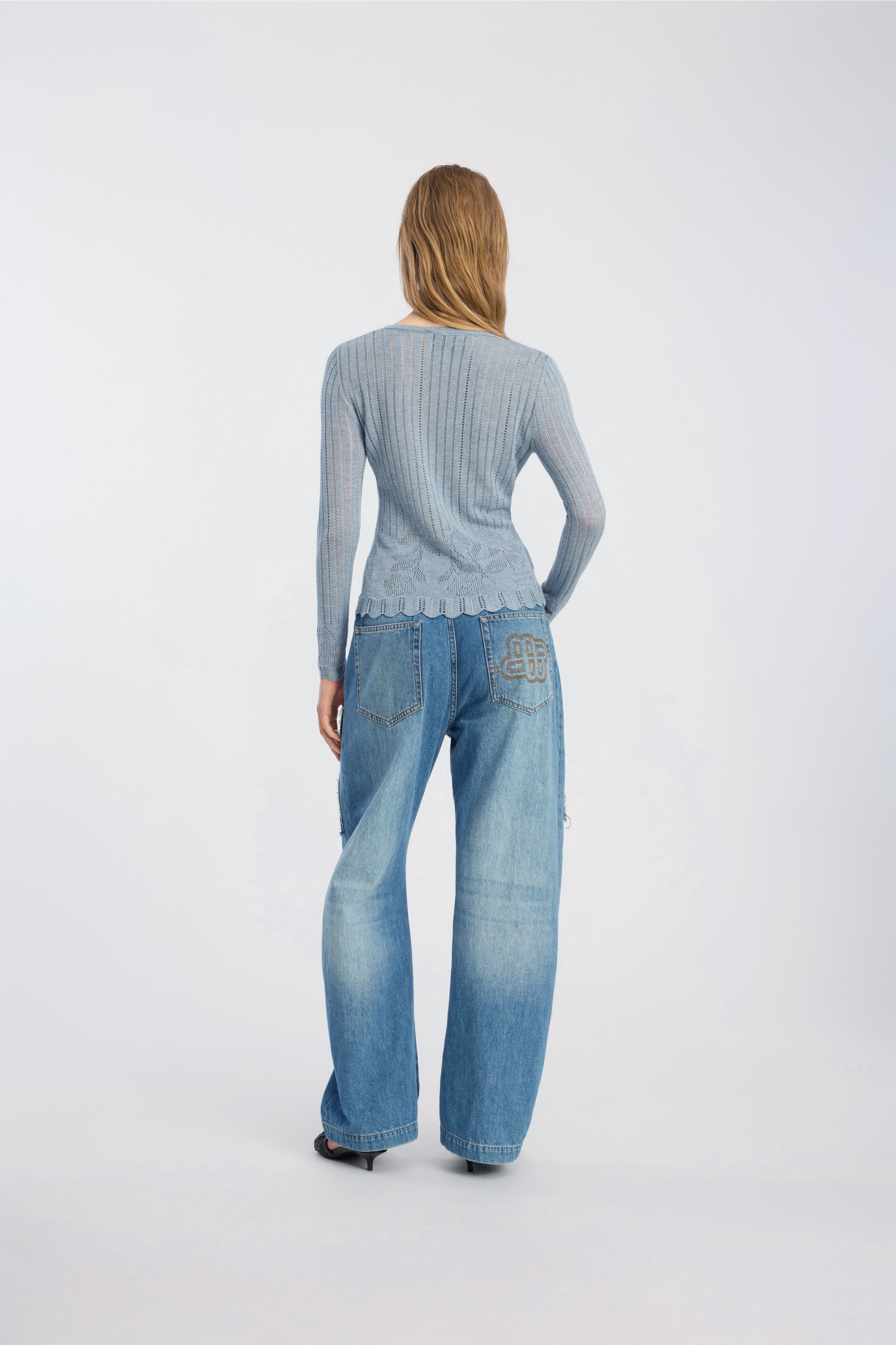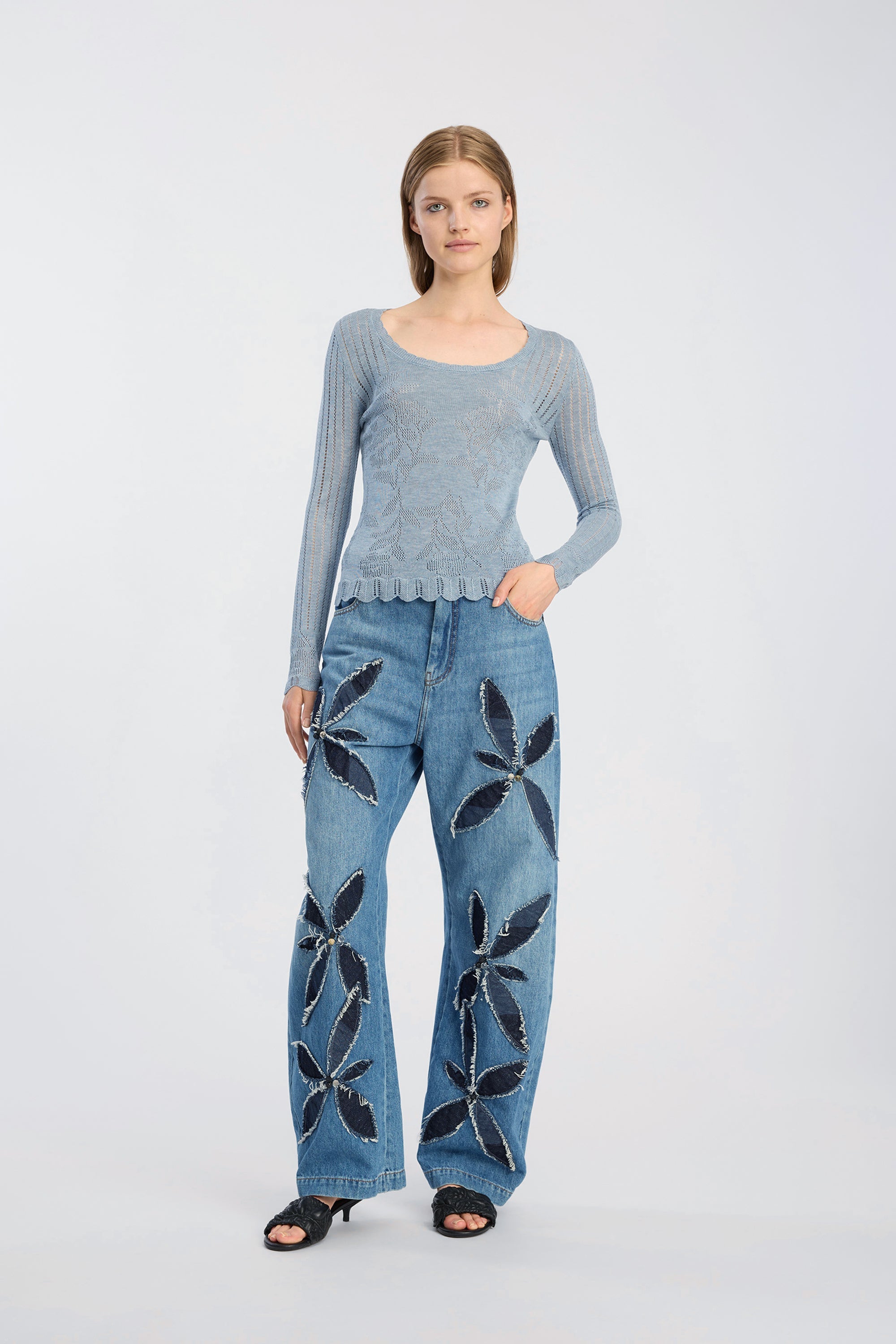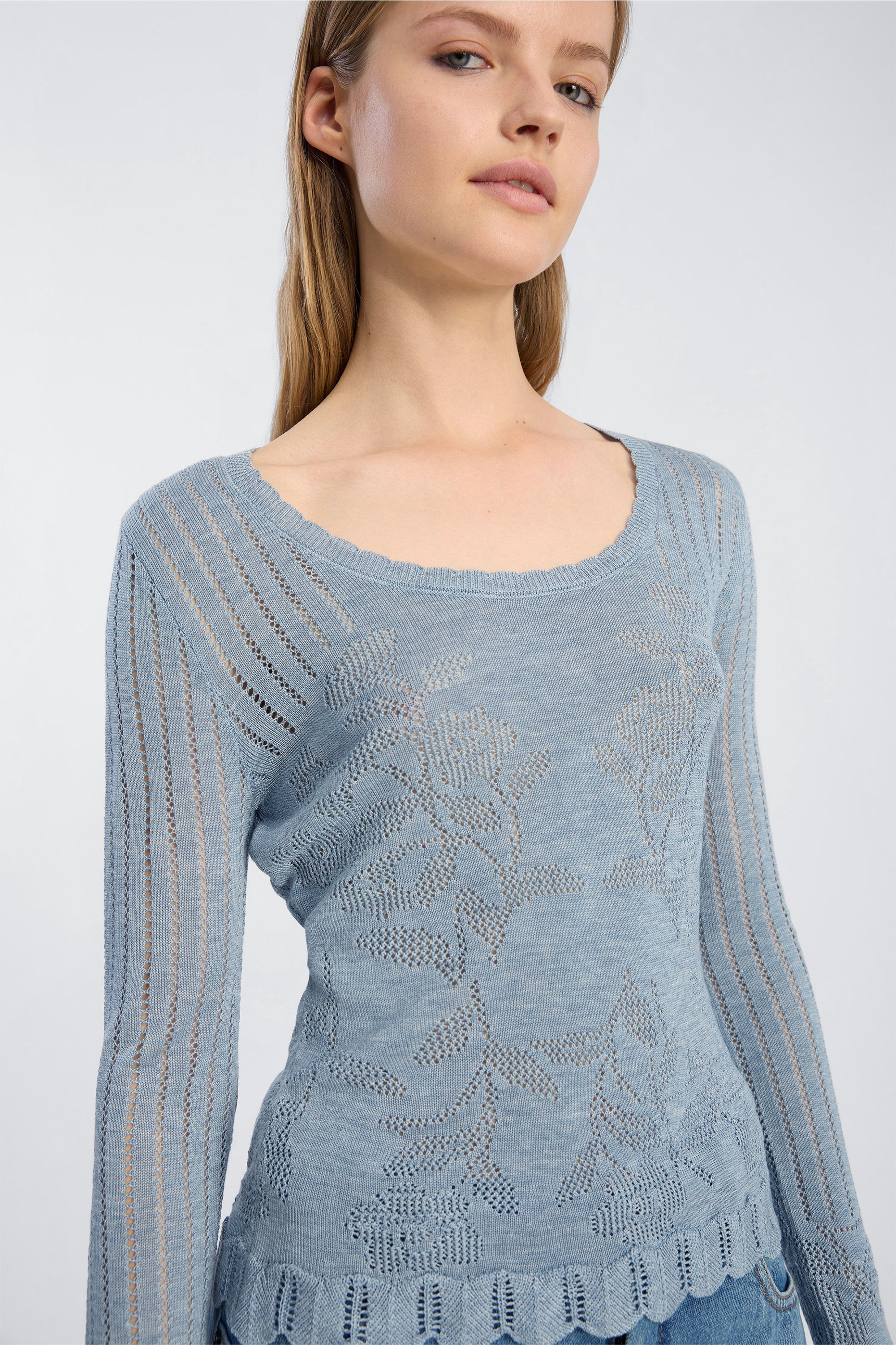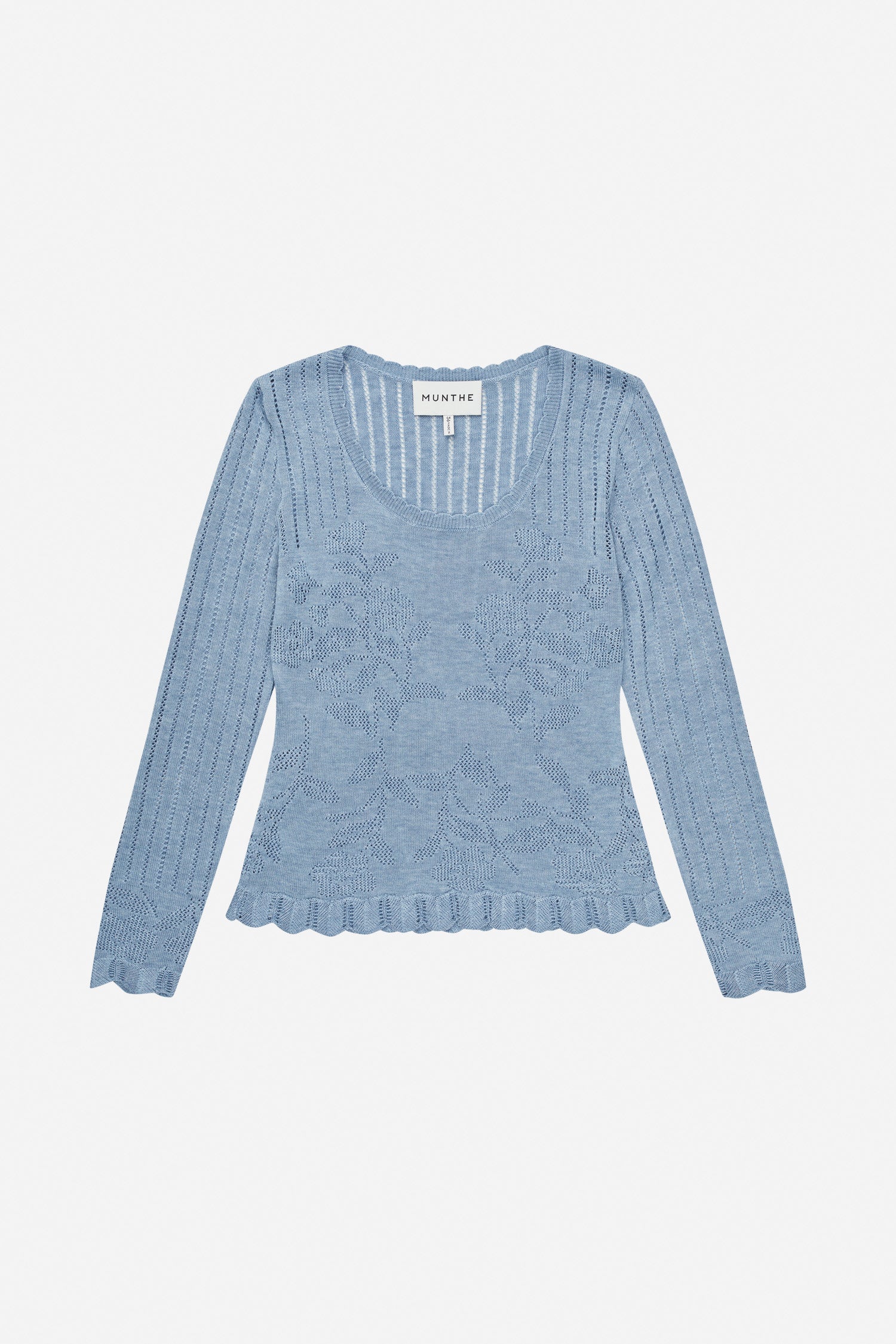 Gebreide top met lange mouwen, een ronde hals en een opengewerkt patroon met bloemen over het geheel. Ontworpen met een aansluitend silhouet en gegolfde randen bij de zoom en manchetten.