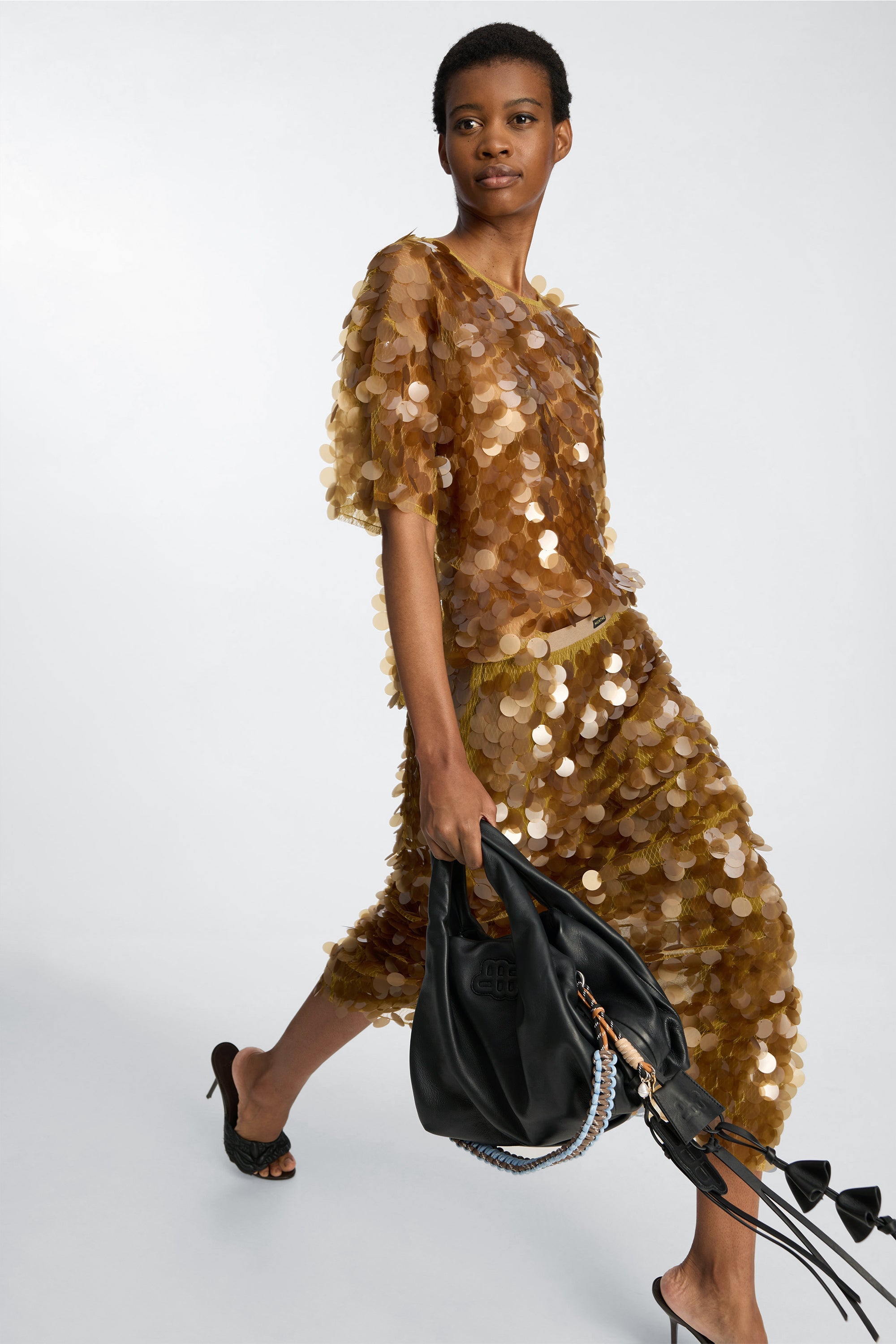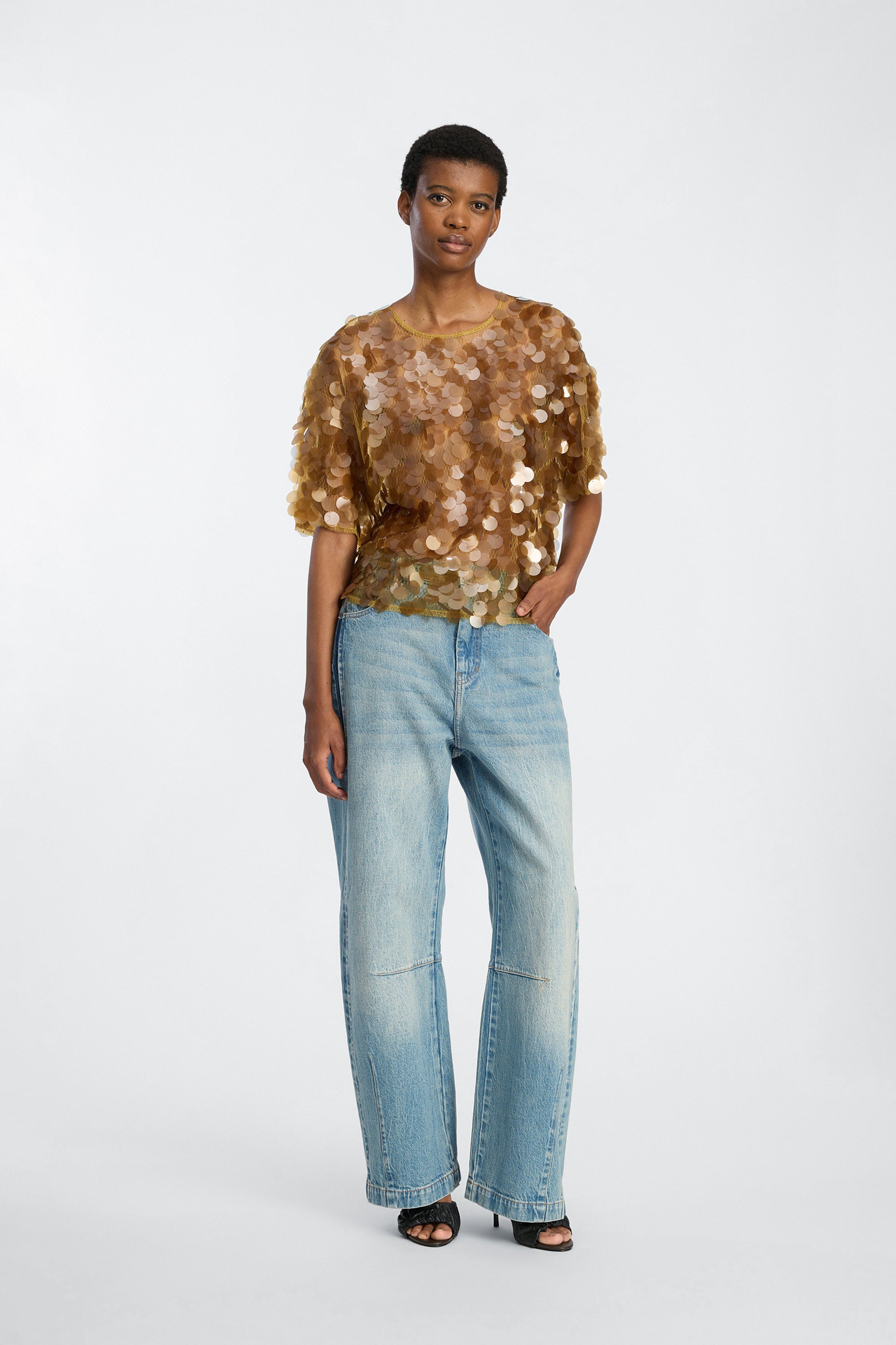 Deze top is gemaakt met grote transparante pailletten die een gedurfde, gestructureerde uitstraling creëren. Hij heeft korte mouwen, een lichte boxy pasvorm en een semi-transparante kwaliteit, ideaal om in lagen te dragen.