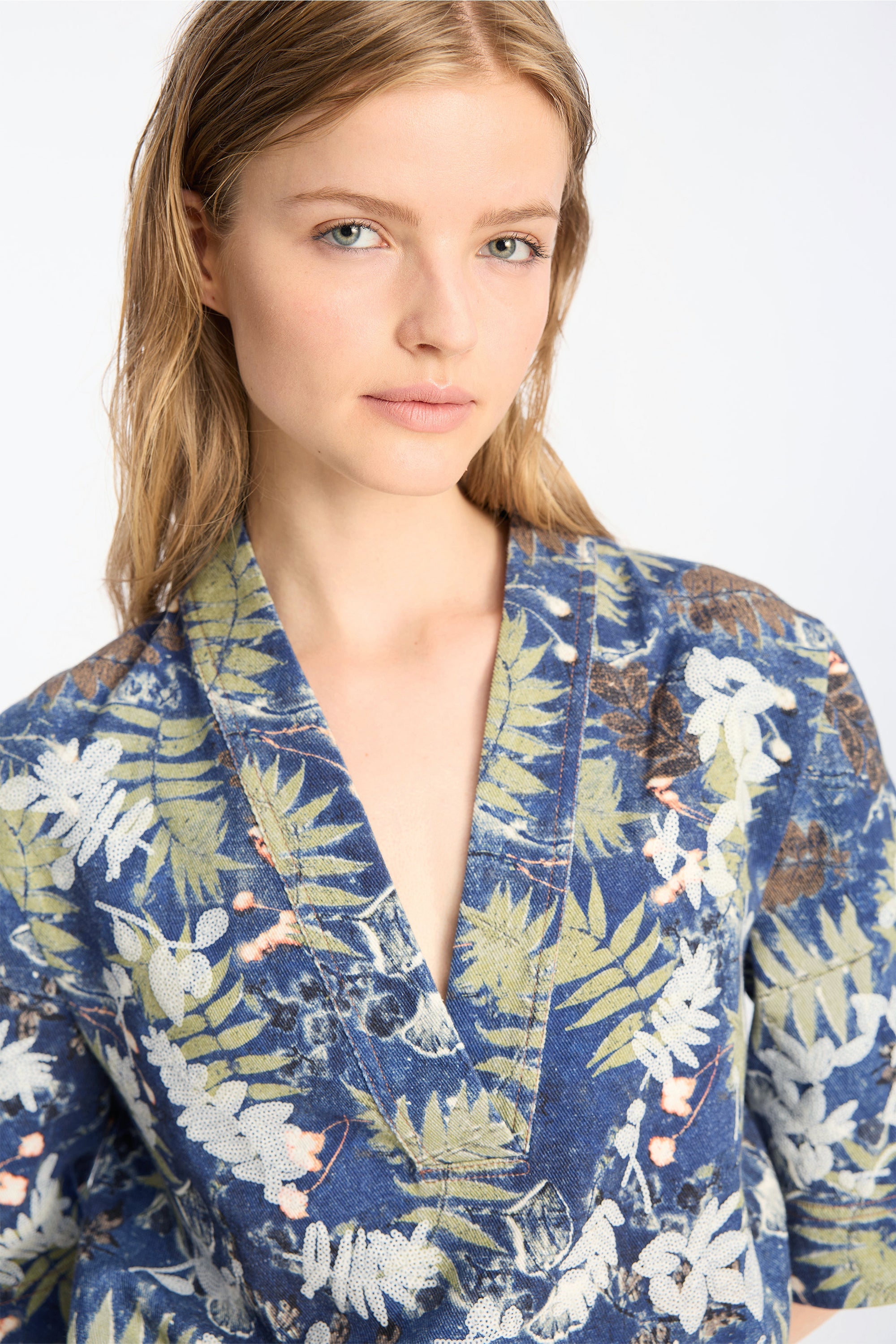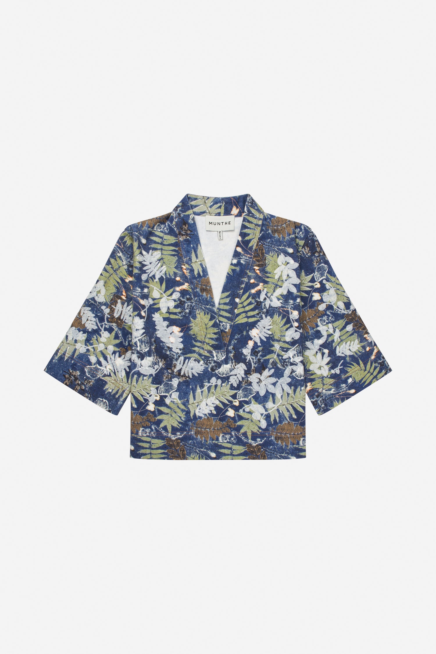 Top met een botanische print in diepblauwe en aardse groentinten. De top heeft een normale pasvorm, korte mouwen, een open voorkant en geeft elke outfit een artistieke uitstraling.