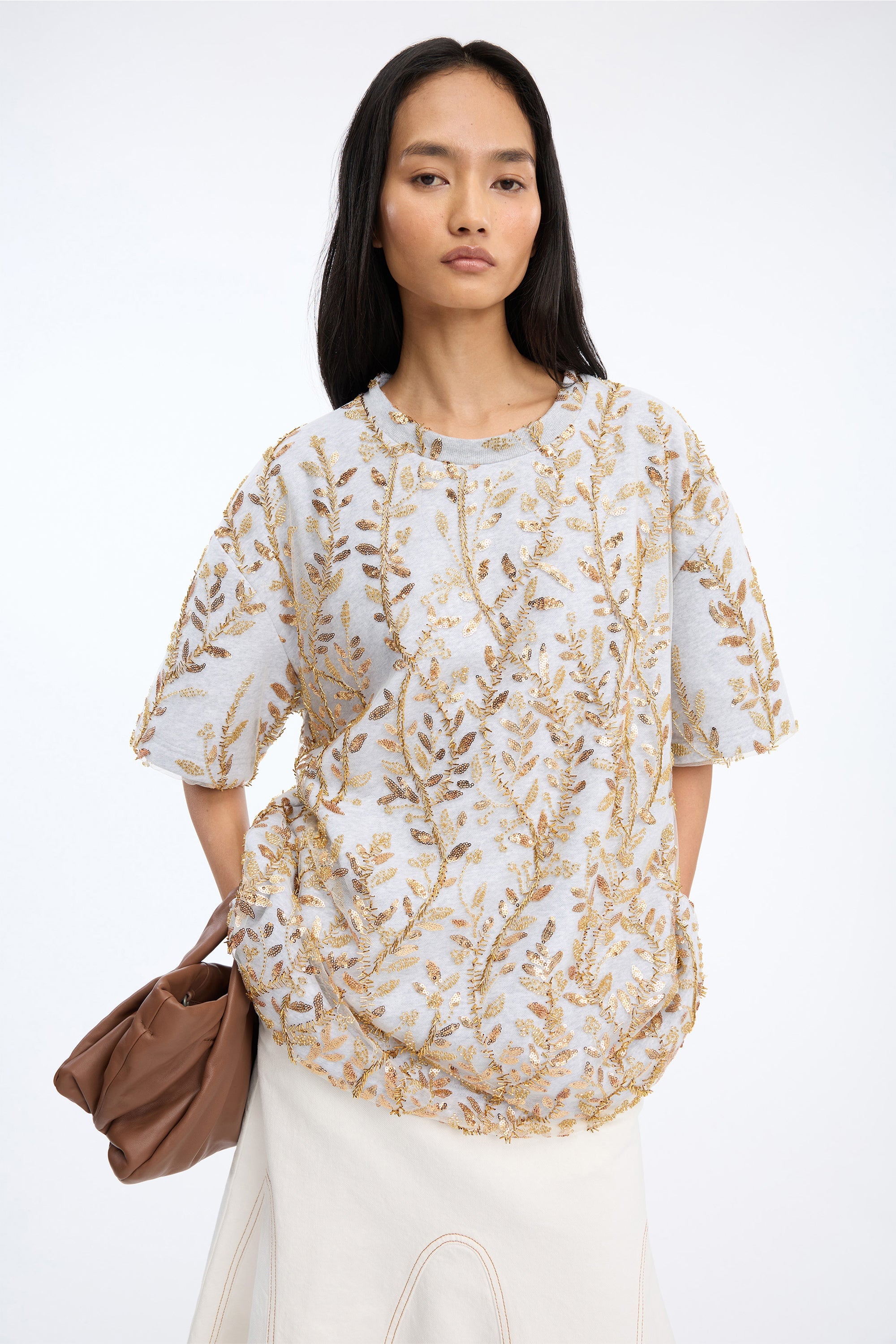 T-shirt met een oversized pasvorm en een dicht bladmotief van goudkleurige pailletten en parels. Afgewerkt met korte mouwen, een ronde hals en een zachte, flexibele uitstraling.