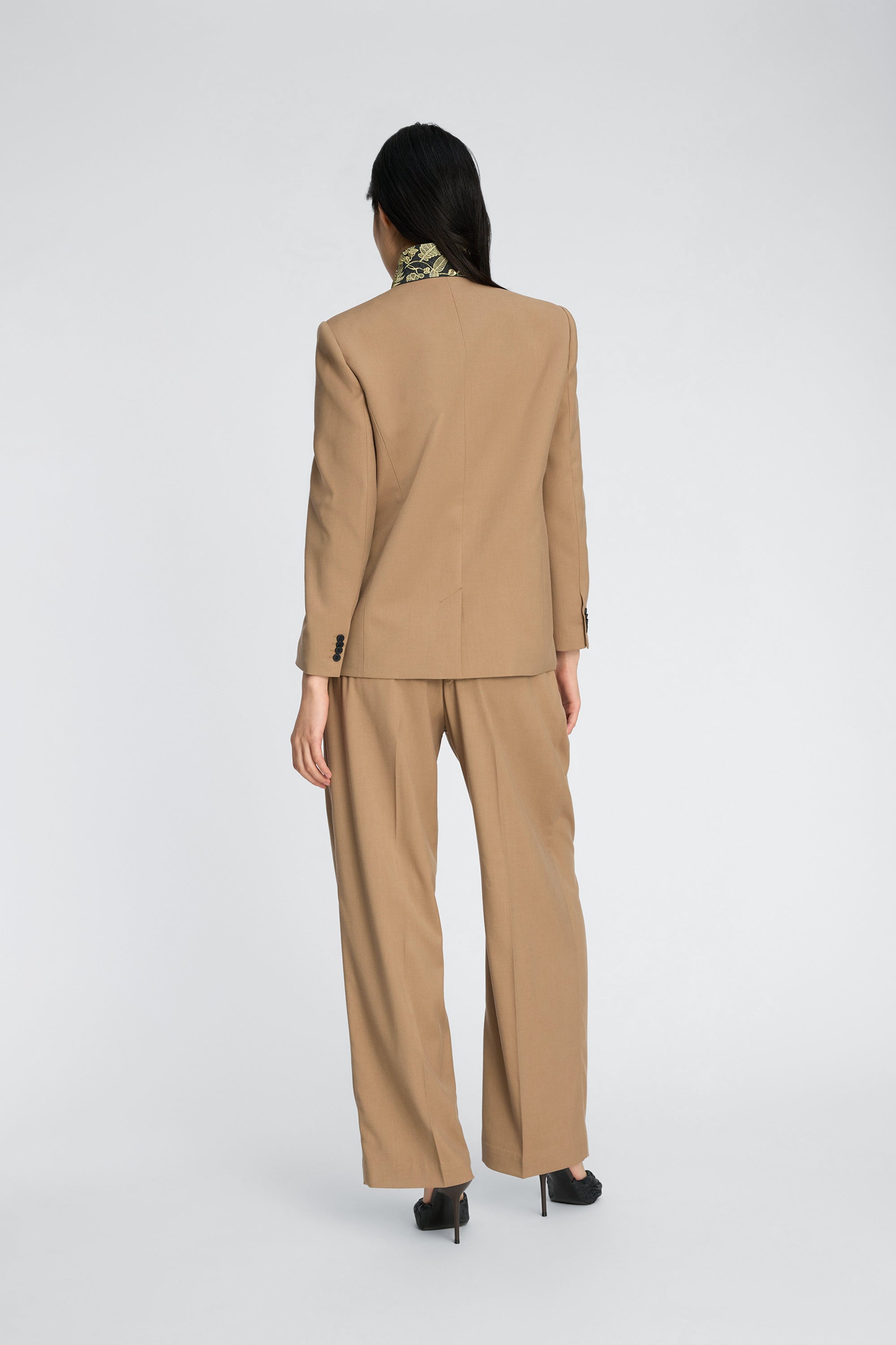 Blazer gemaakt van een glad geweven materiaal met een getailleerde pasvorm. Ontworpen met een enkelknopsluiting, voorzakken en een contrasterend kraagdetail dat een subtiel decoratief accent toevoegt.