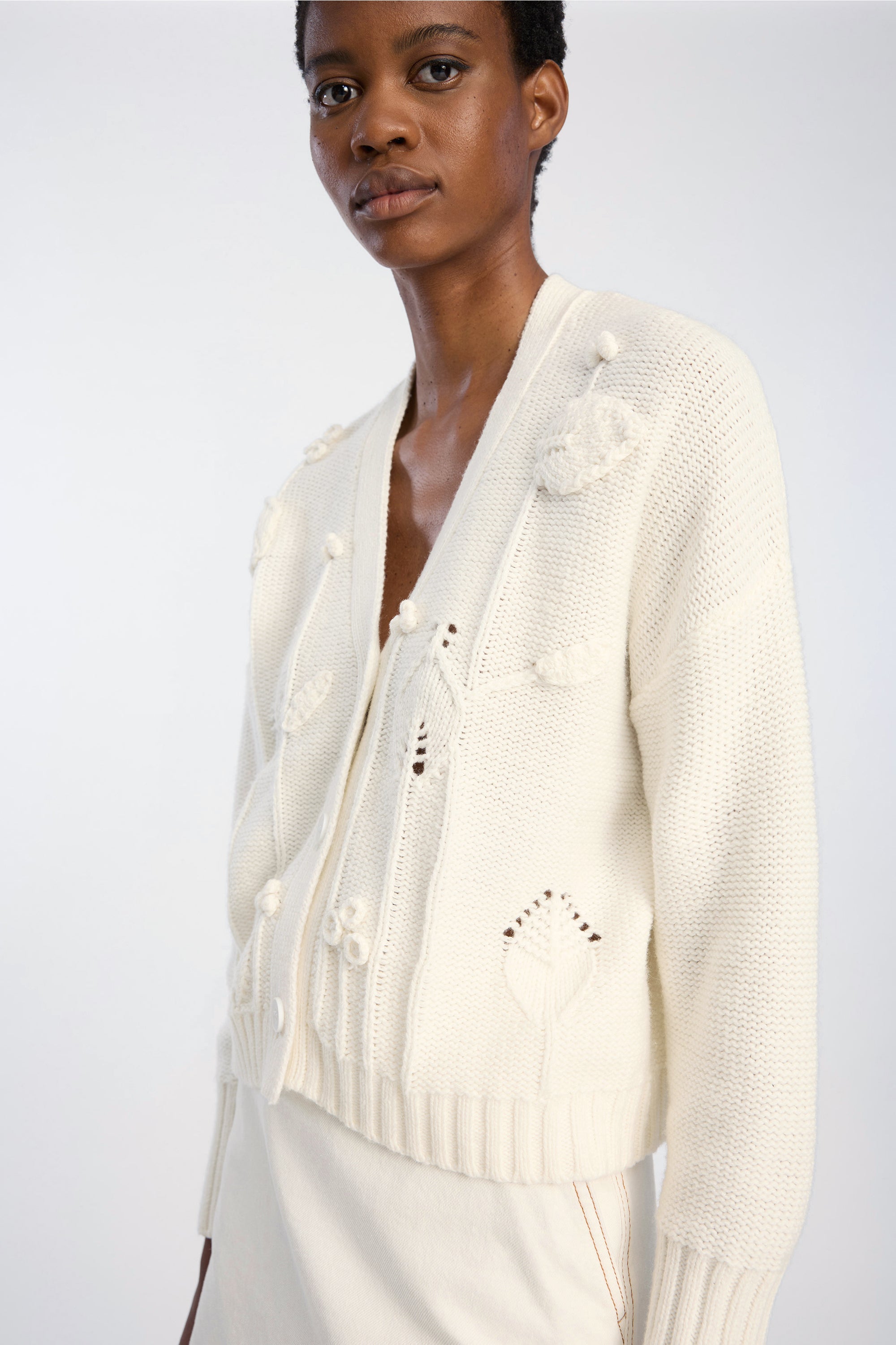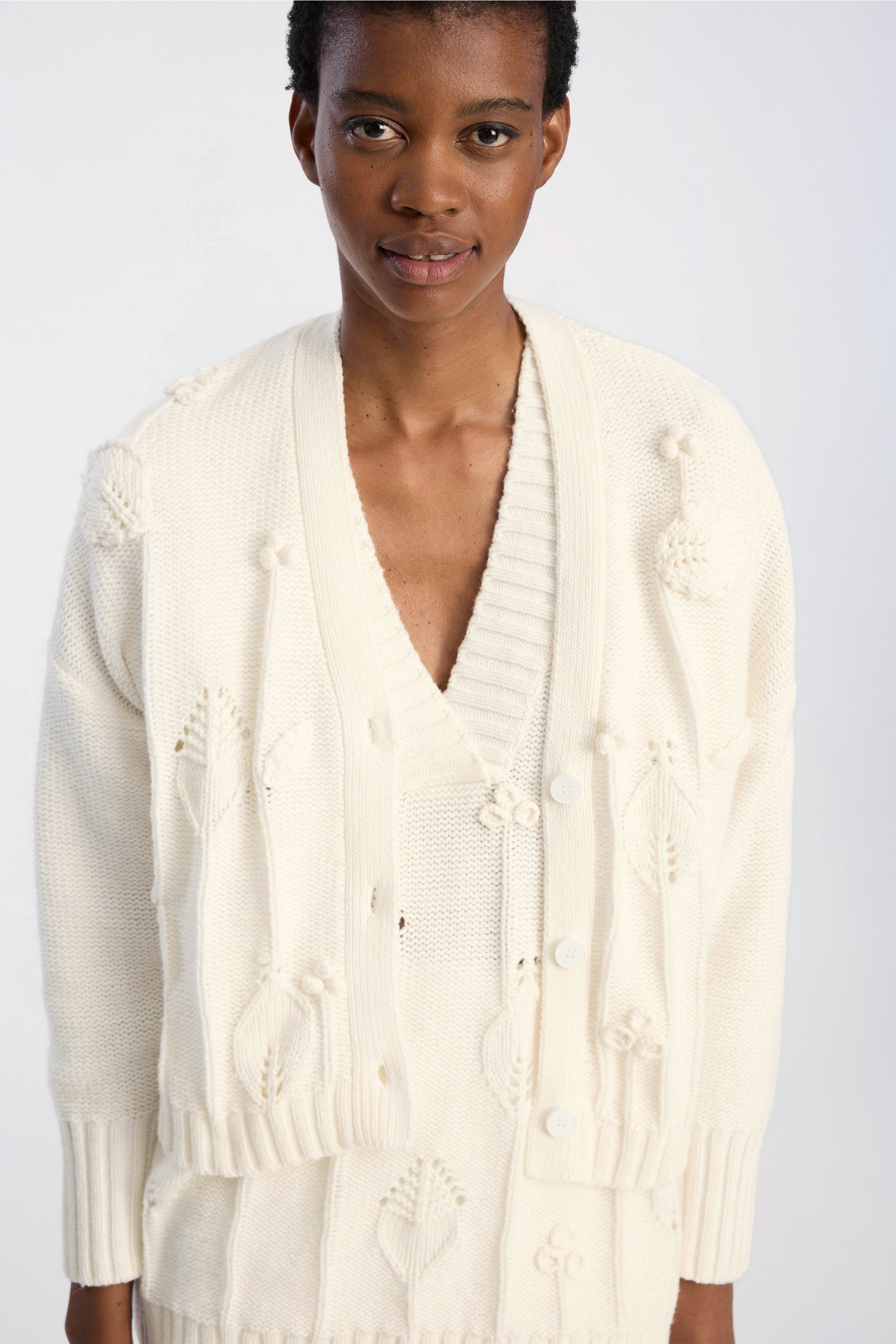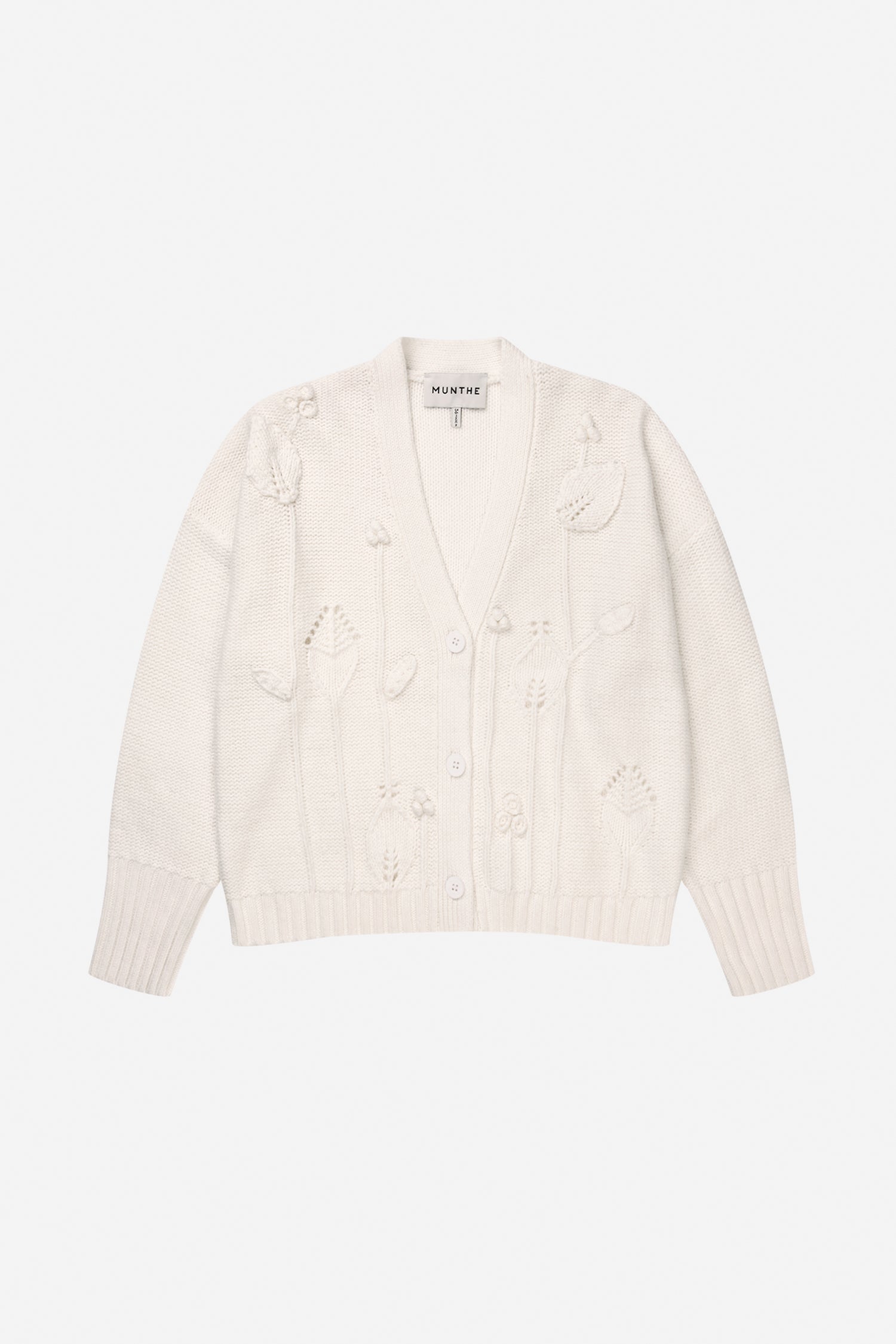 Cardigan met V-hals, knoopsluiting aan de voorkant en een verhoogd bloemmotief in het breiwerk. Ontworpen met lange mouwen en geribde randen bij de manchetten en zoom.