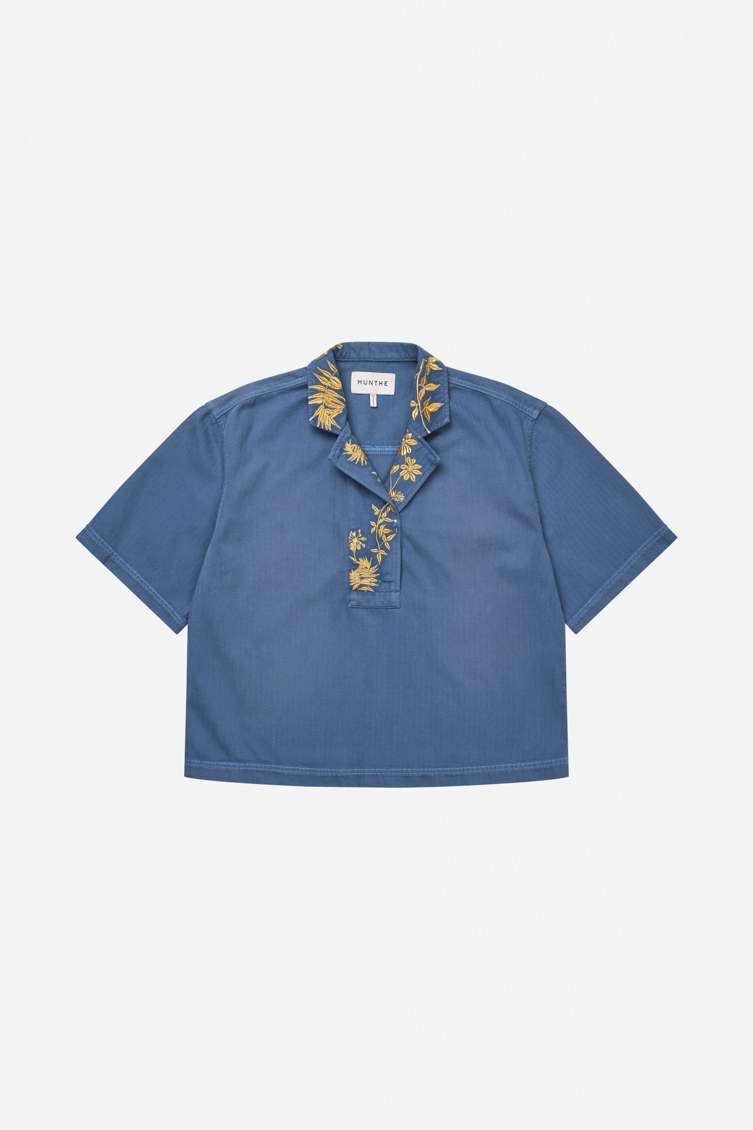 Deze top is gemaakt met geborduurde details langs de kraag en heeft korte mouwen, een open kraaghals en een lichte, boxy pasvorm van zacht denim.