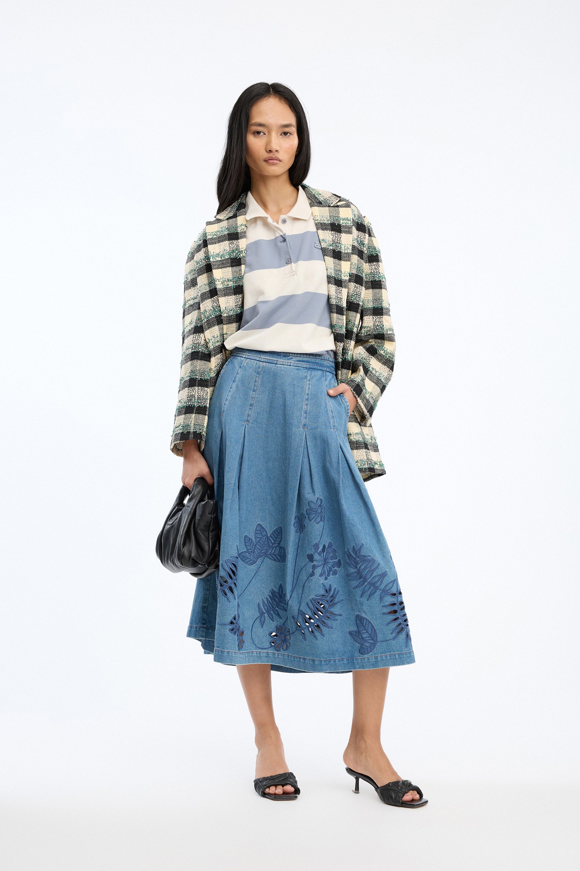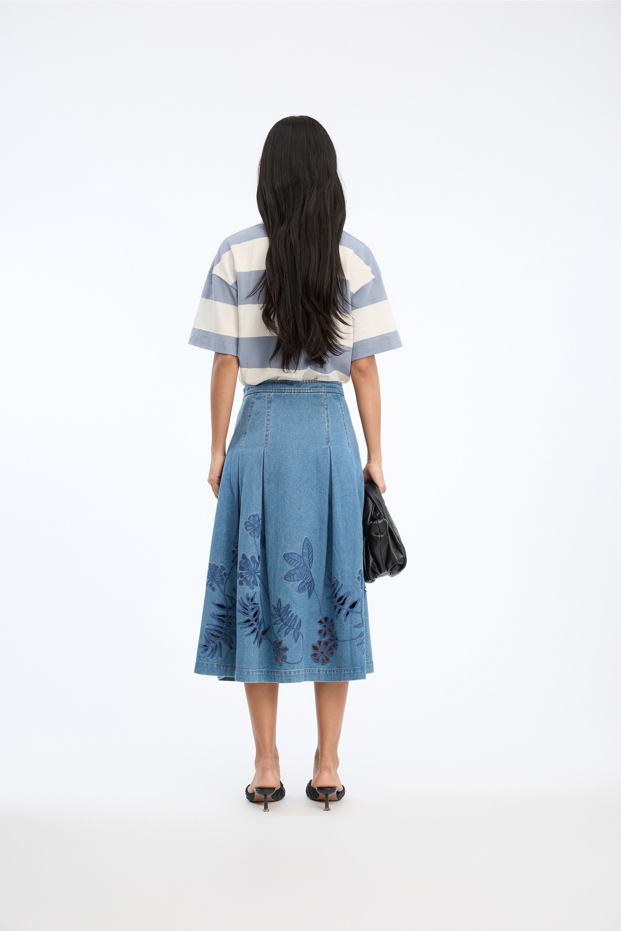 Deze rok is gemaakt van denim en heeft geborduurde bloem- en bladmotieven langs de zoom. Het heeft een A-lijnsilhouet met zichtbare naaddetails en zijzakken.