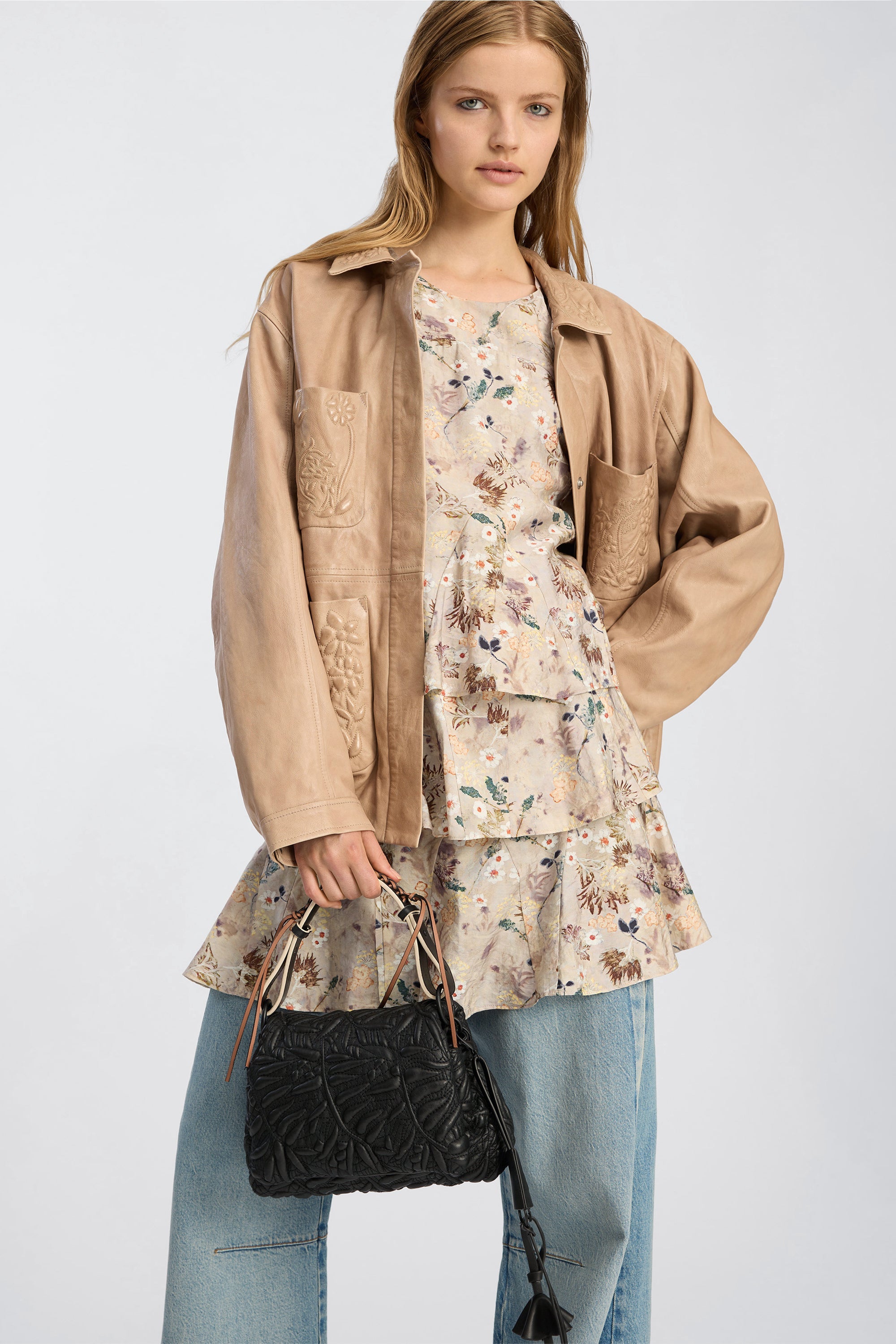Jurk gemaakt van een licht geweven stof, versierd met een bloemen-botanisch patroon. Het ontwerp heeft een ronde hals, korte mouwen met brede, gelaagde ruches en een losse pasvorm die een luchtige, volumineuze val geeft. De gelaagde ruches lopen door in de rok, waardoor de jurk structuur en beweging krijgt.