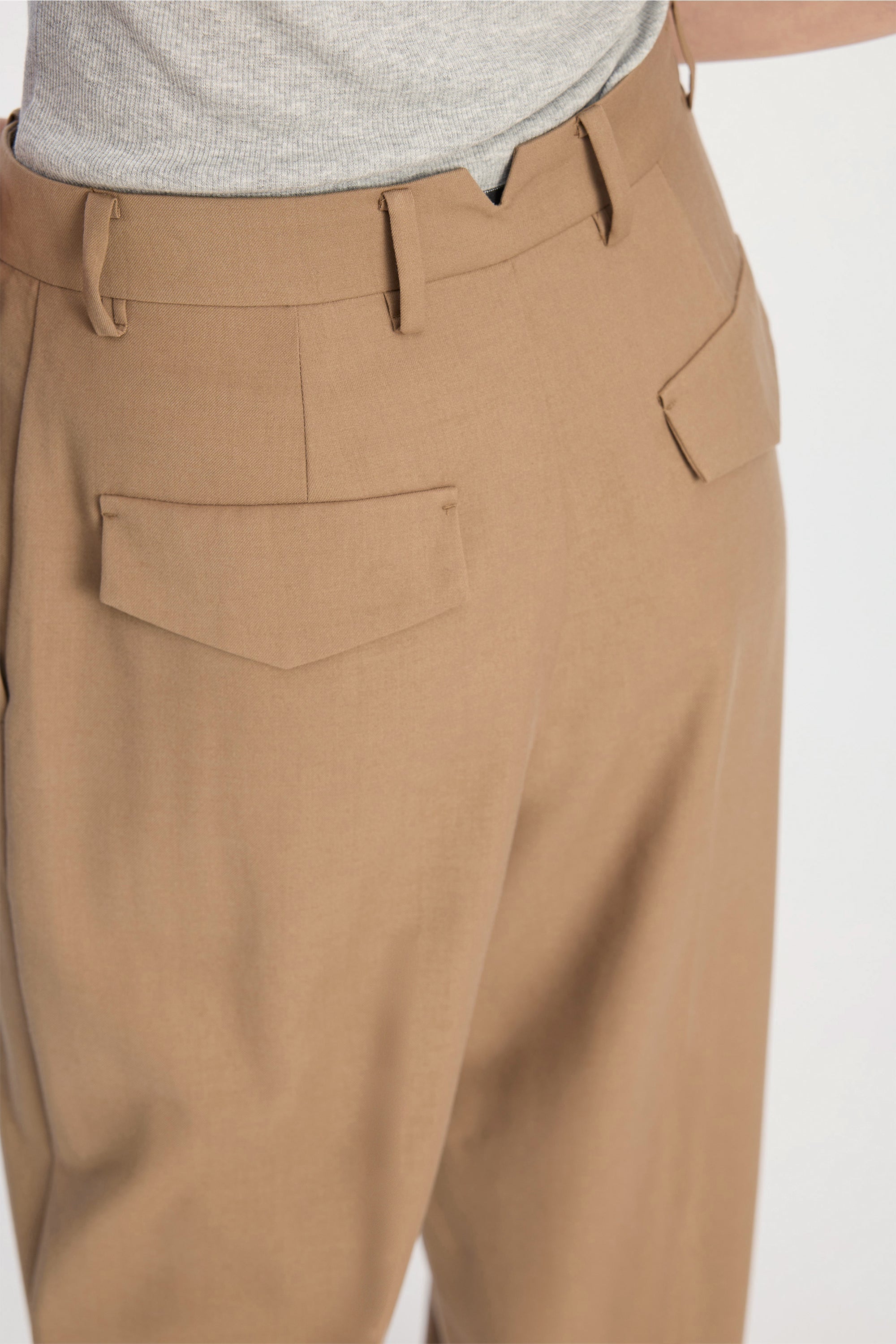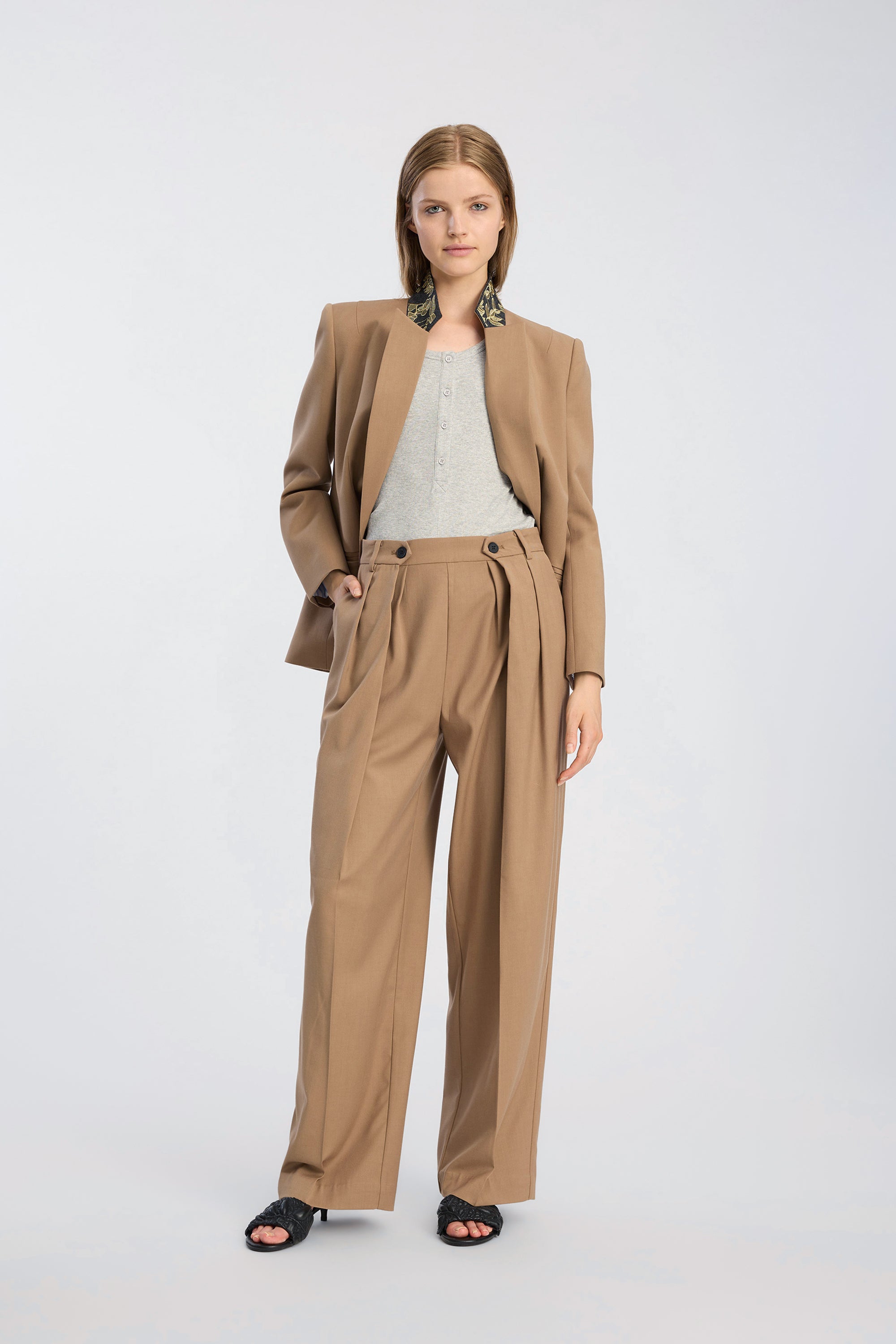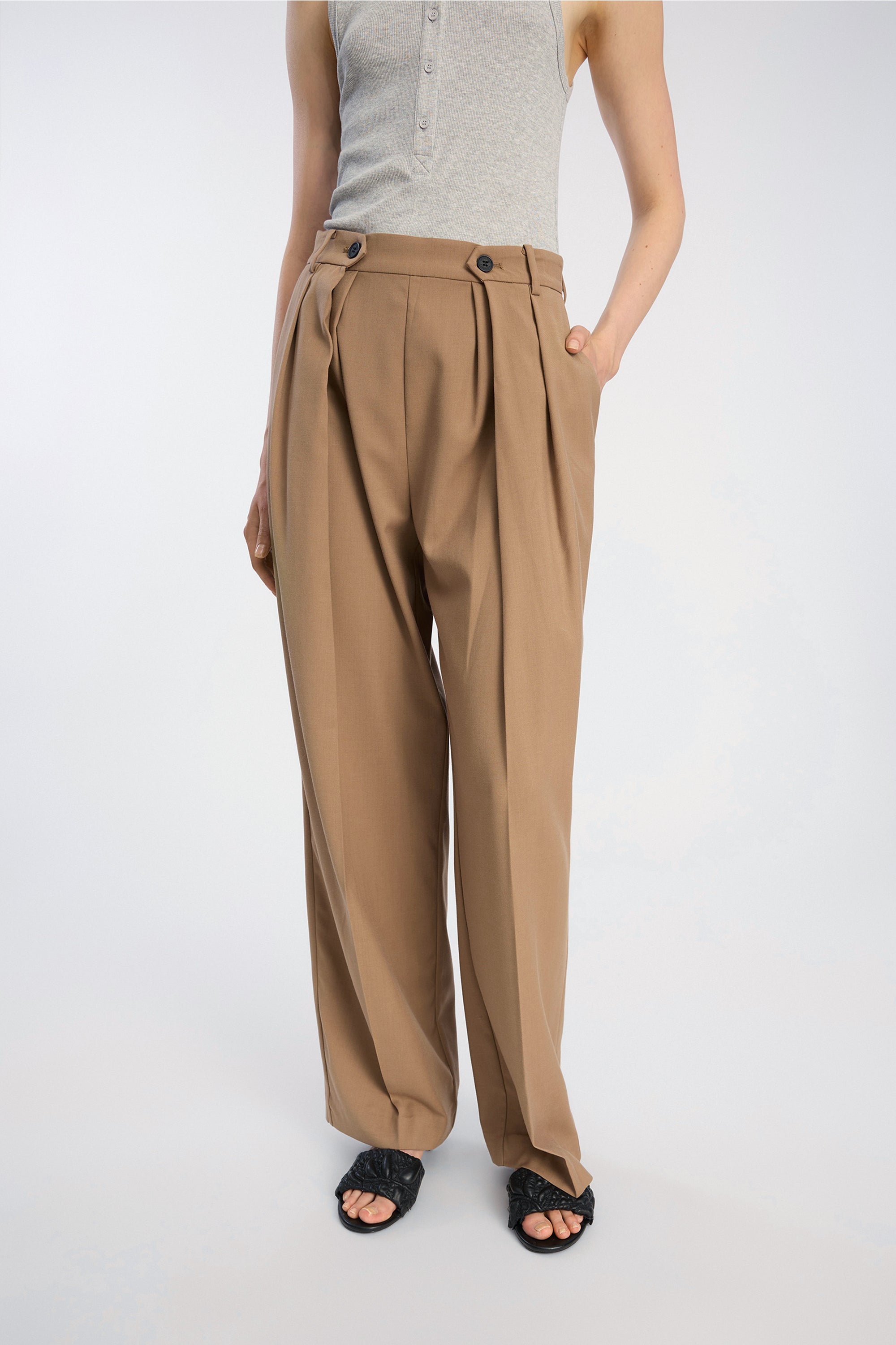 Broek met rechte pijpen en uitgesproken voorplooien. Het model heeft een hoge taille, brede riemlussen met knoopdetails en geperste vouwen voor een gestructureerd en tijdloos silhouet.