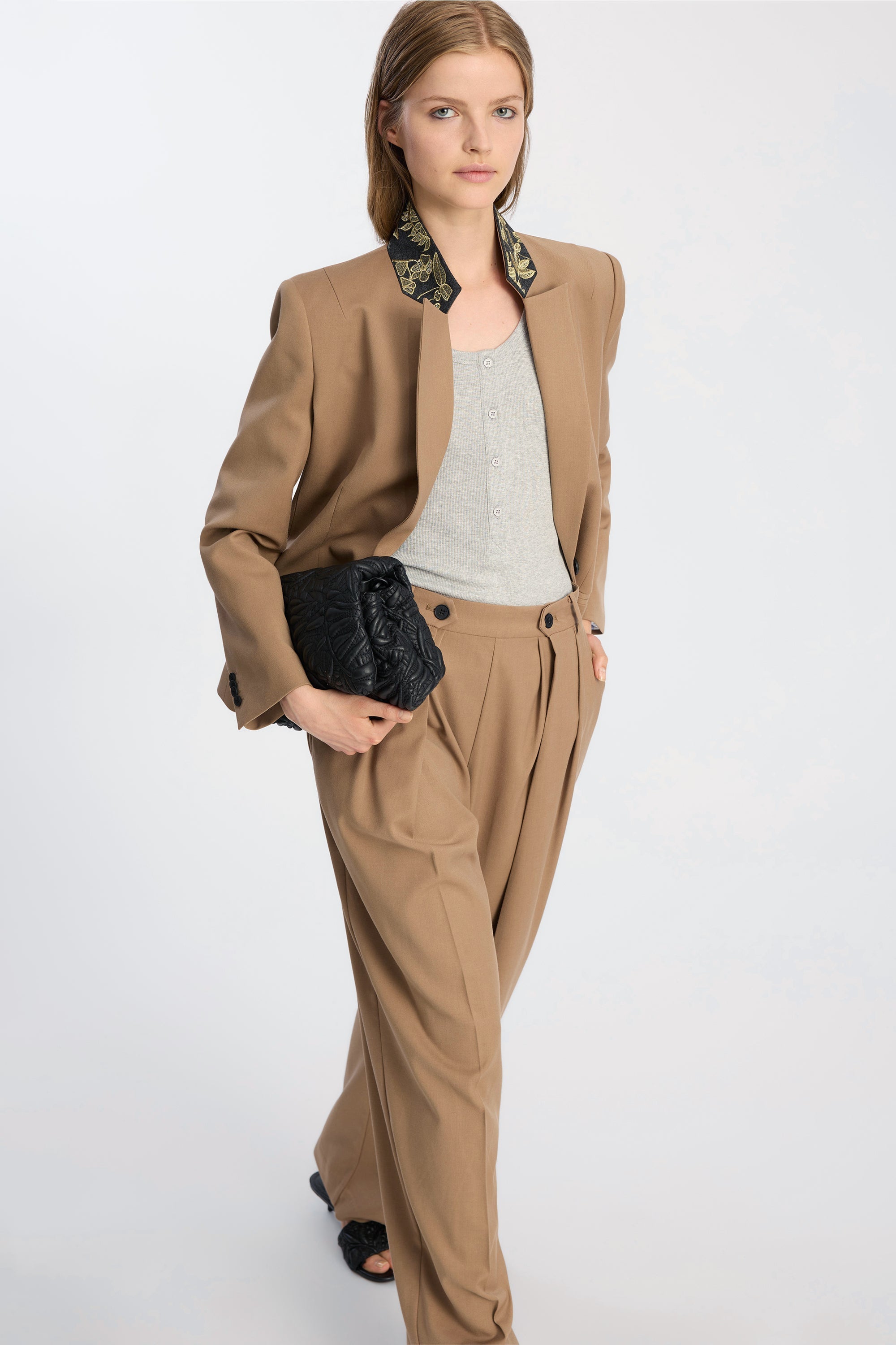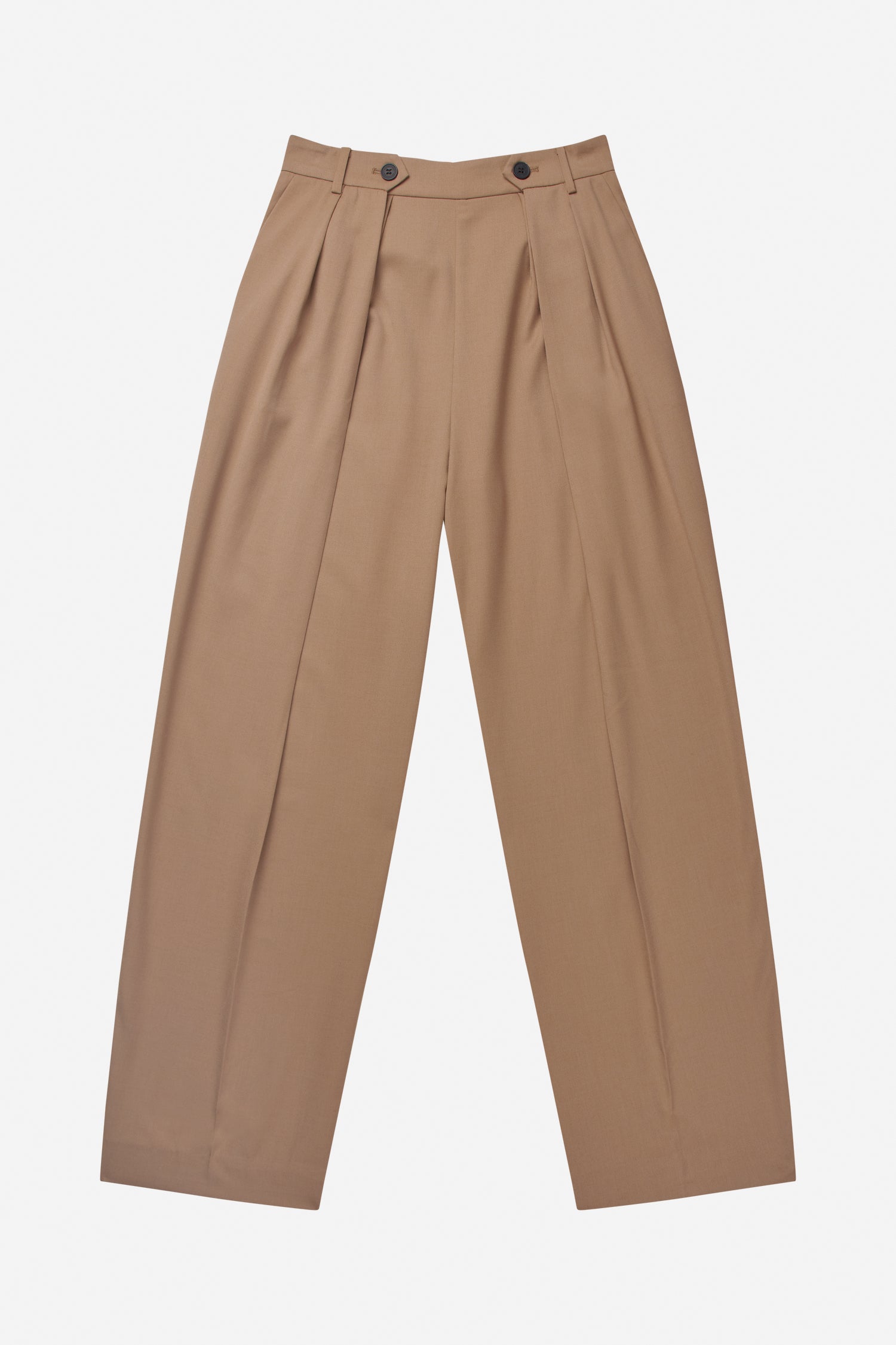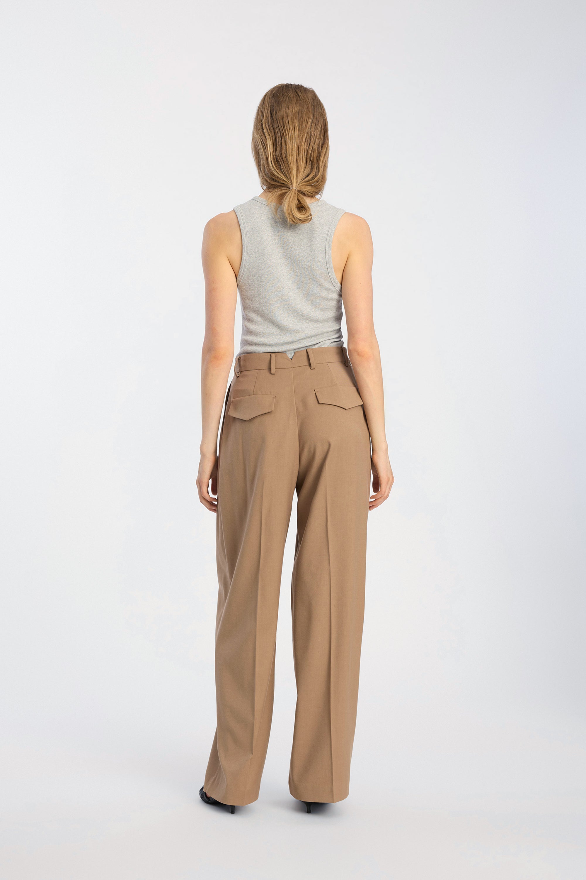 Broek met rechte pijpen en uitgesproken voorplooien. Het model heeft een hoge taille, brede riemlussen met knoopdetails en geperste vouwen voor een gestructureerd en tijdloos silhouet.