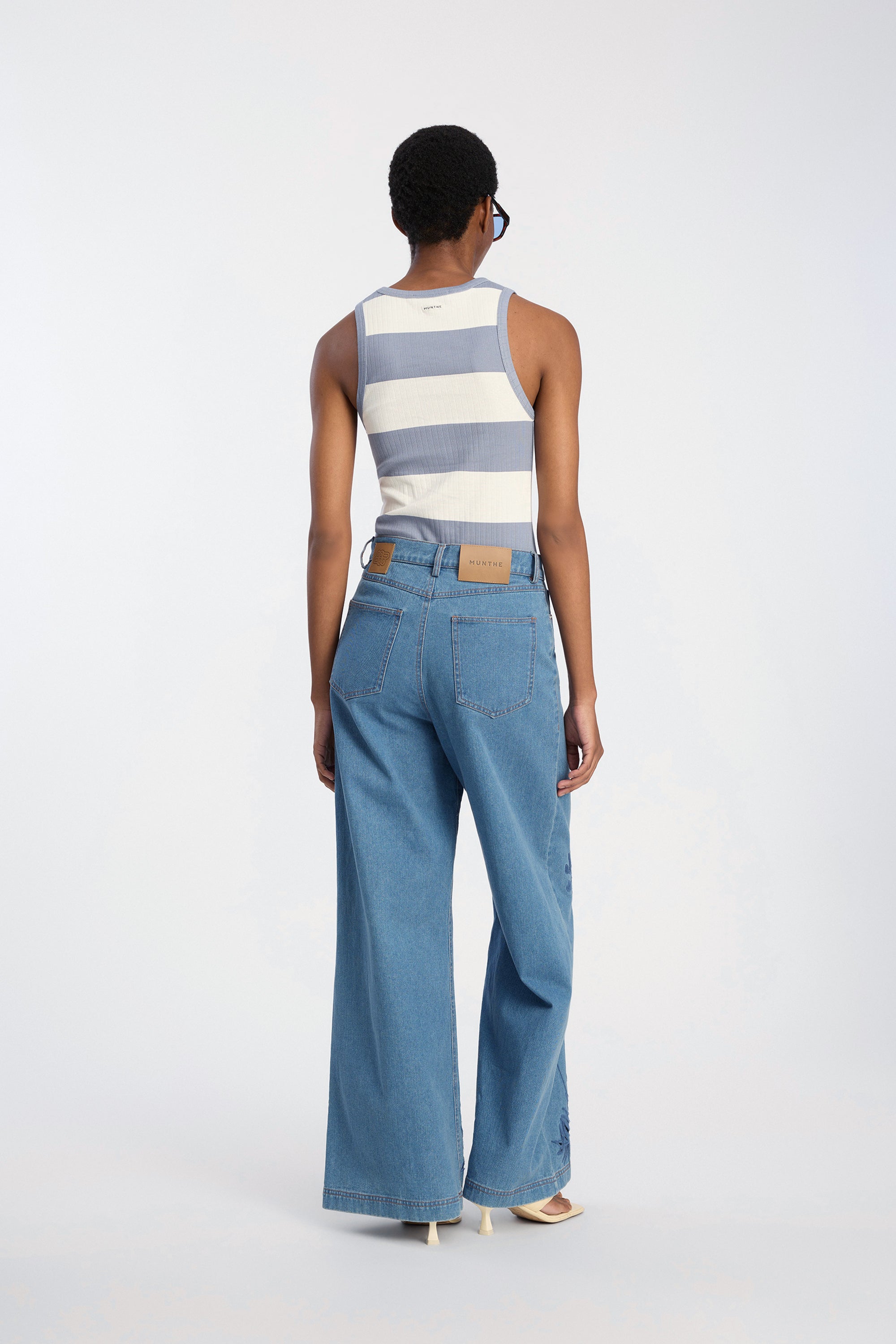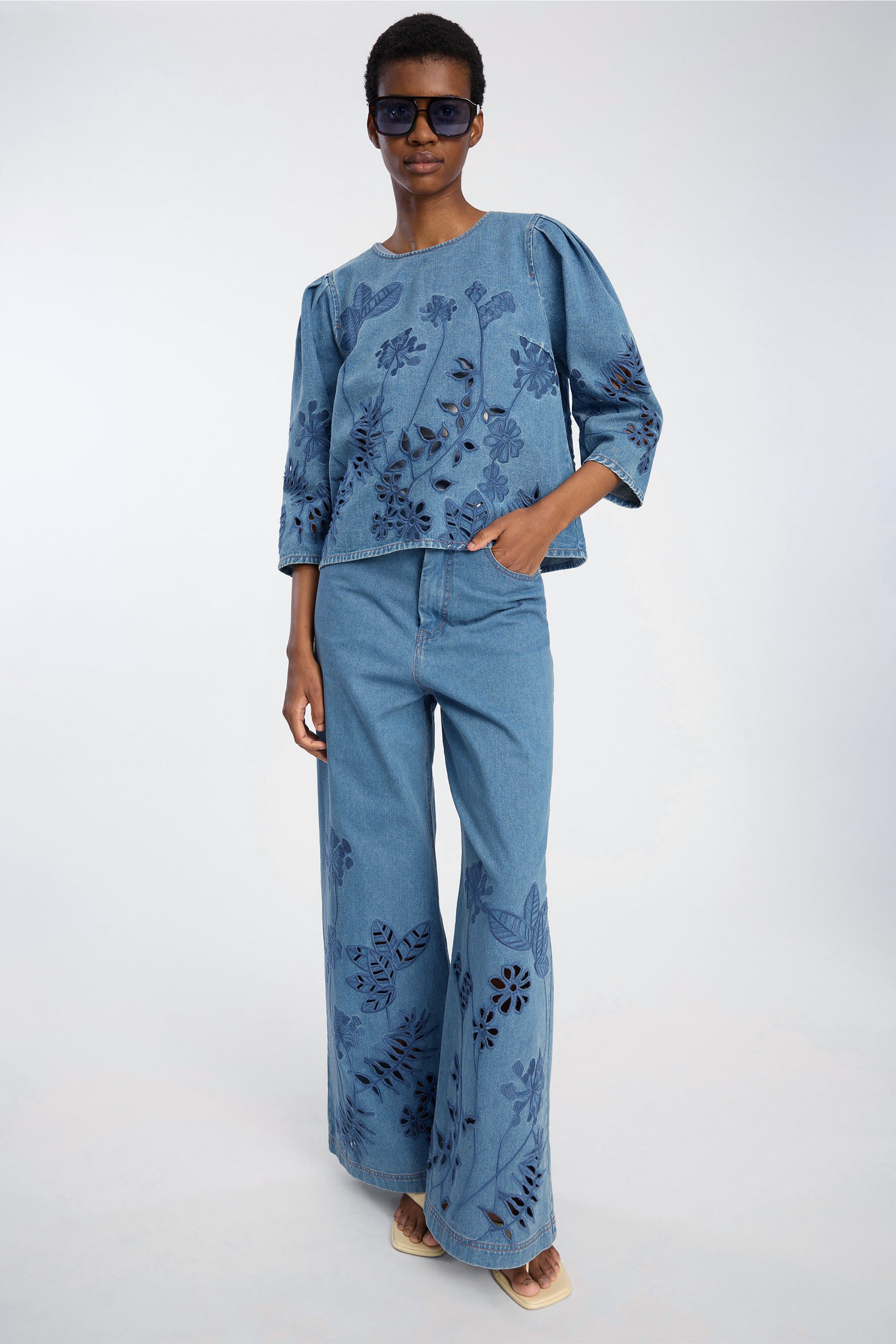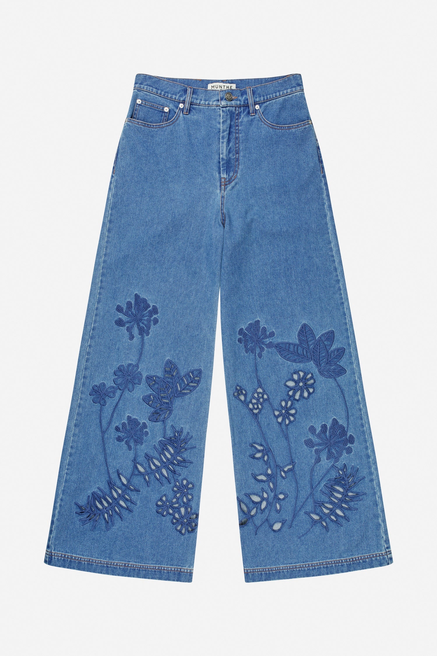 Deze jeans zijn gemaakt van klassiek denim en hebben een brede, rechte pasvorm. Ze zijn afgewerkt met de traditionele vijfzakken, riemlussen en een knoopsluiting. De pijpen zijn versierd met bloemrijke borduursels, wat een artistiek tintje toevoegt en elke dagelijkse garderobe naar een hoger niveau tilt.