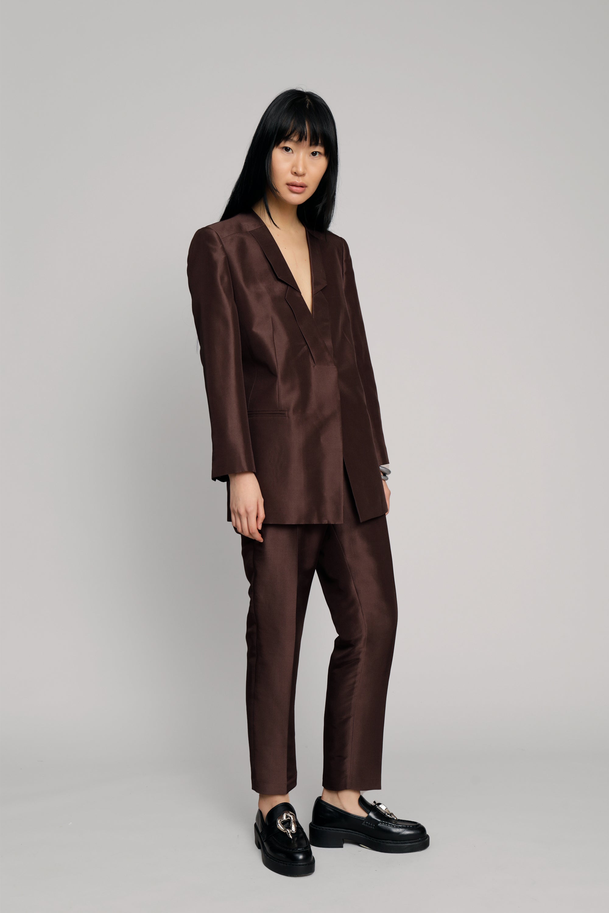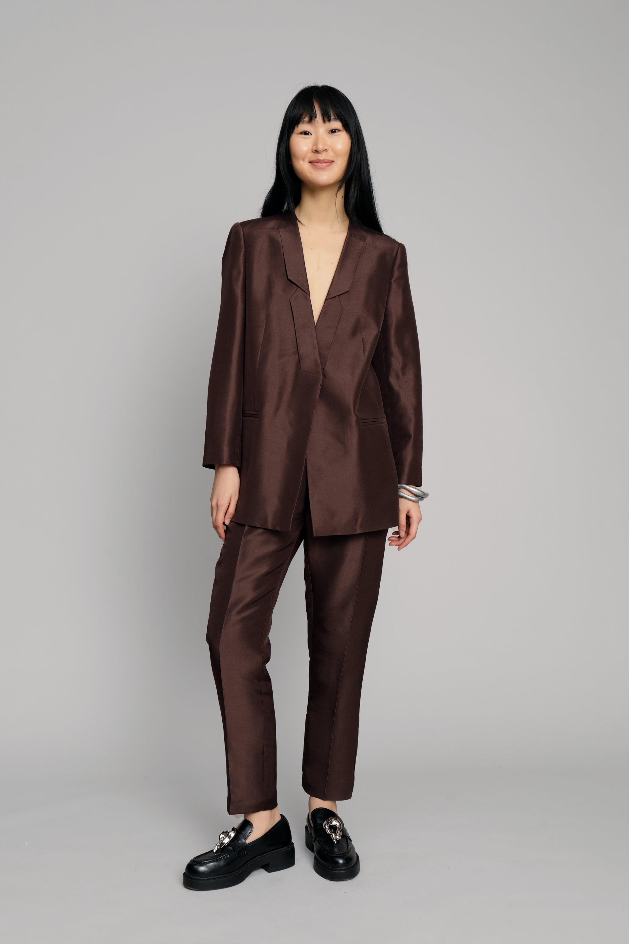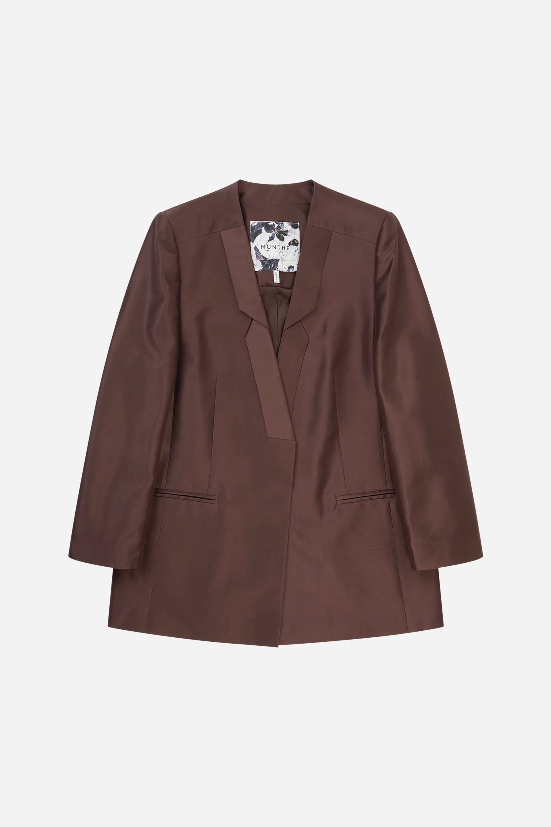 Blazer van 100% zijde, in een normale pasvorm met lange mouwen. De blazer heeft zakken en een prachtig gedetailleerde revers. Verkrijgbaar in de kleur choco.