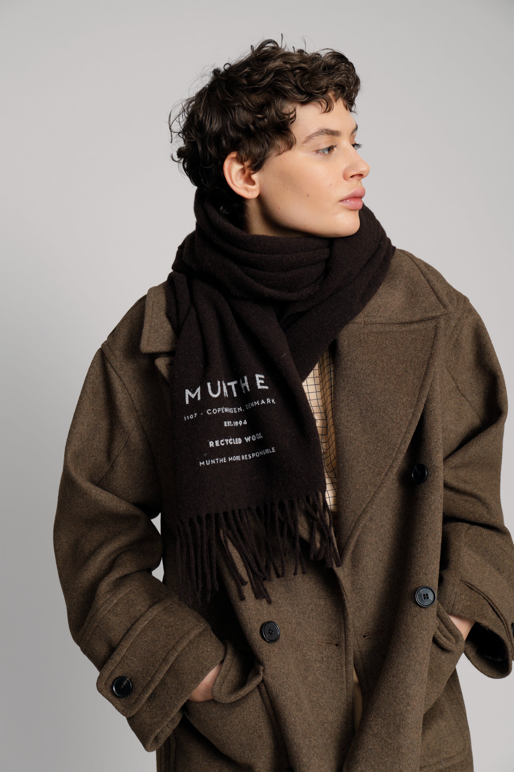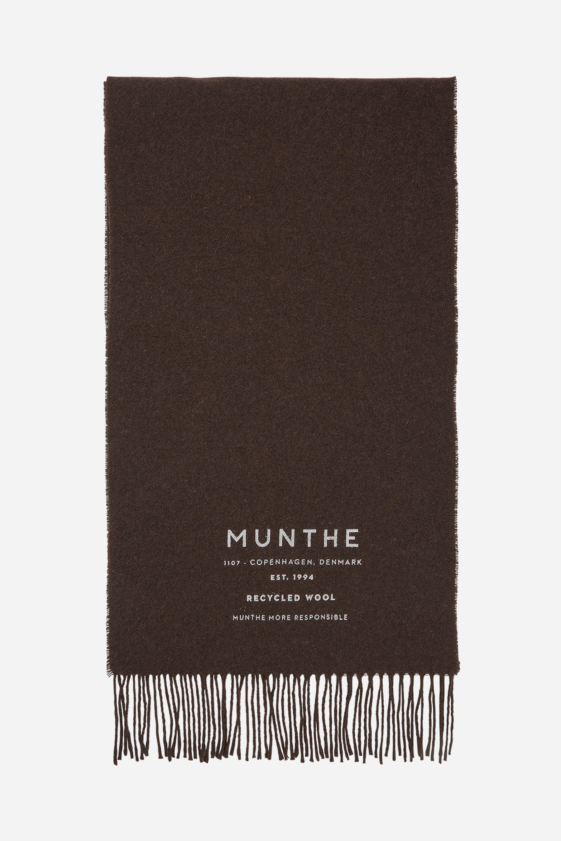 Een zachte sjaal uit een mix van gerecyclede wol. De sjaal heeft een MUNTHE logo en tekst, en een klassiek franje detail aan beide uiteinden van de sjaal. Verkrijgbaar in de kleuren bruin of beige.