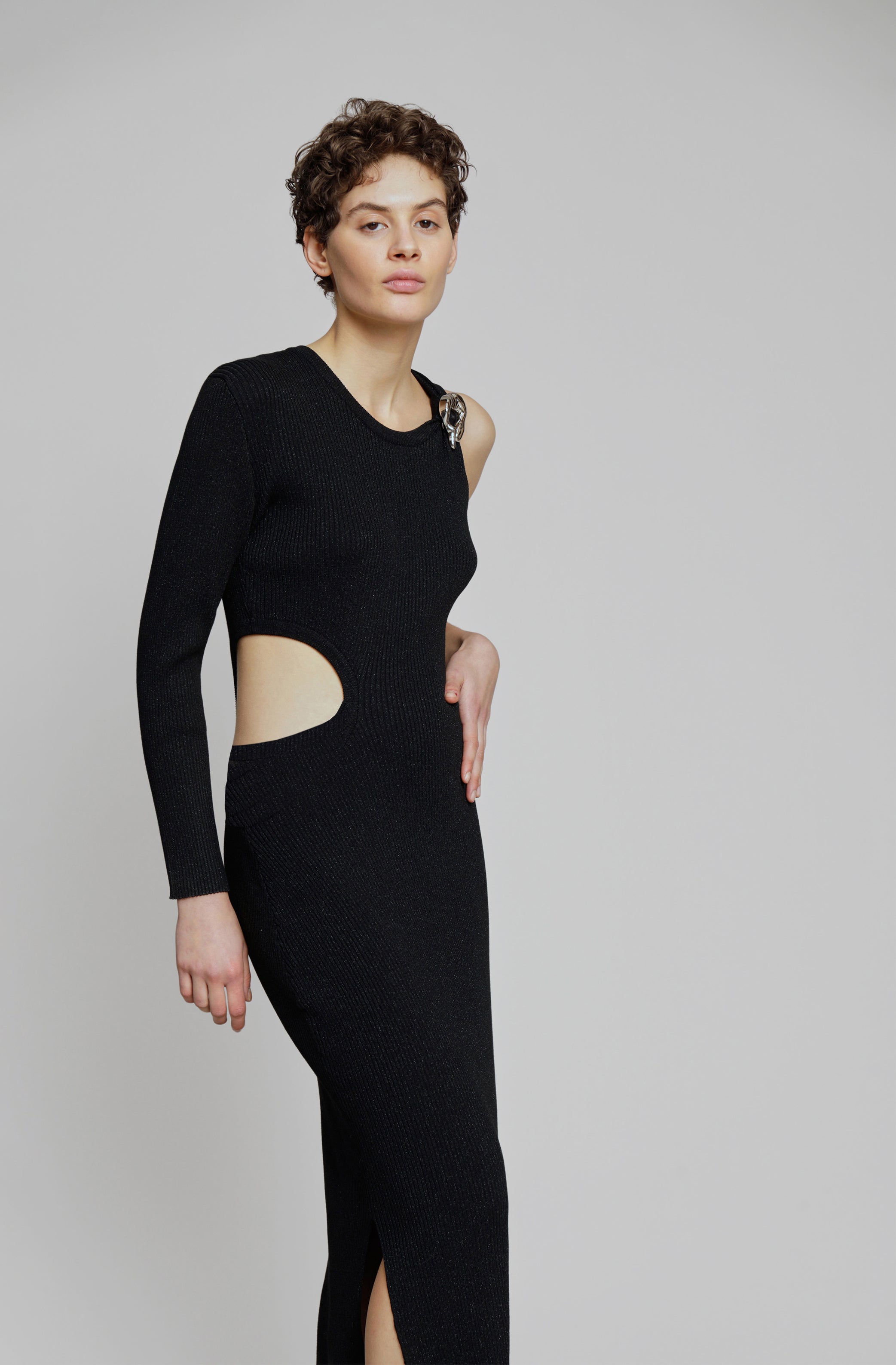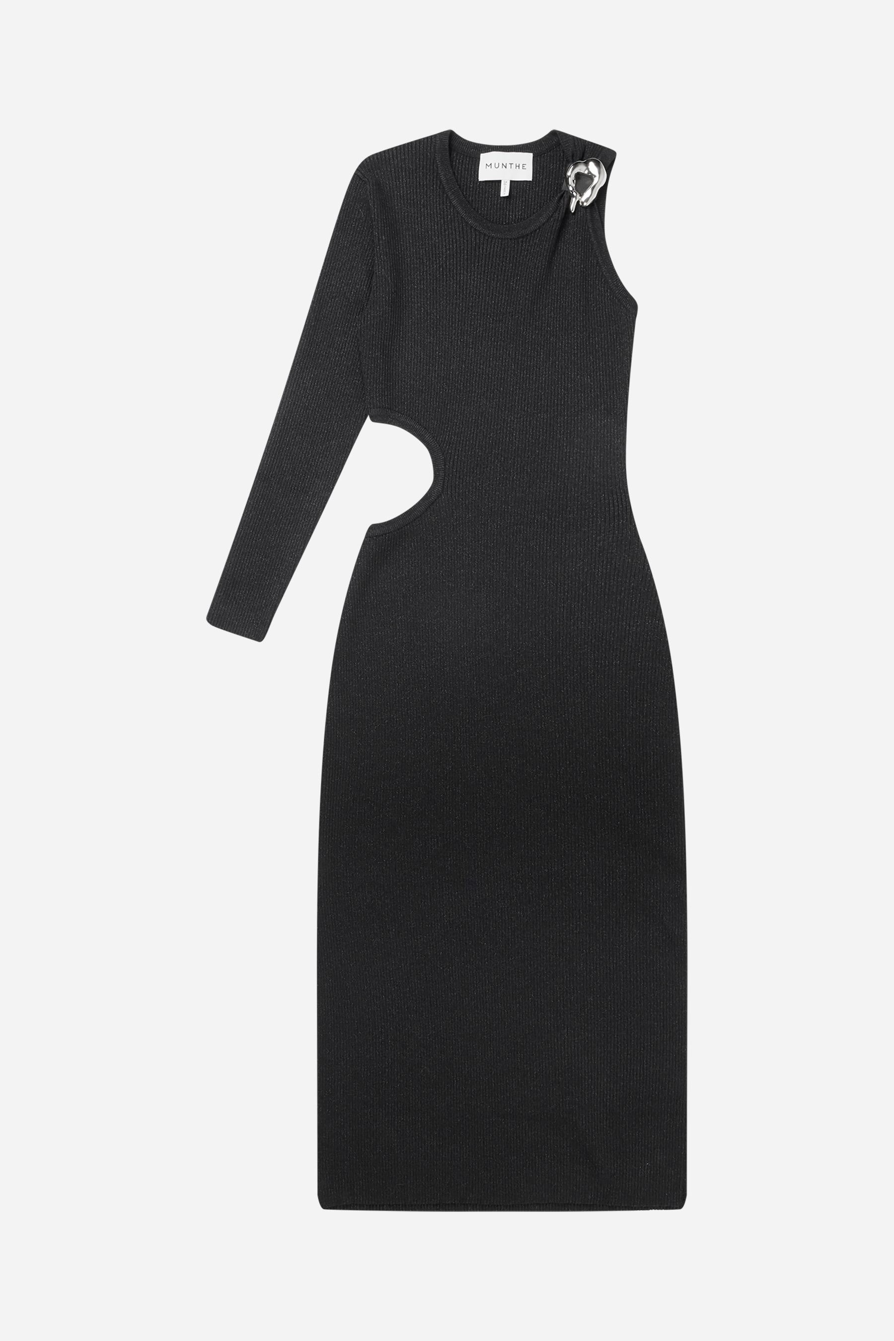 Een getailleerde jurk met een asymmetrische uitsnede en een split aan de zijkant. De jurk heeft een mooie sieradensluiting. Verkrijgbaar in de kleur zwart.