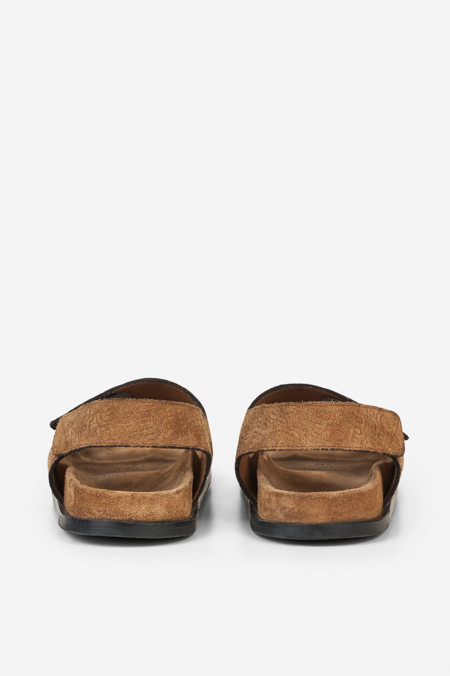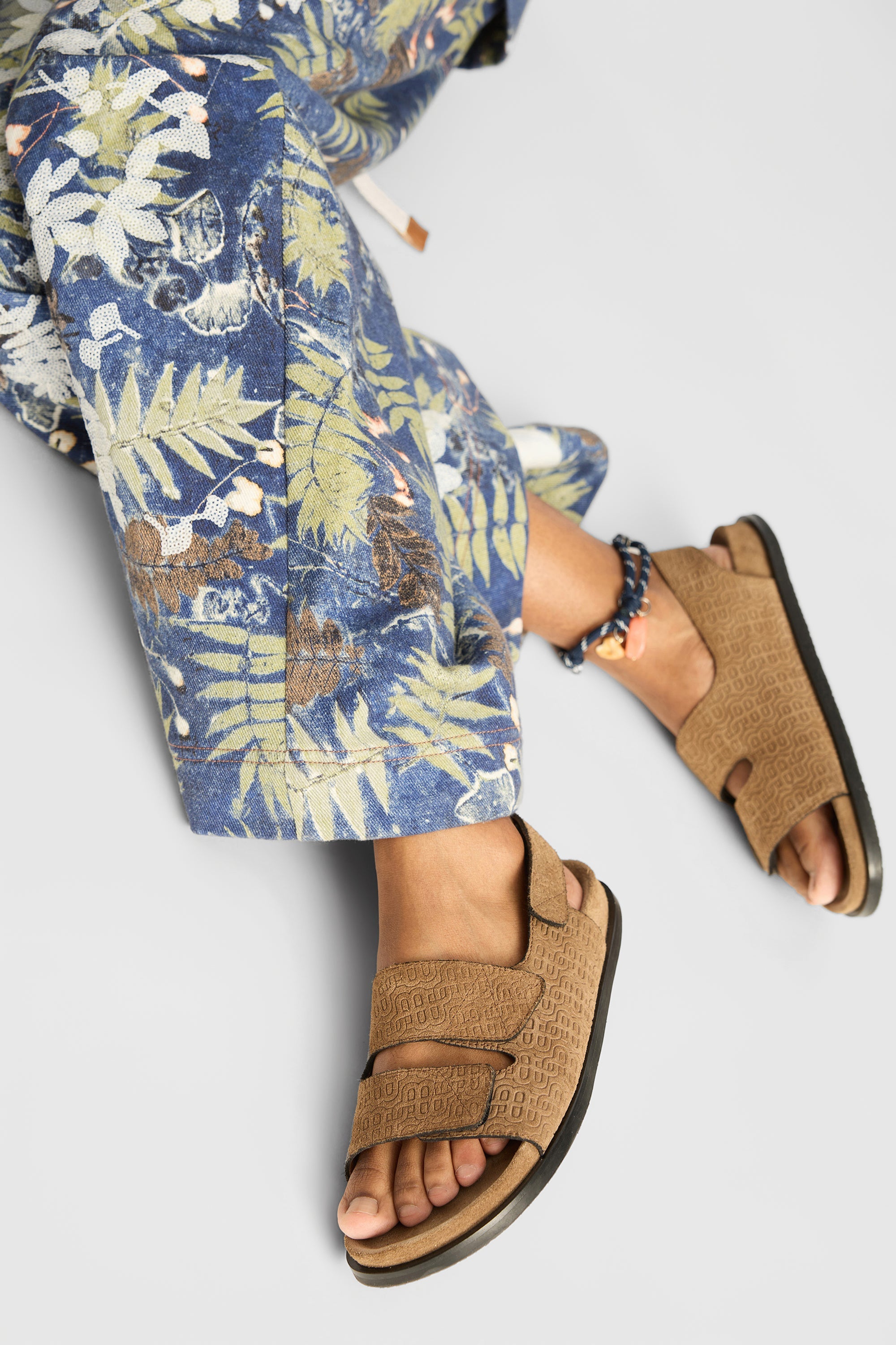 Deze sandalen zijn gemaakt van leer met een geperst patroon en hebben twee verstelbare klittenbandsluitingen. Het ontwerp heeft een zachte, gevormde voetbed en een lichte, flexibele zool.
