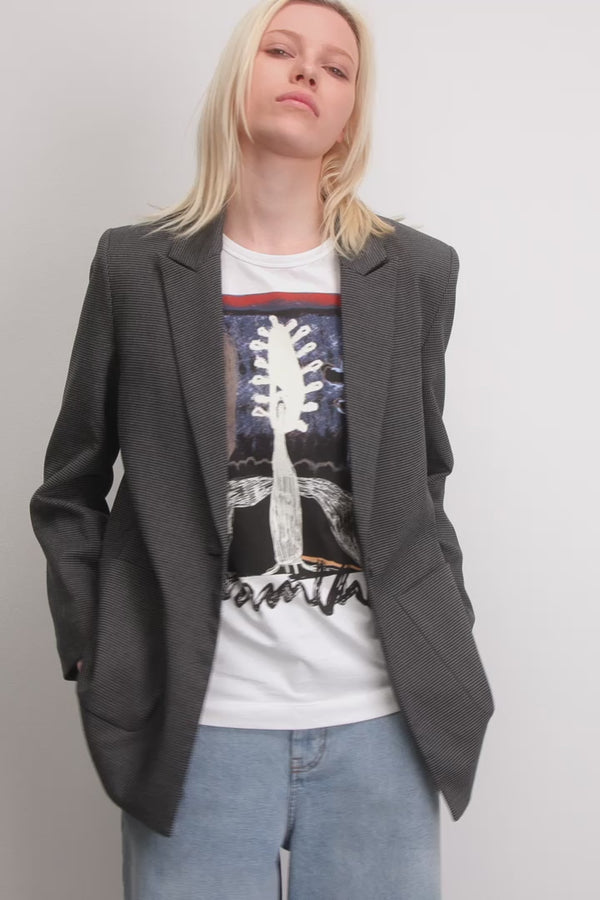 T-shirt met een mooie MUNTHE kunstprint. Dit T-shirt heeft korte mouwen, een ronde halslijn en is gemaakt van 100% biologisch katoen. Het model is 179 cm lang en draagt maat 36. Wasvoorschrift: Was je T-shirt voorzichtig in de wasmachine. Gebruik een fijnwasprogramma op maximaal 30 graden Celsius. Vermijd wassen op 40 graden om de integriteit van ons gecertificeerde biologische katoen te behouden. We hanteren een strikt beleid voor het gebruik van chemicaliën tijdens het drukproces. Door de wasvoorschriften te volgen, blijven de prints levendig en duurzaam en behoudt je kledingstuk zijn kwaliteit.