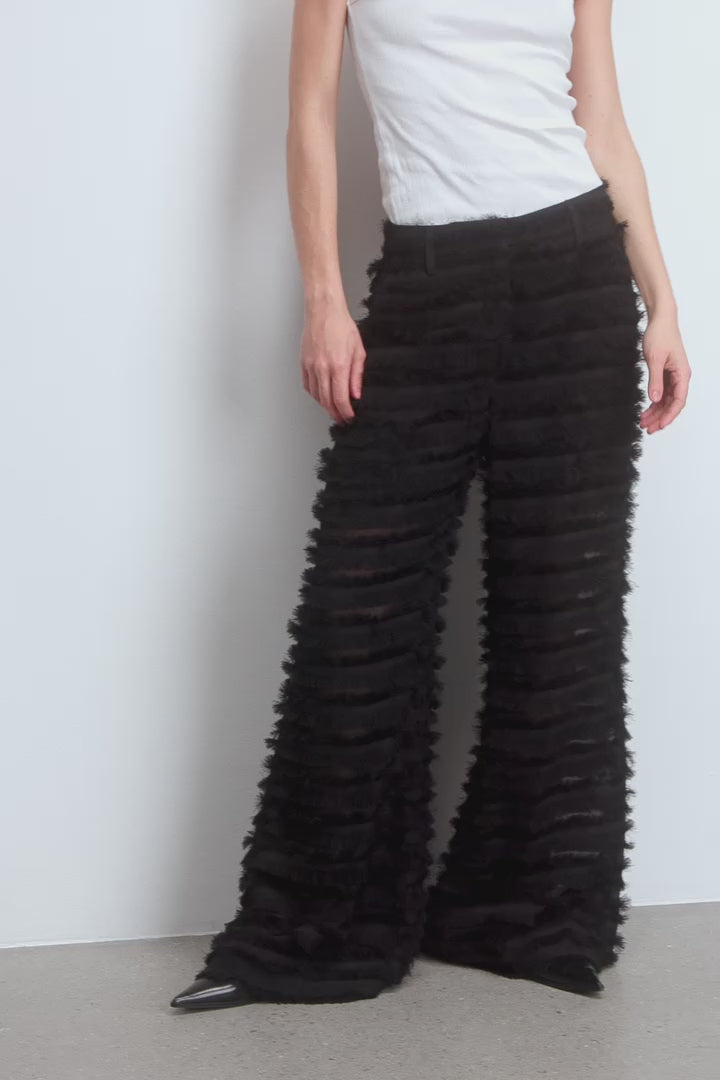 Licht transparante broek met prachtige, delicate franjes. De broek heeft een ritsluiting en is ontworpen met zakken, riemlussen en wijde pijpen.