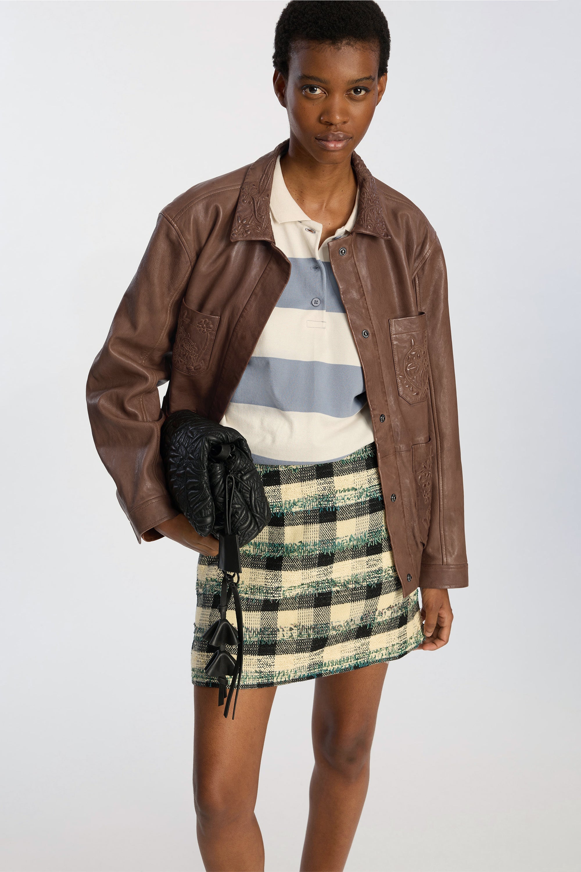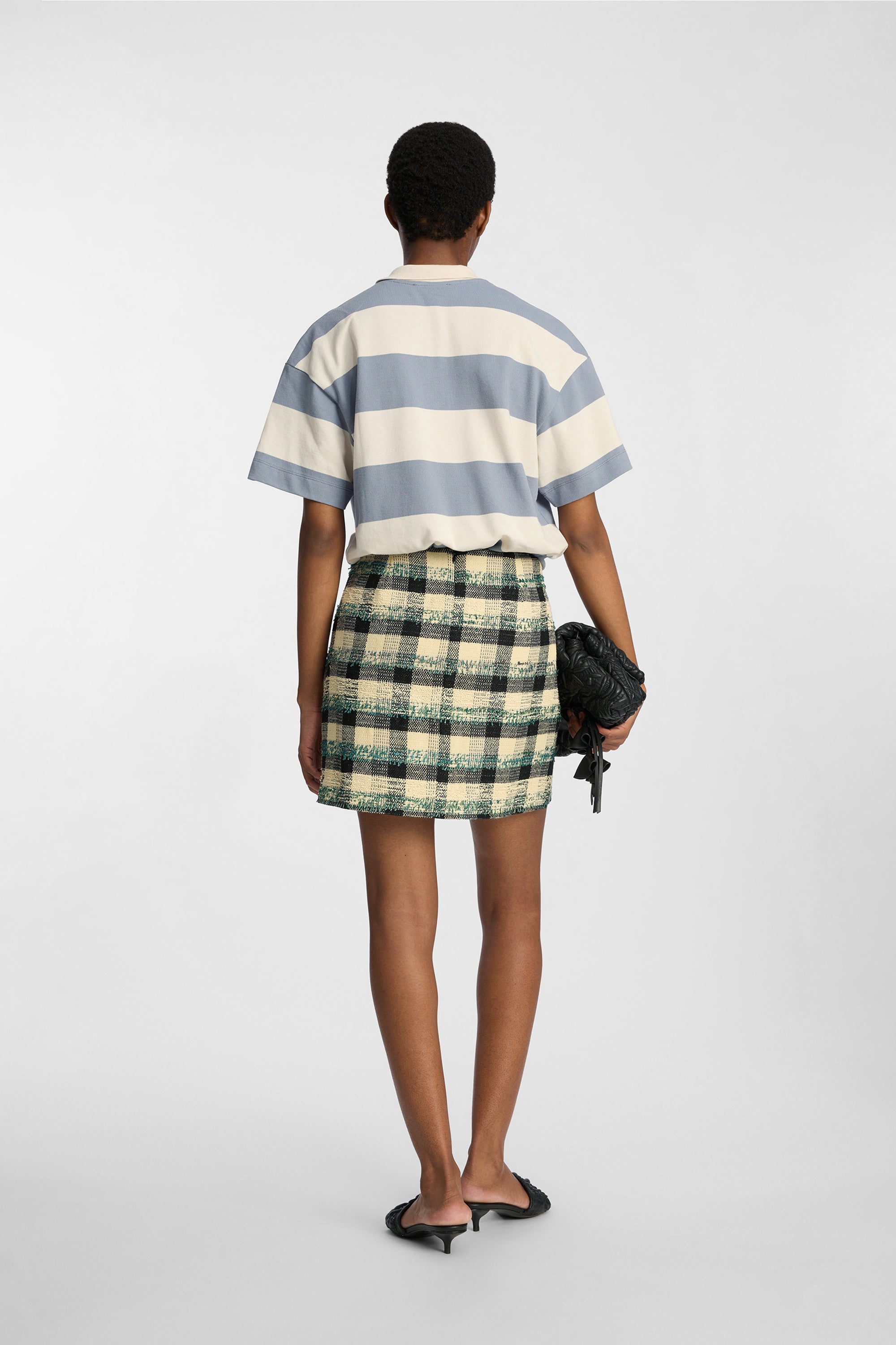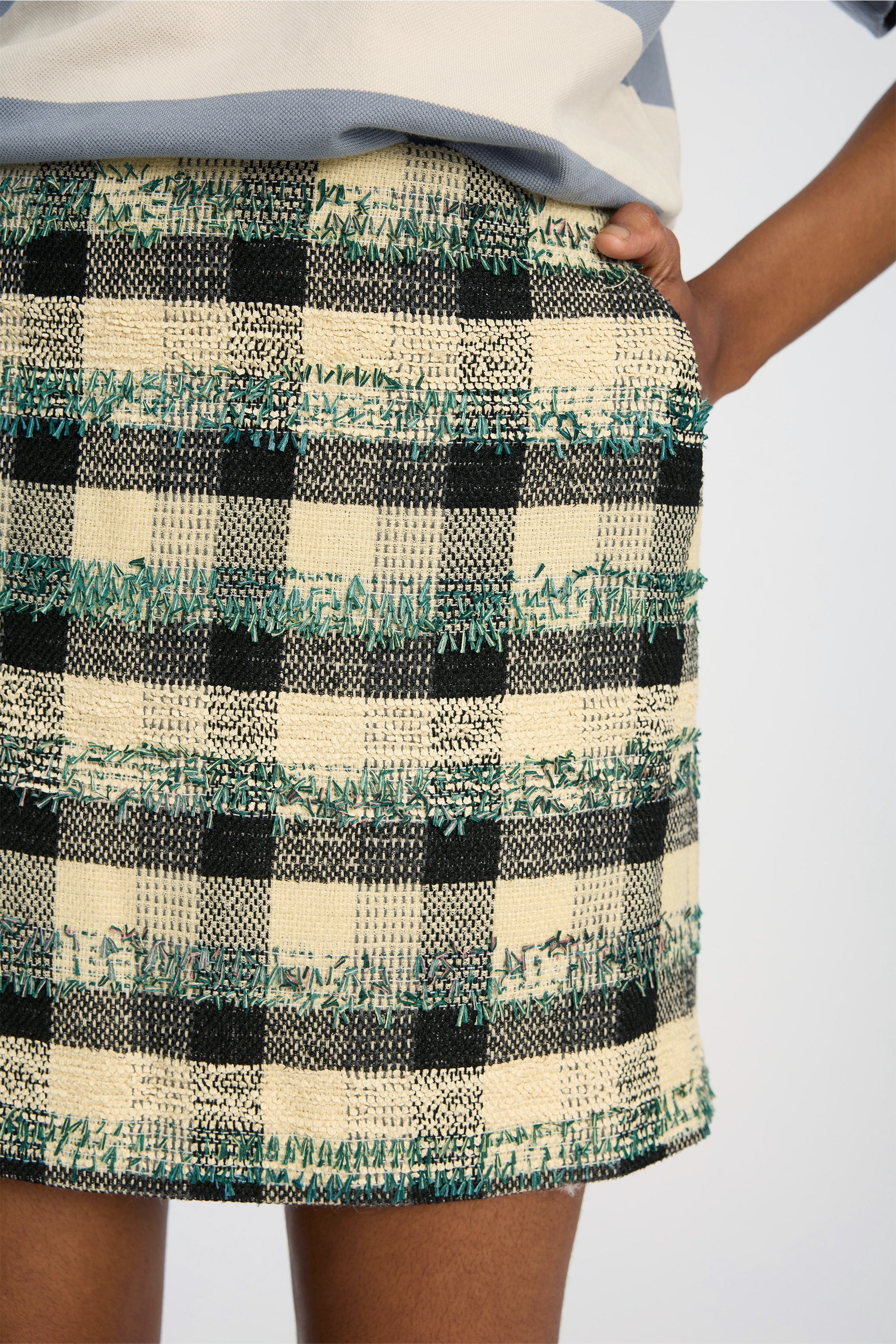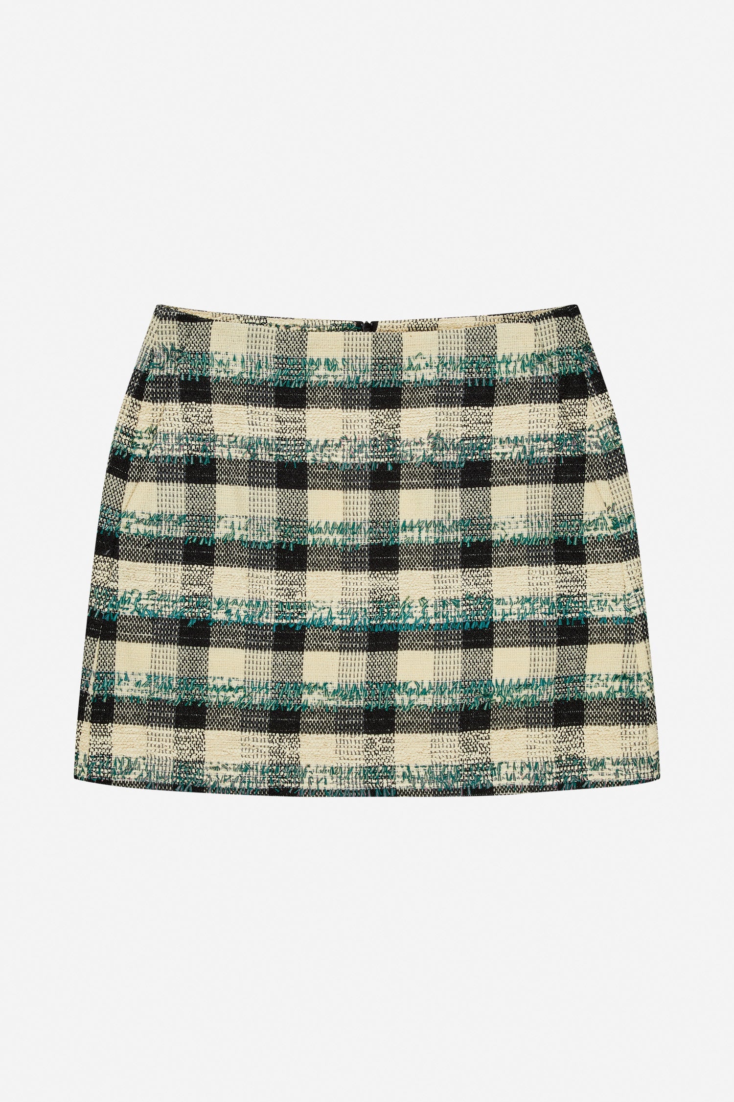 Deze rok is gemaakt van een gestructureerd geweven materiaal met een meerkleurig ruitpatroon. Het ontwerp heeft een korte, rechte pasvorm en een strakke tailleband voor een scherp, modern uiterlijk.