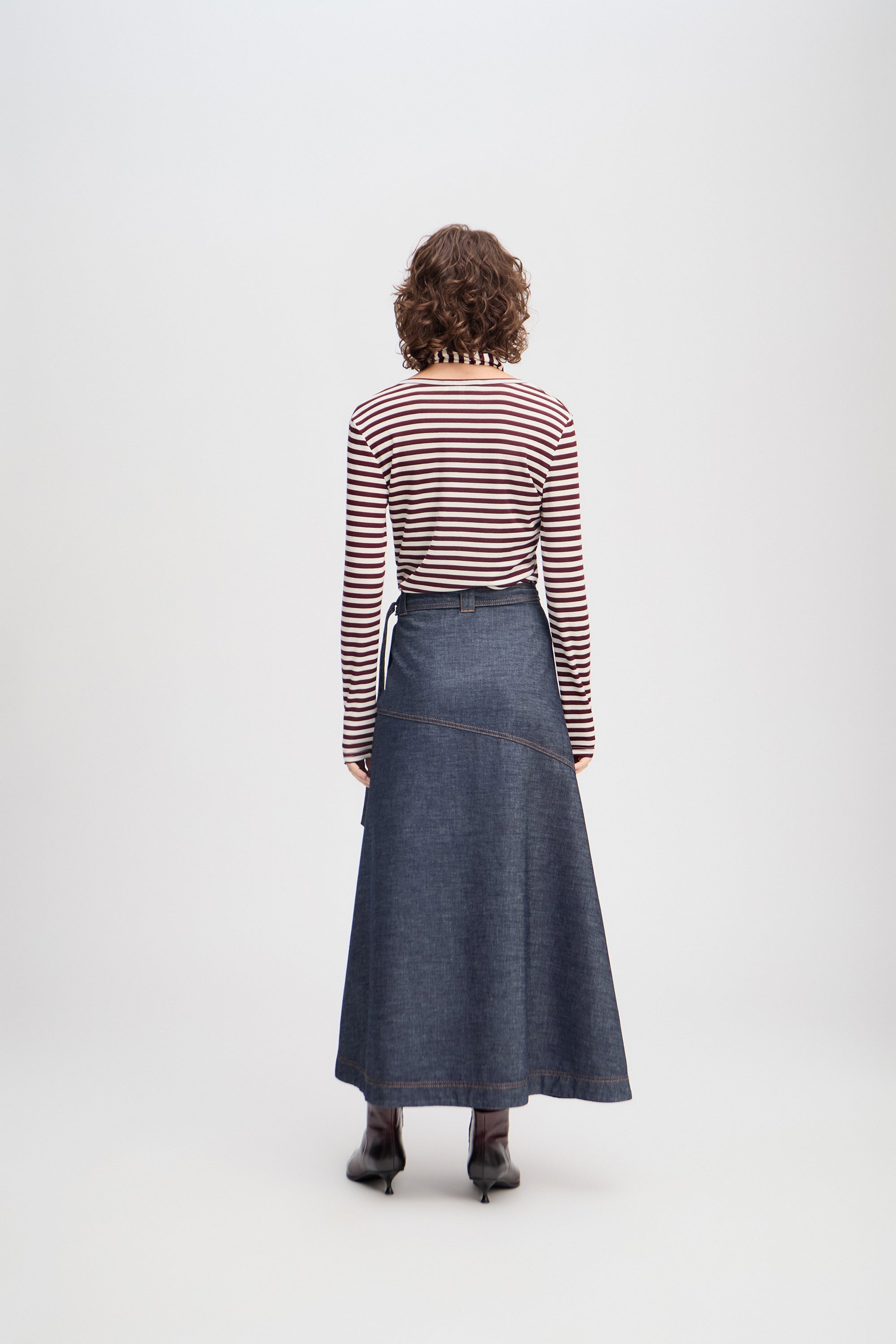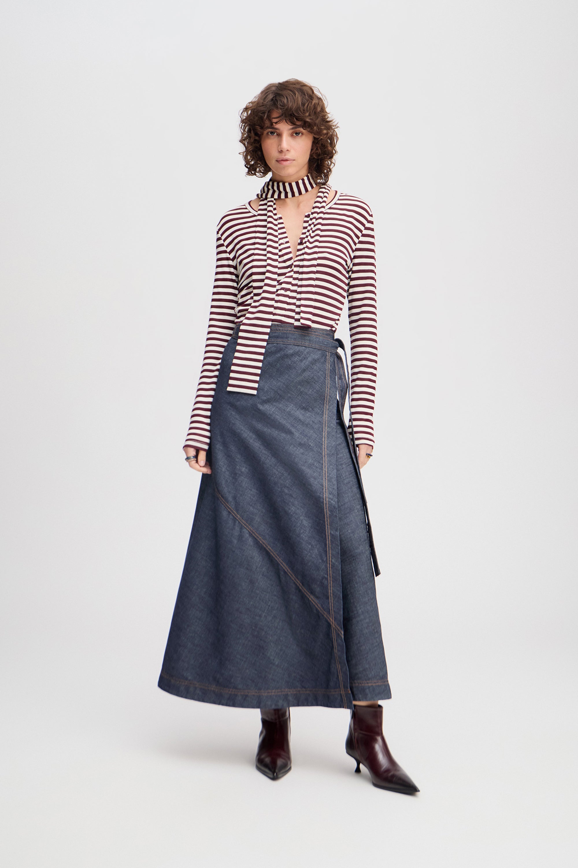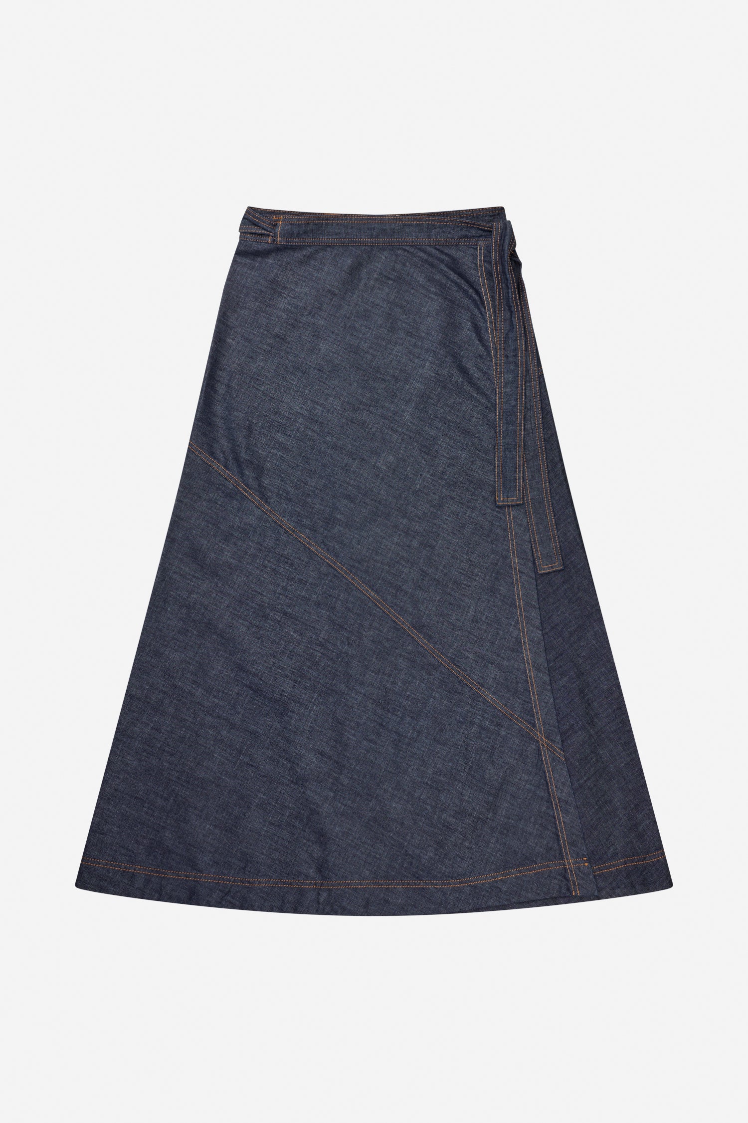 Denim wikkelrok met elegante, subtiele diagonale stiknaden. De rok heeft een normale pasvorm en kan in de taille worden gestrikt.
