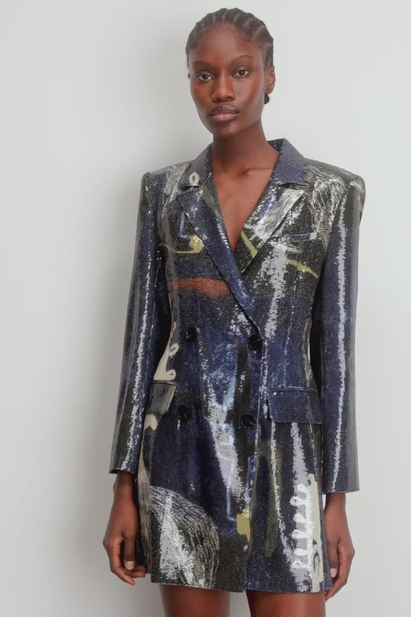 Lange, elegante blazer met een mooie all-over paillettenprint. Deze blazer is ontworpen met een slim fit, rechte schouders, lange mouwen en een dubbelrijige sluiting.