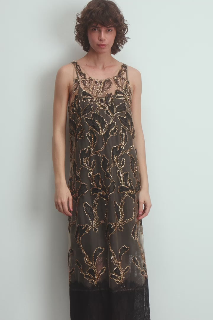 Jurk met een mooie all-over gouden bloemenapplicatie, een subtiele split aan de zijkant en een elegante brede kanten afwerking aan de onderkant. Deze veelzijdige jurk kan zowel met als zonder onderjurk gedragen worden.