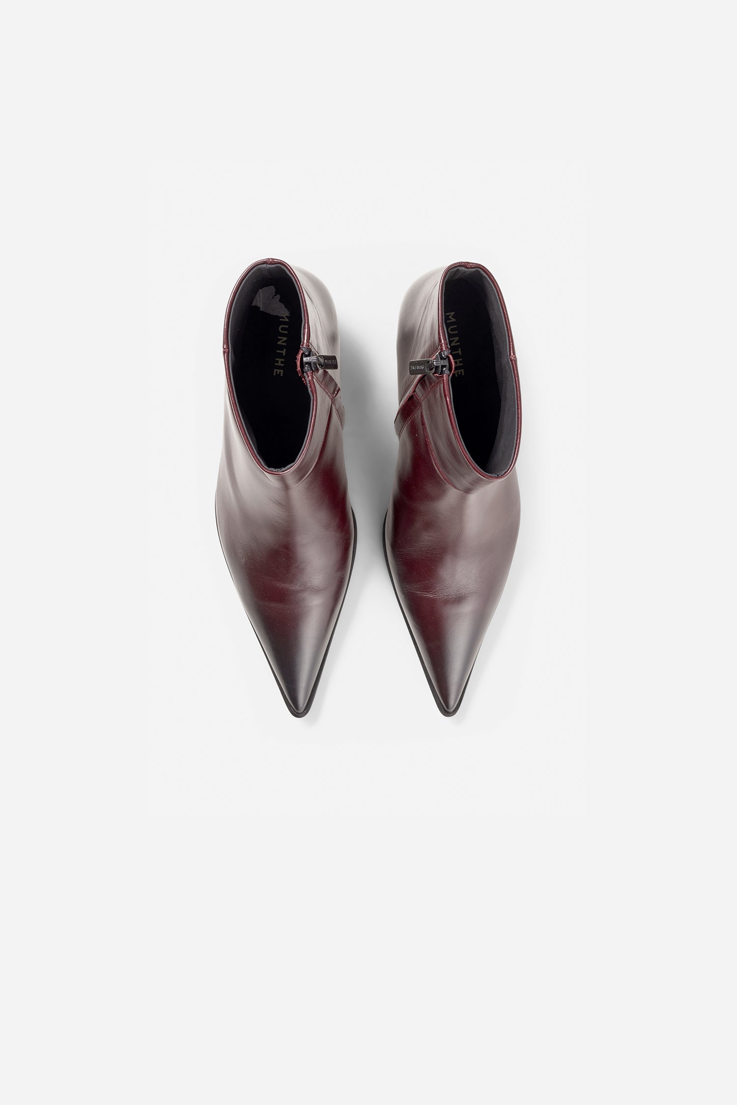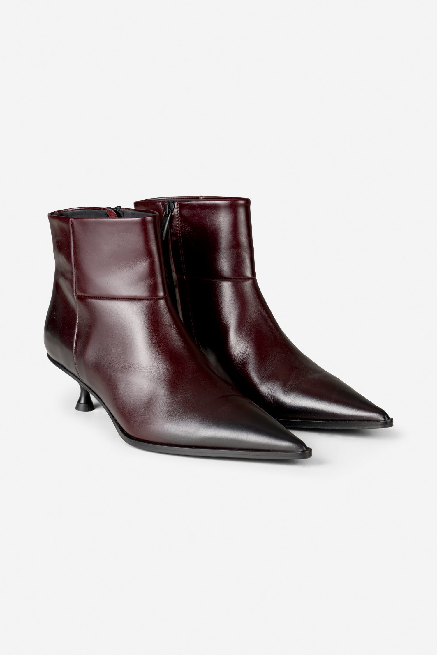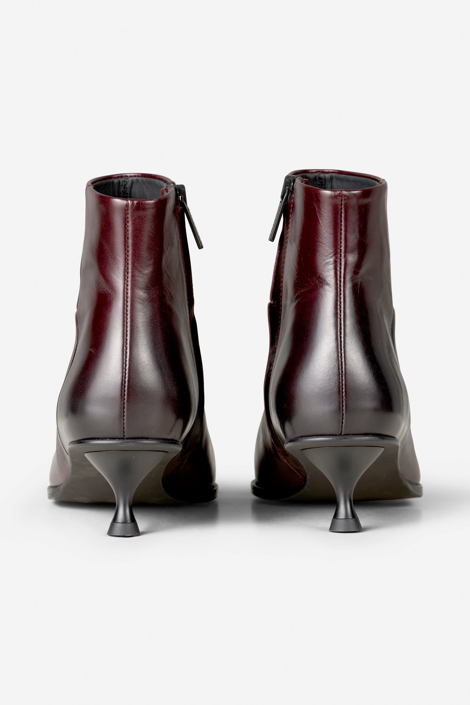 Een mooie leren laars met een spitse neus en een lage hak. De laars heeft een mooie bordeauxrode tint die overloopt in een donkerdere kleur bij de neus en de hiel. De schoen sluit met een rits aan de zijkant.