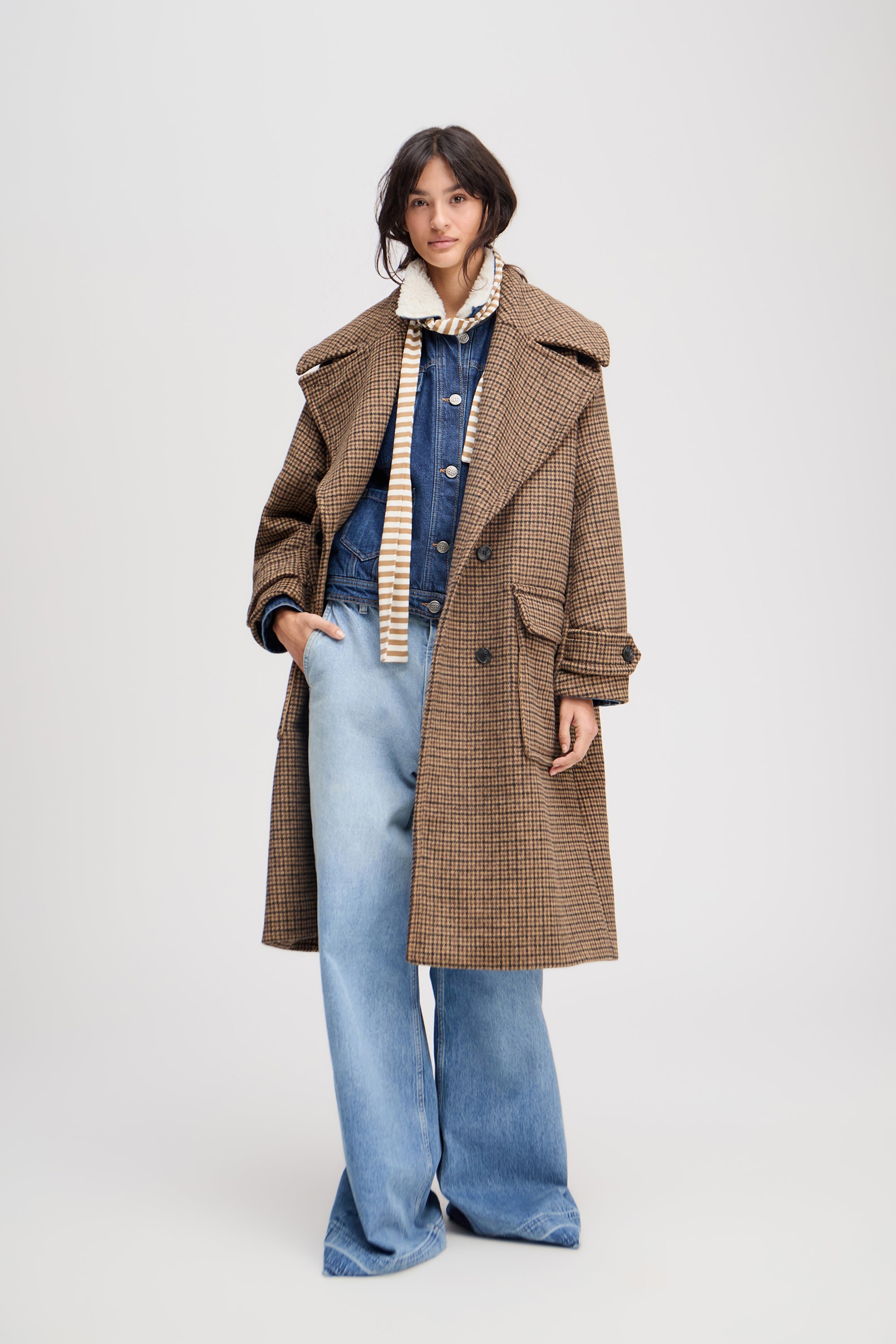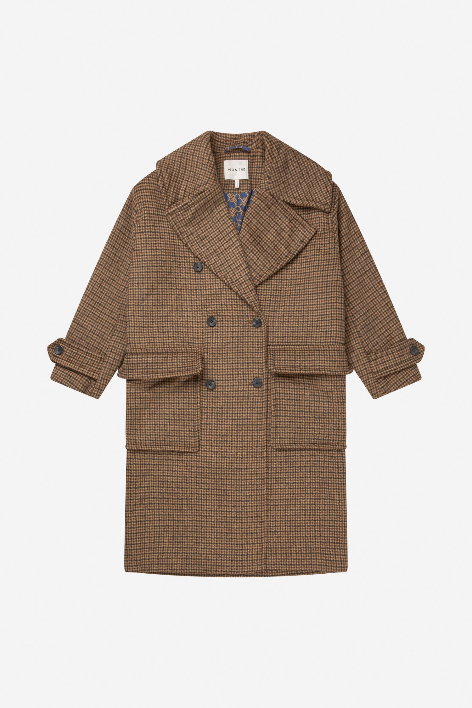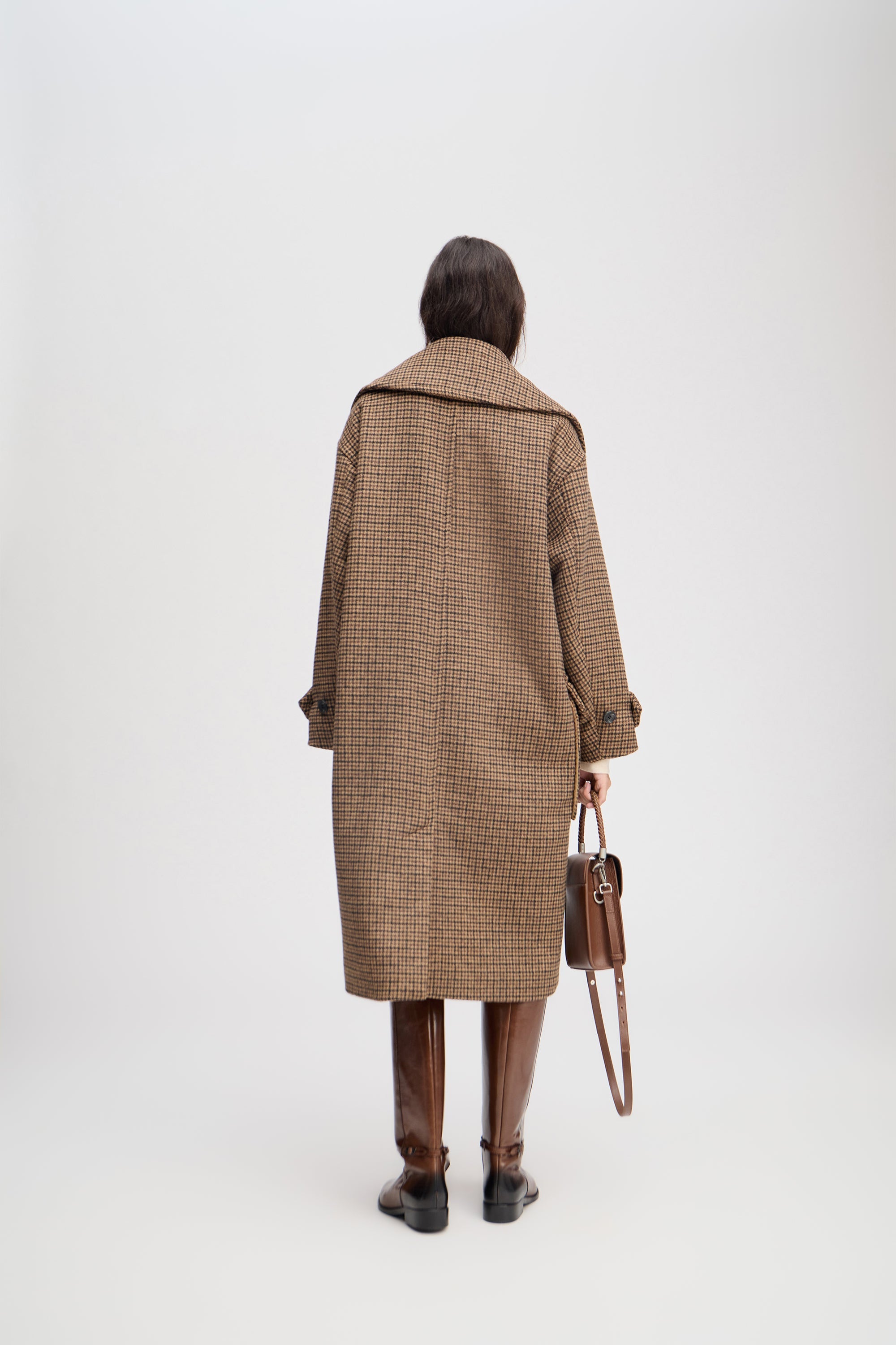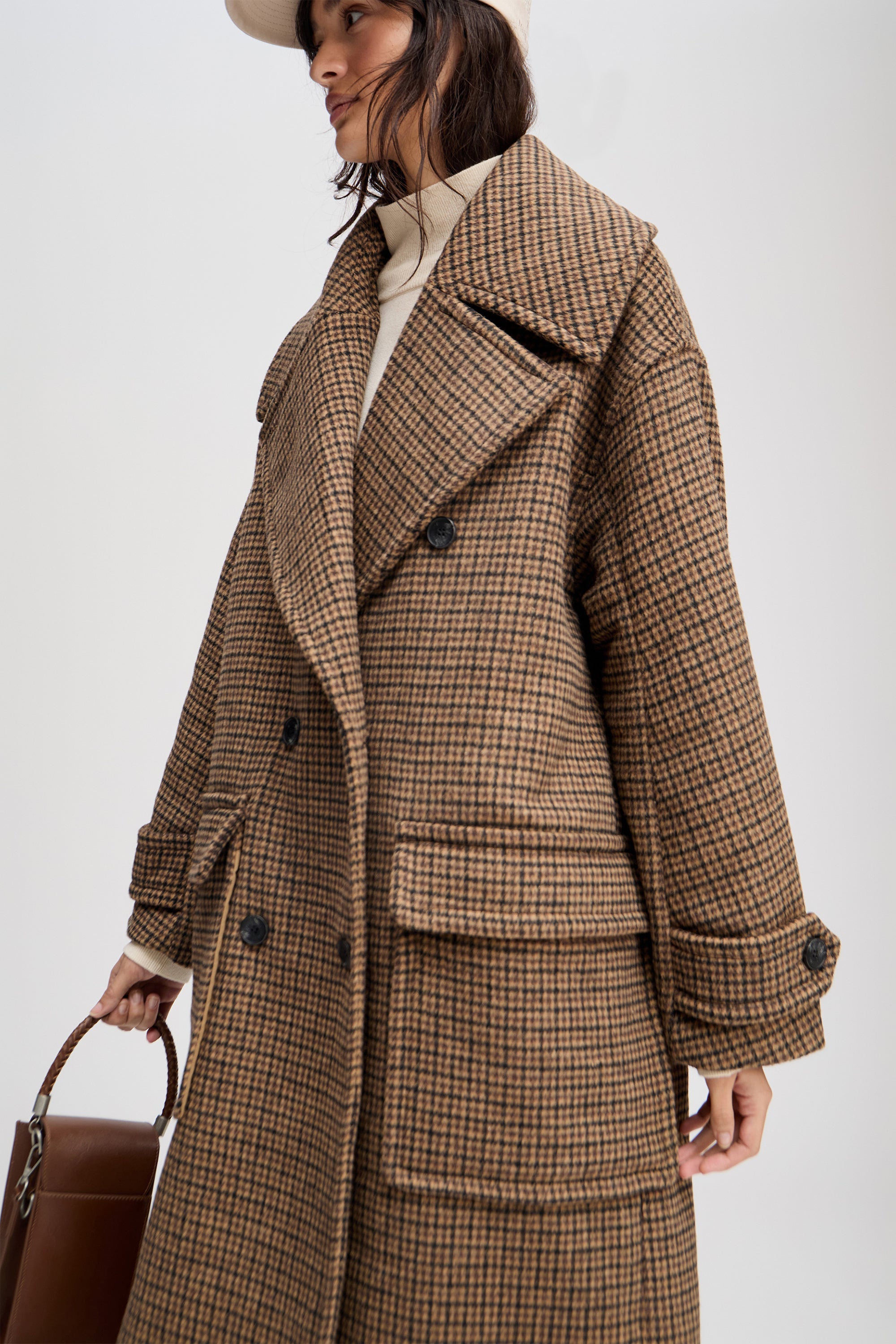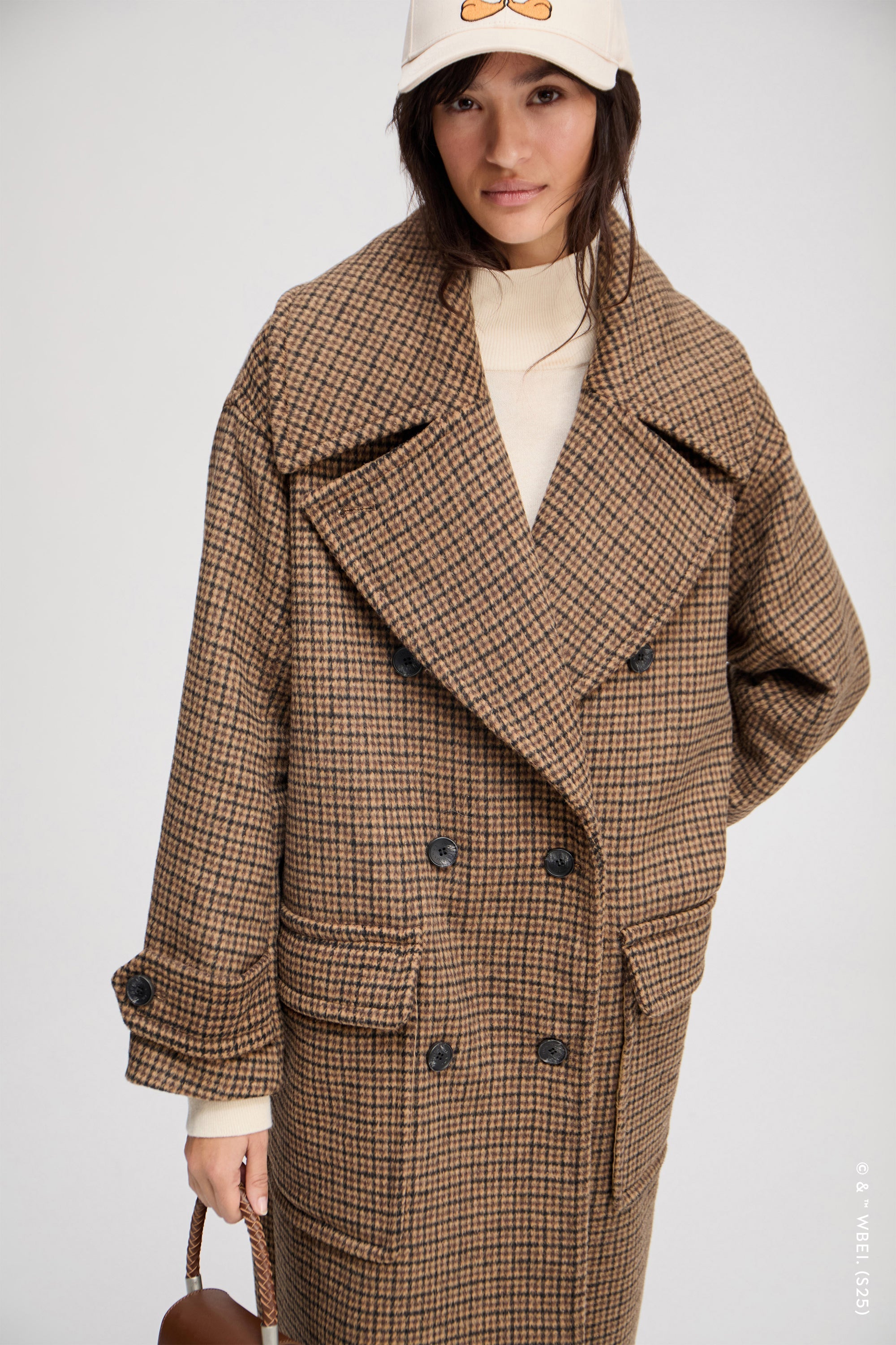 Geruite jas met elegante, oversized zijzakken en een dubbelrijige knoopsluiting. De jas is ontworpen met een prachtige, brede kraag.