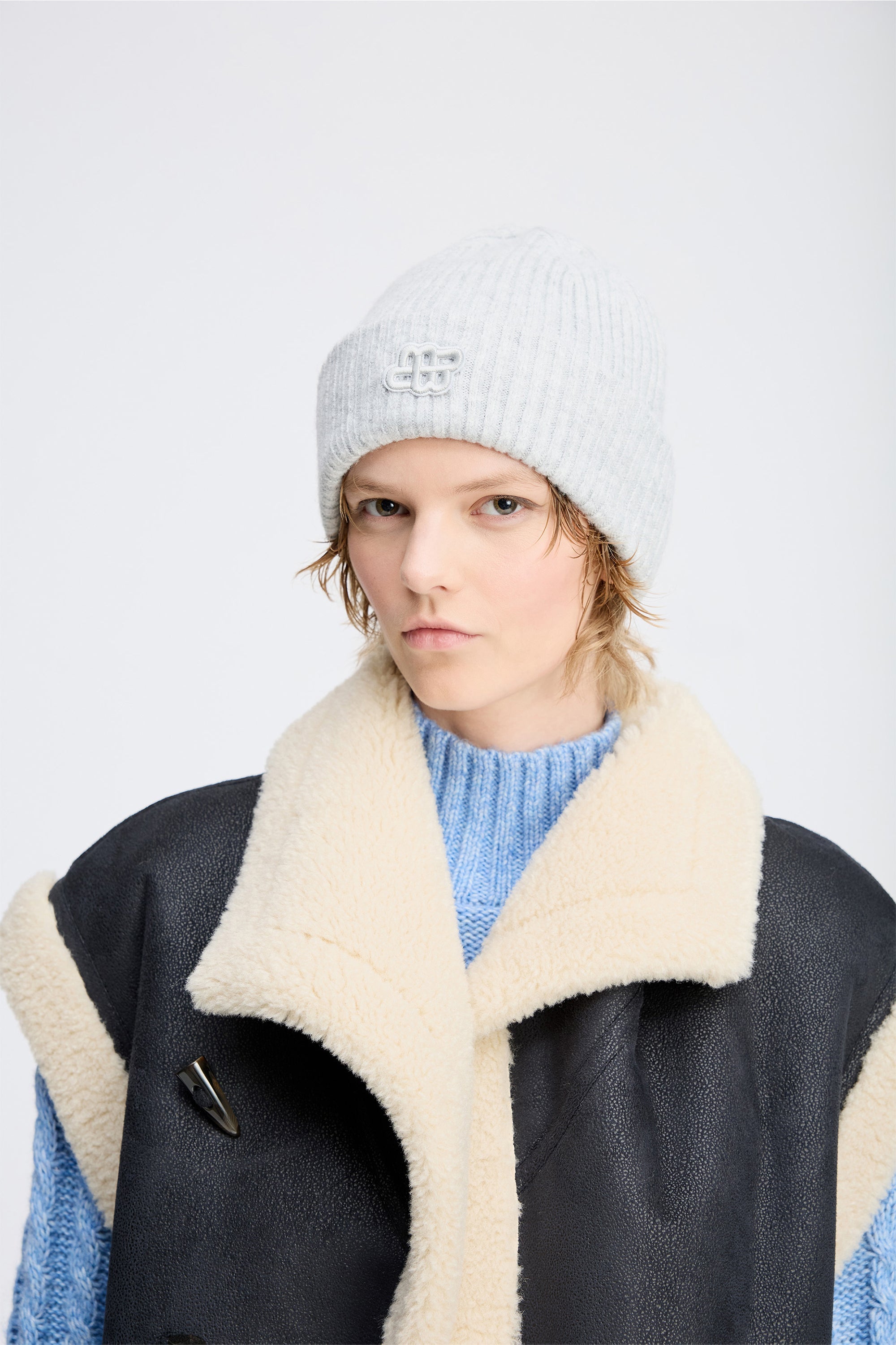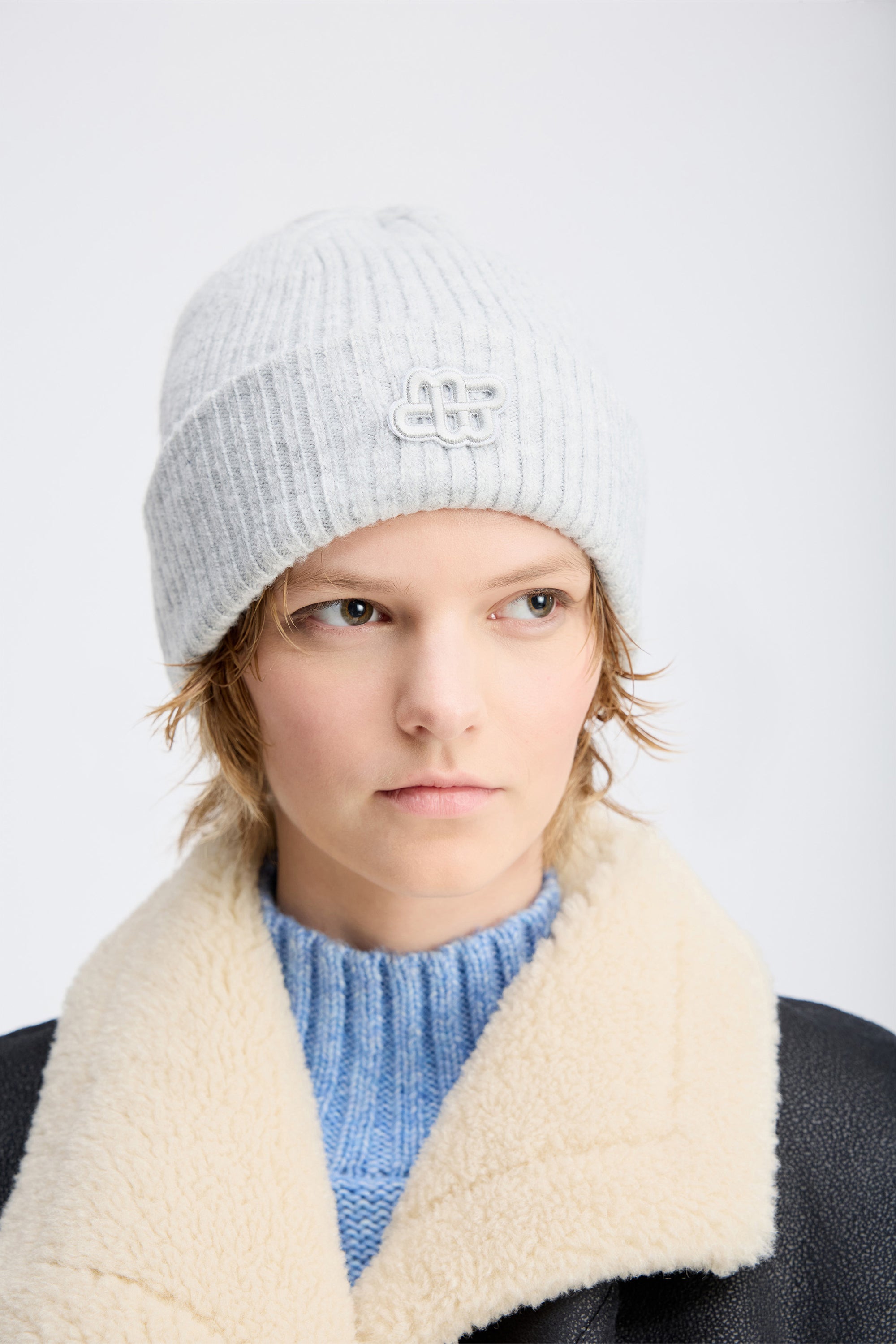 Een mooie geribde gebreide muts met een elegant MUNTHE-embleem aan de voorkant. Gemaakt van een zachte gerecyclede polyesterblend