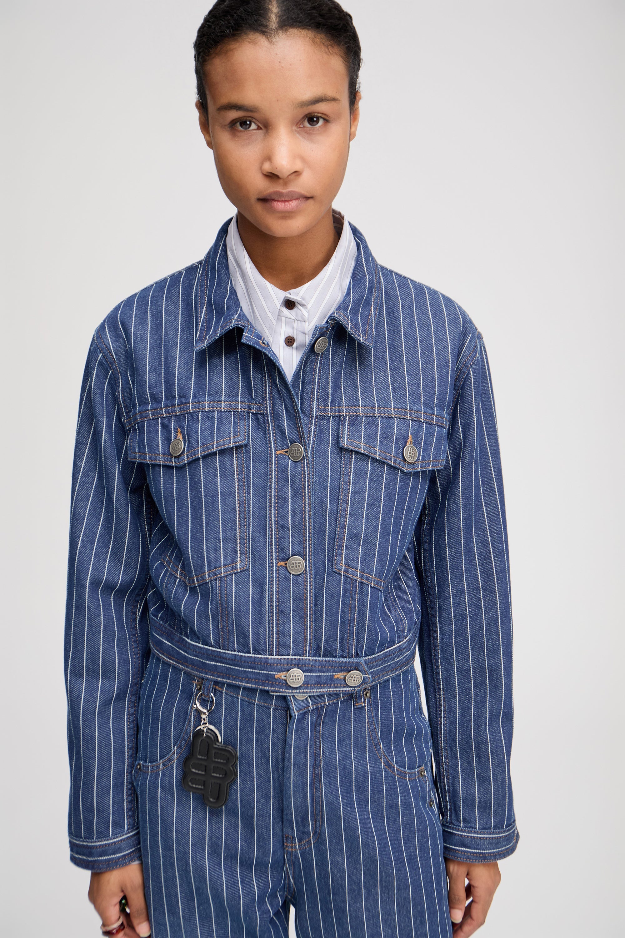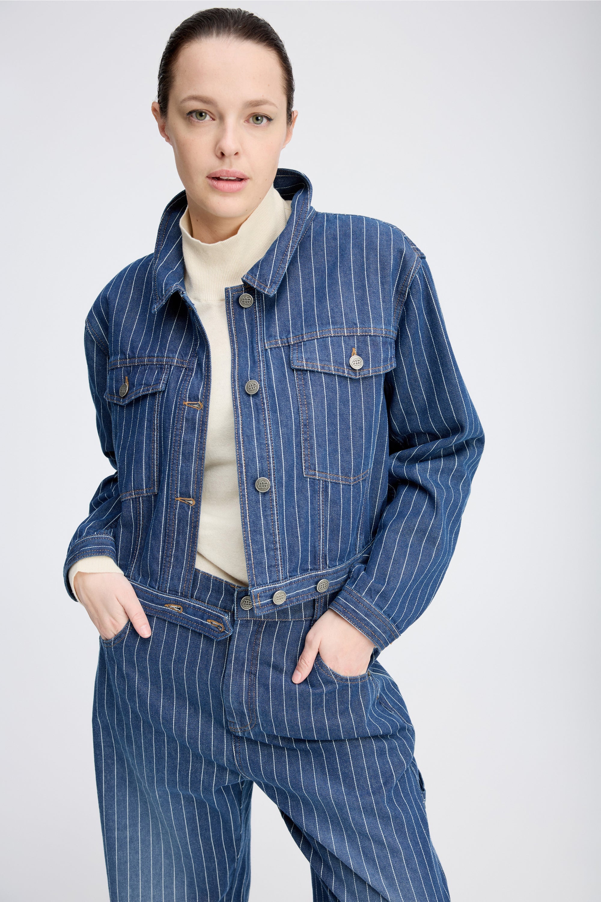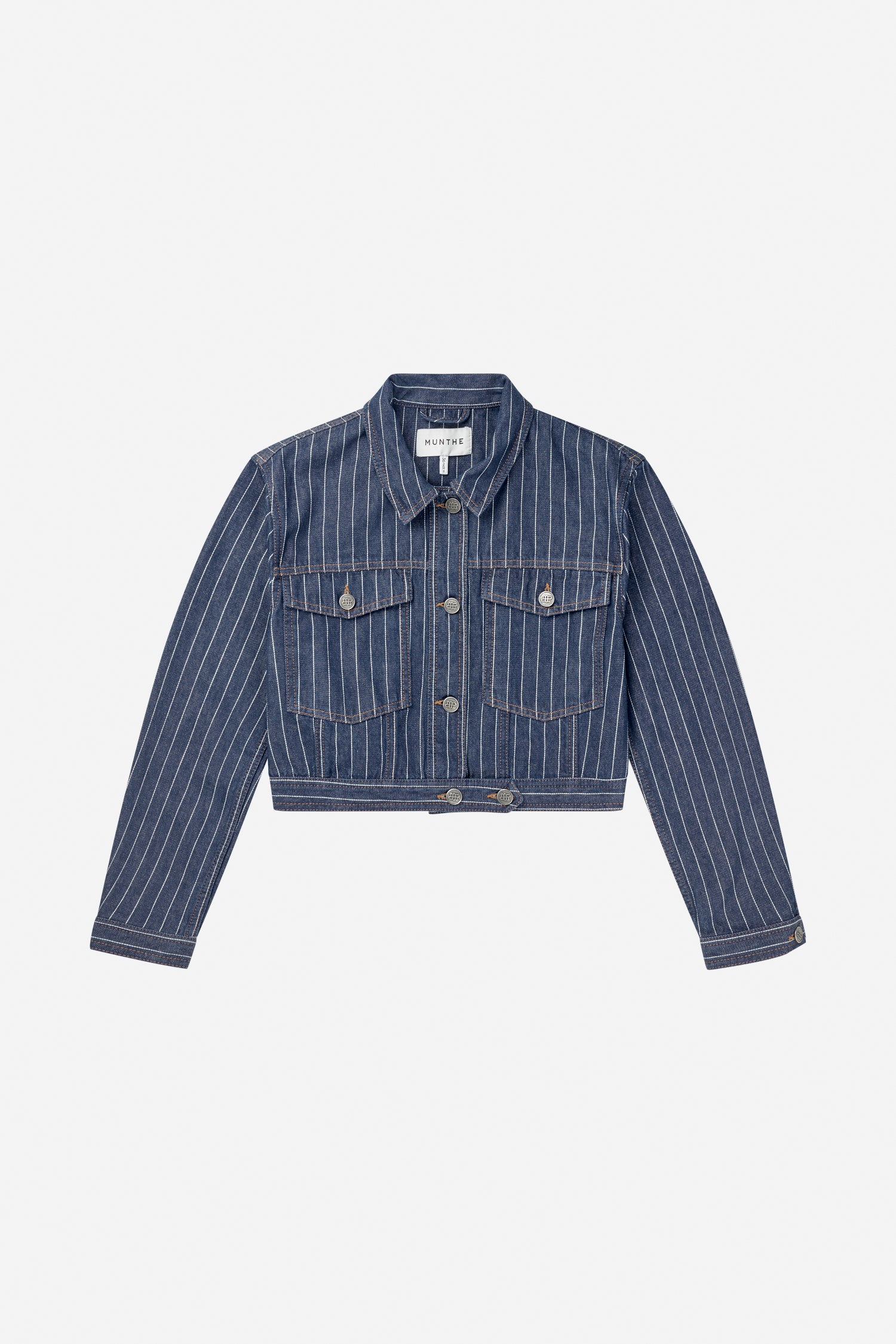 Kort denim jasje met krijtstrepen en verfijnde knopen met het MUNTHE-embleem. Het jasje is ontworpen met zakken, lange mouwen en is gemaakt van biologisch katoen.