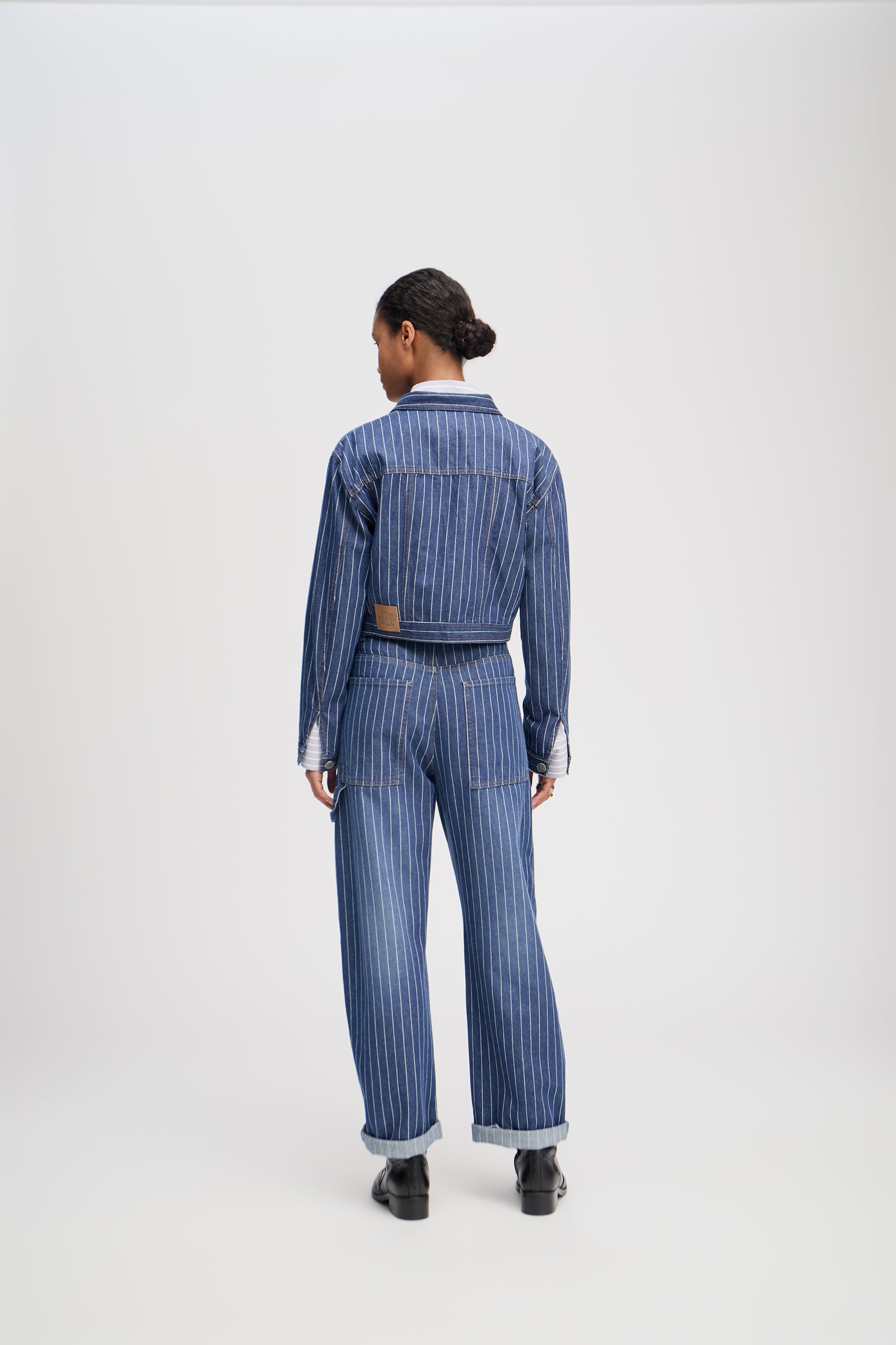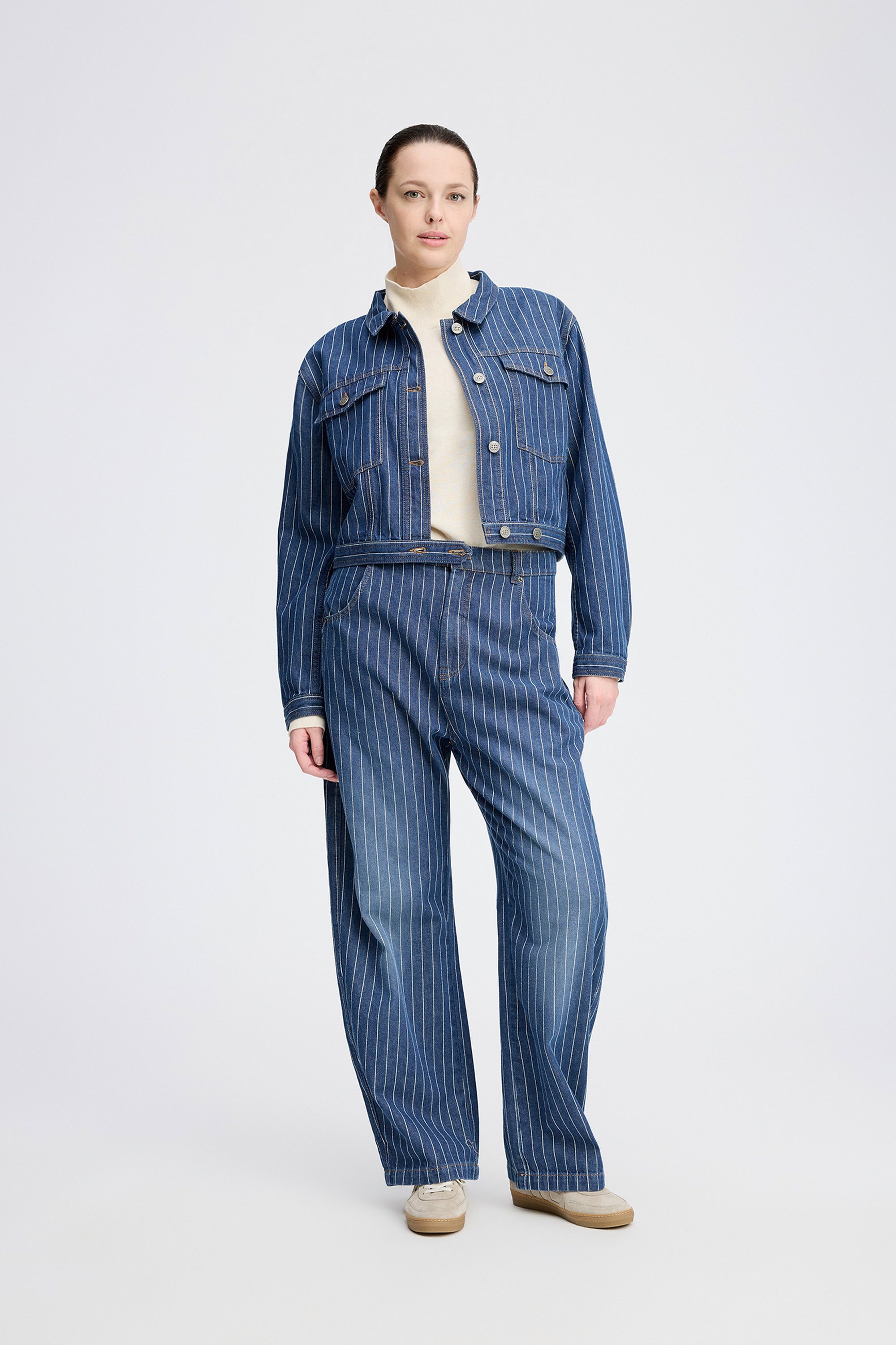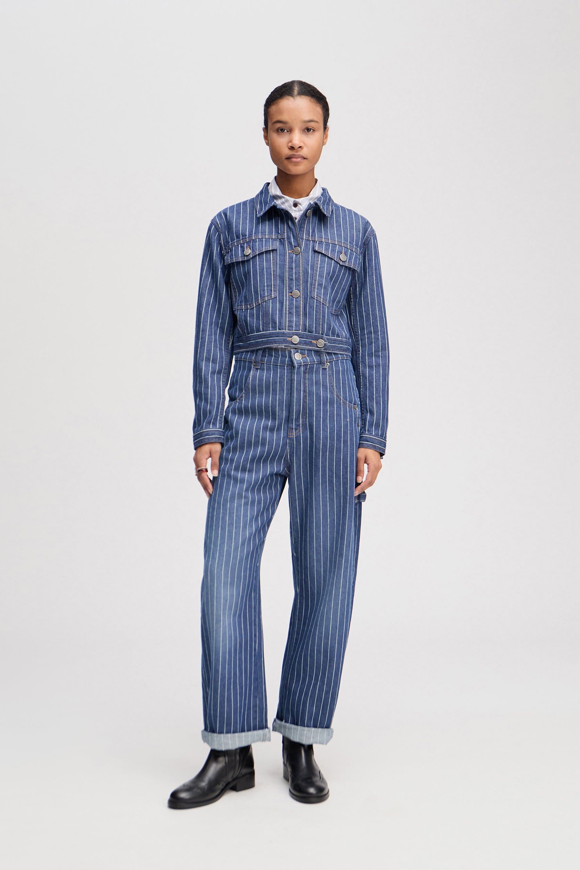 Kort denim jasje met krijtstrepen en verfijnde knopen met het MUNTHE-embleem. Het jasje is ontworpen met zakken, lange mouwen en is gemaakt van biologisch katoen.