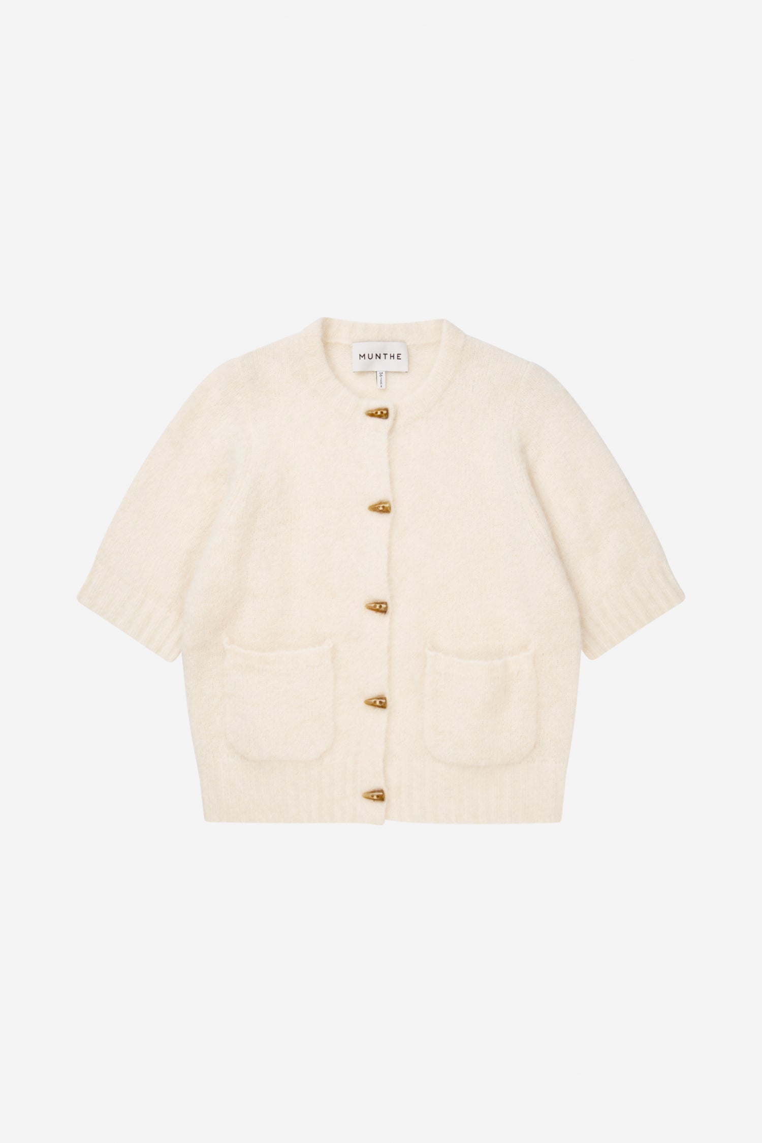 Cardigan met korte mouwen, voorzakken en nephoornknopen. Deze cardigan is ontworpen met een elegante geborstelde afwerking en bestaat voor 55% uit alpaca.