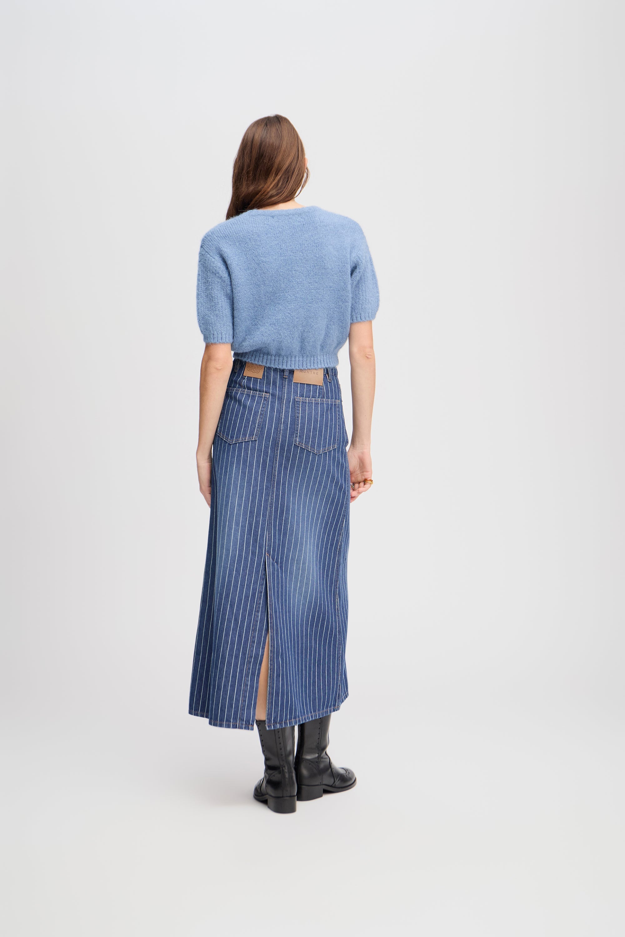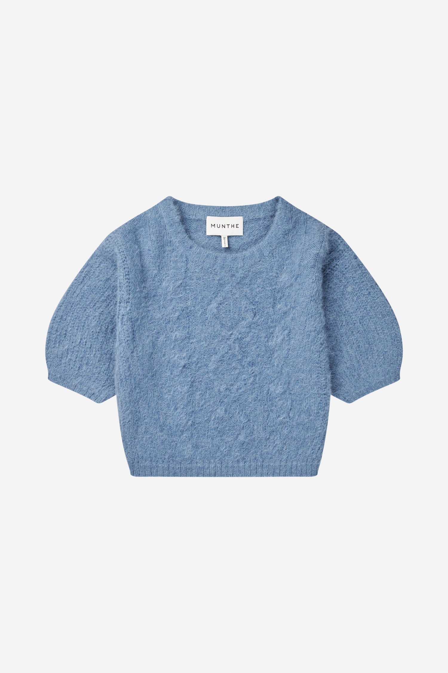 Een korte, mooie kabelgebreide trui met verfijnde ribboorden en een ronde halslijn.