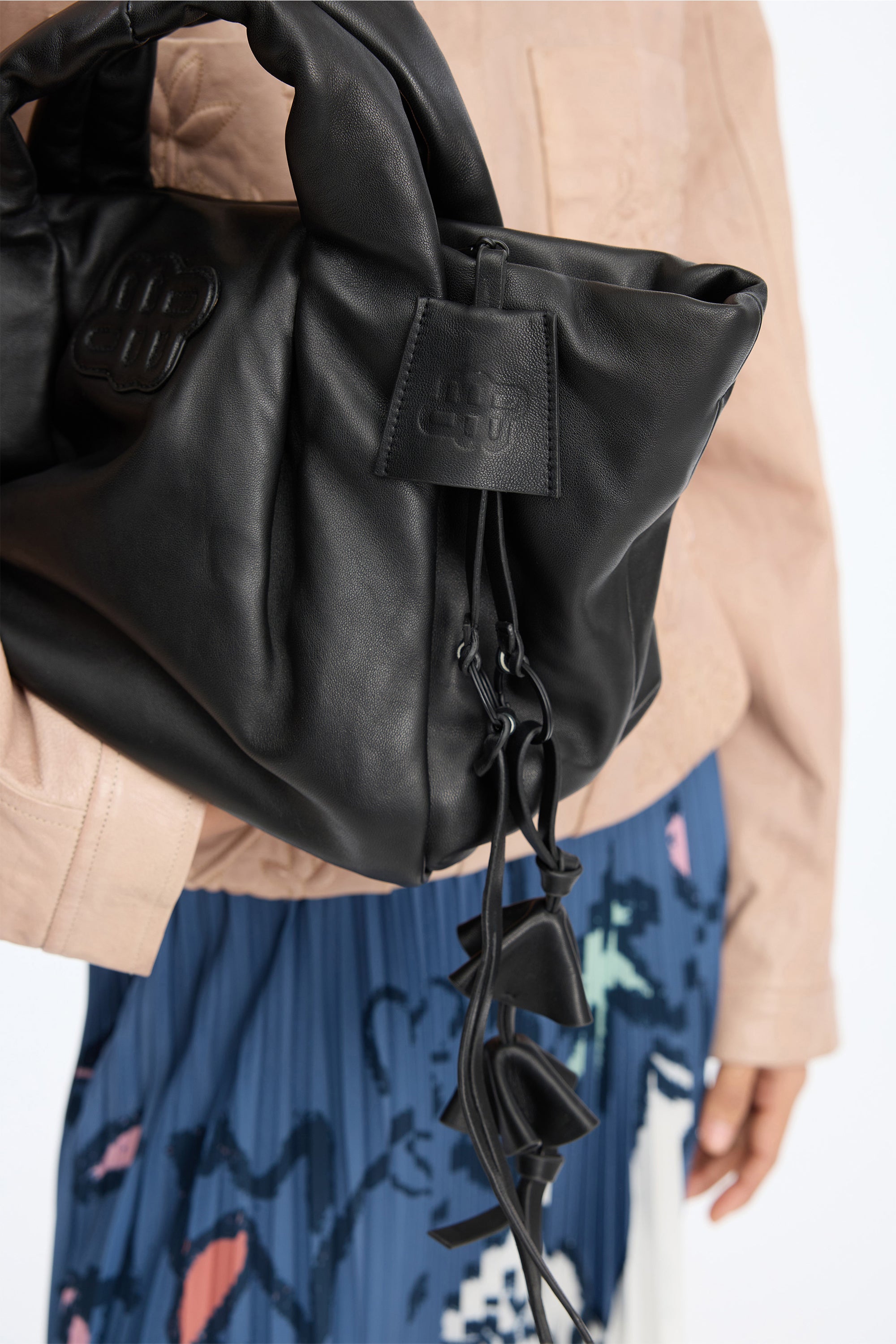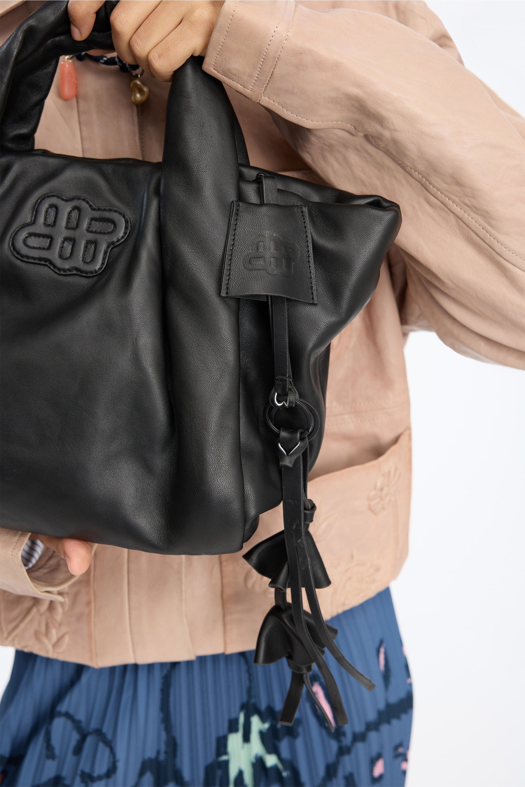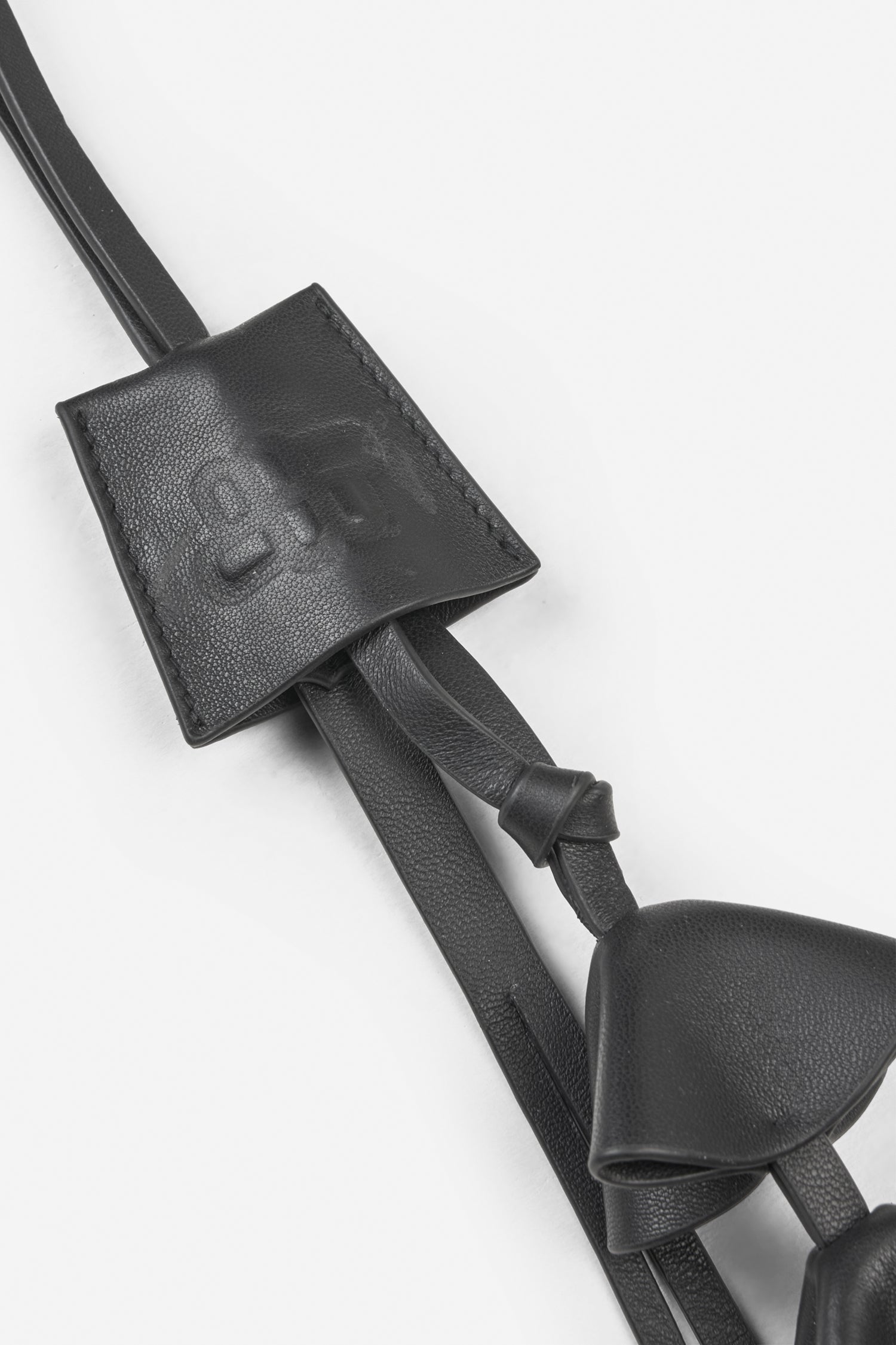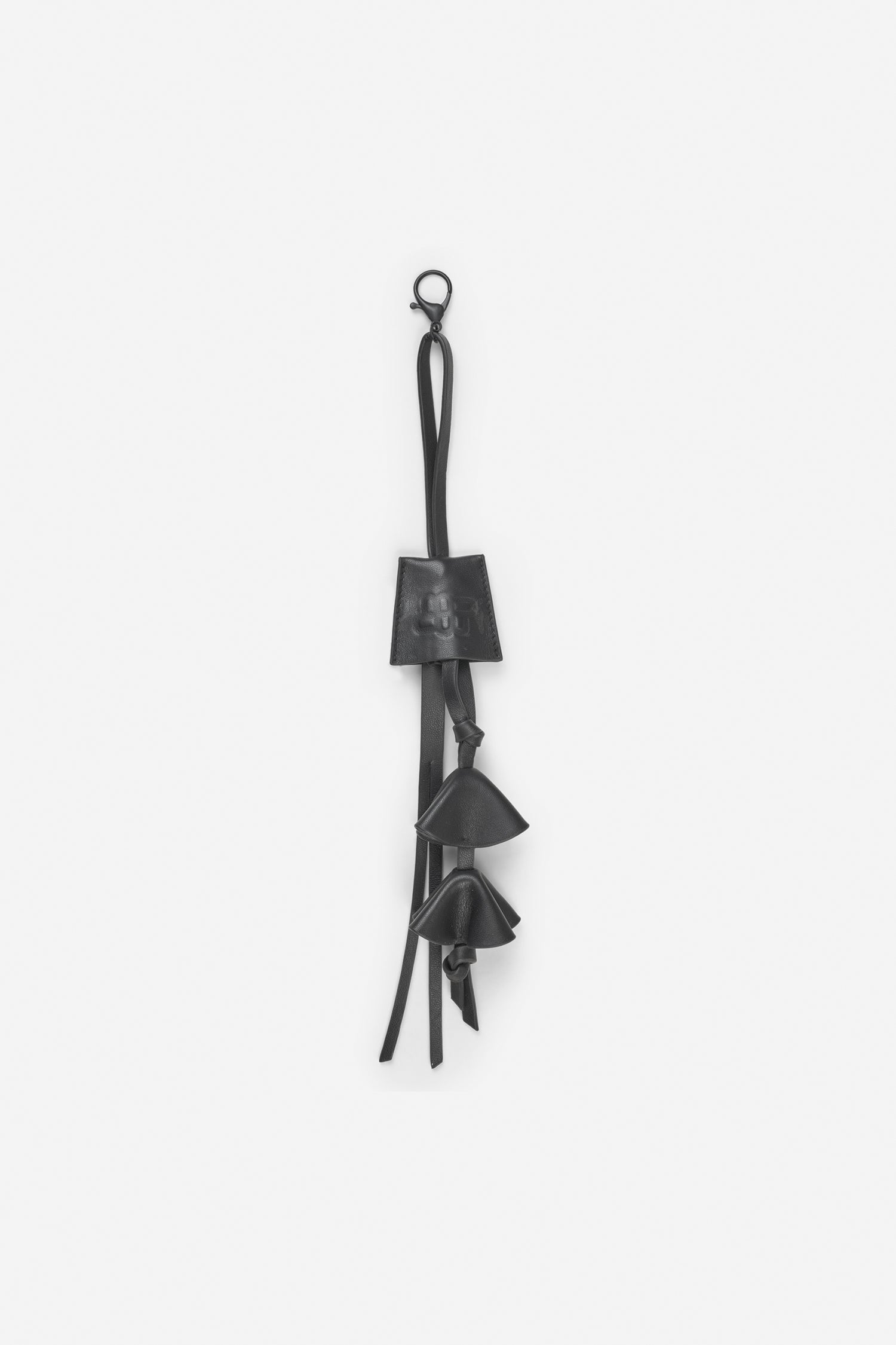 Dit tassenhangertje is gemaakt van lamsleer en ontworpen met drie kleine, gelaagde leren hangers en een lange, slanke strap.