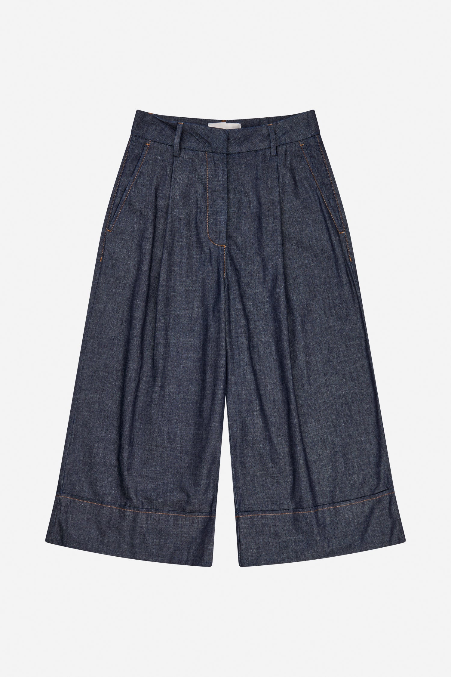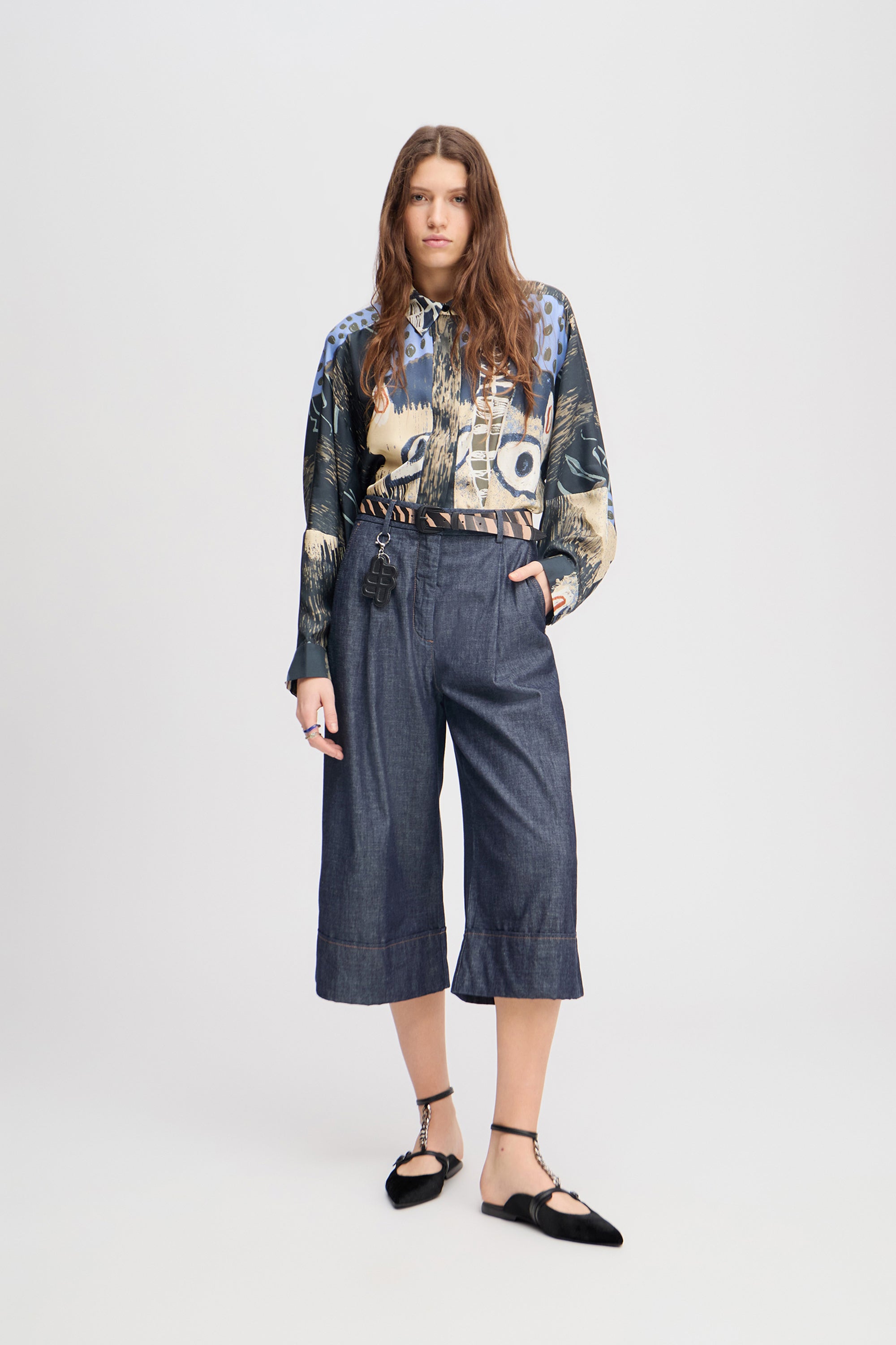 mooie denim culottebroek, ontworpen met elegante details zoals wijde omgeslagen pijpen, riemlussen en zijzakken. De broek sluit aan de voorkant met een rits.
