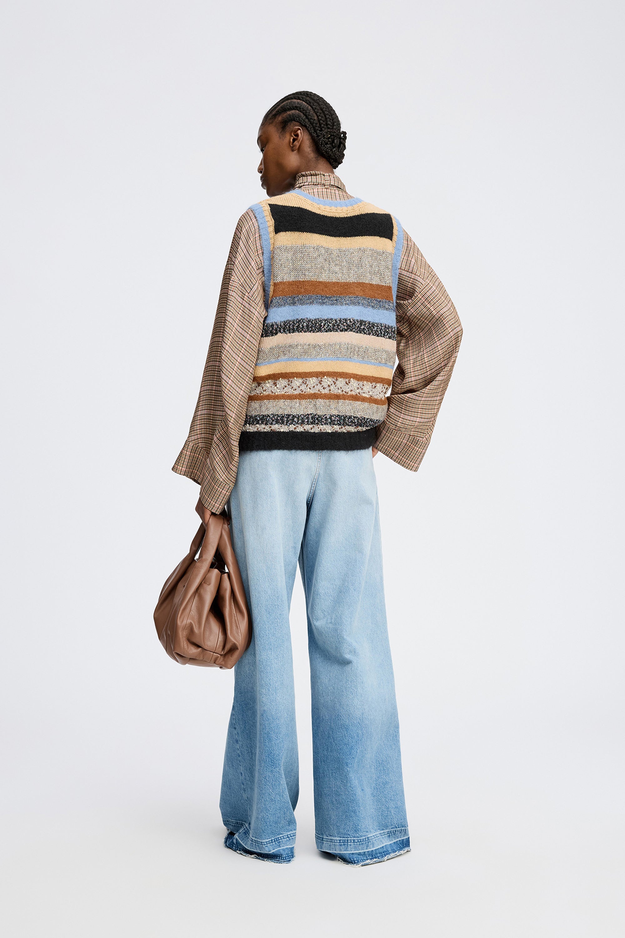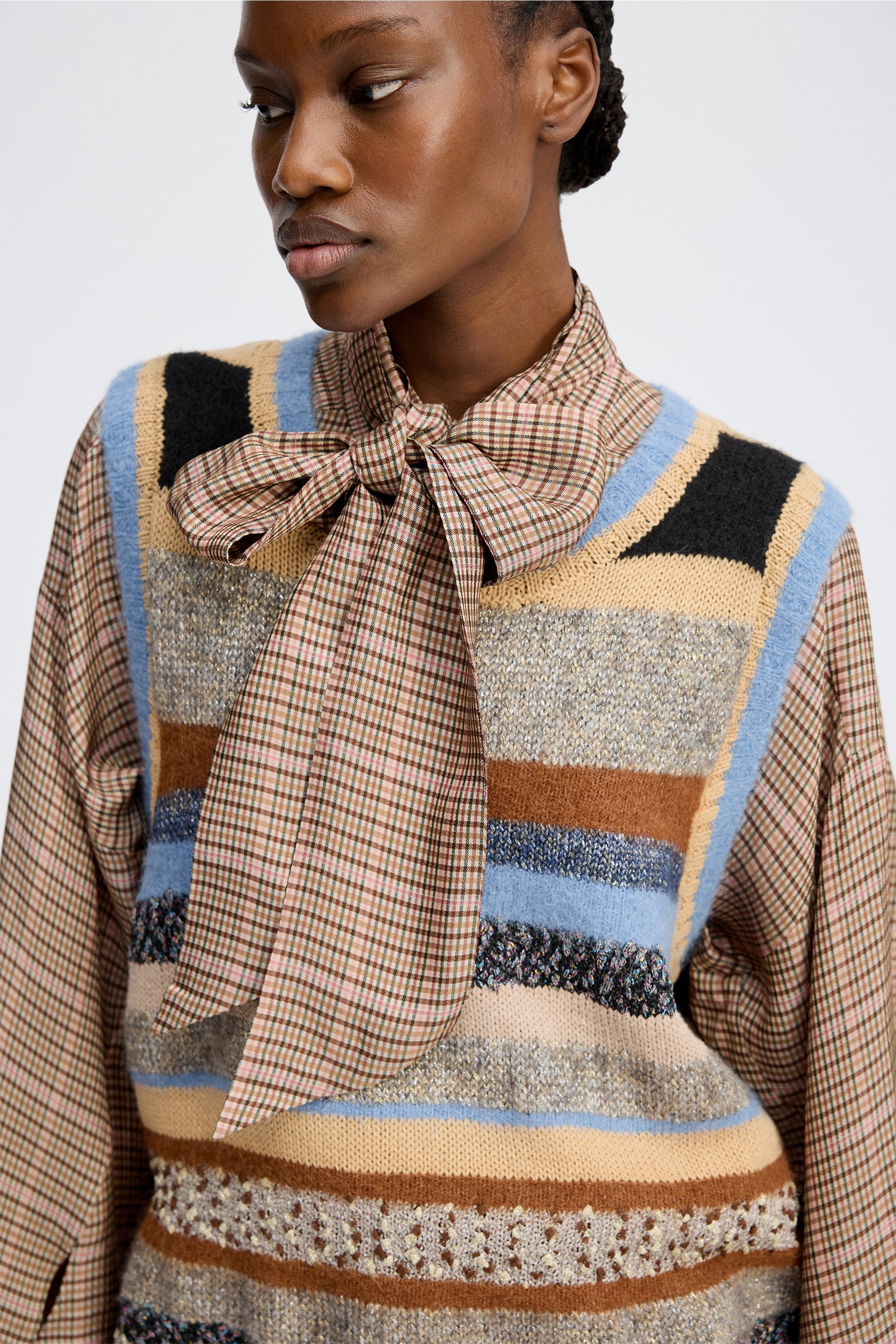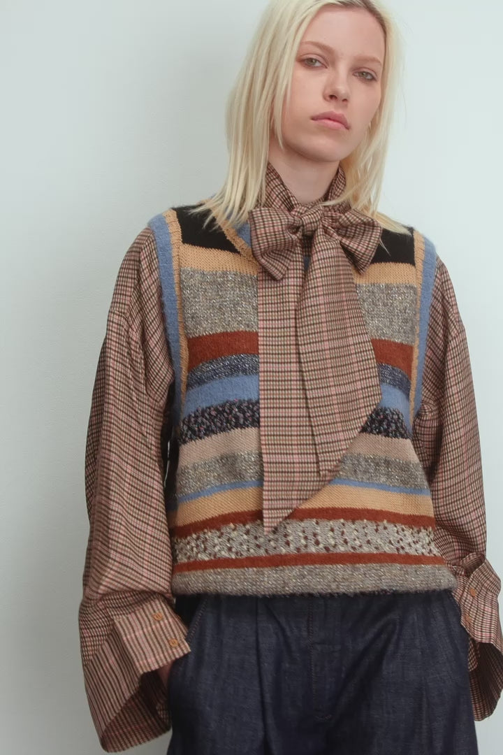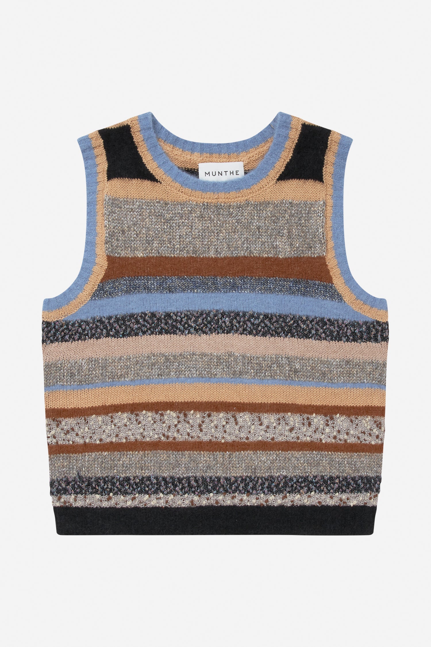 Gebreid vest met elegante strepen, prachtig samengesteld uit verschillende soorten breiwerk. Het vest is ontworpen met fijne ribdetails en een ronde halslijn.