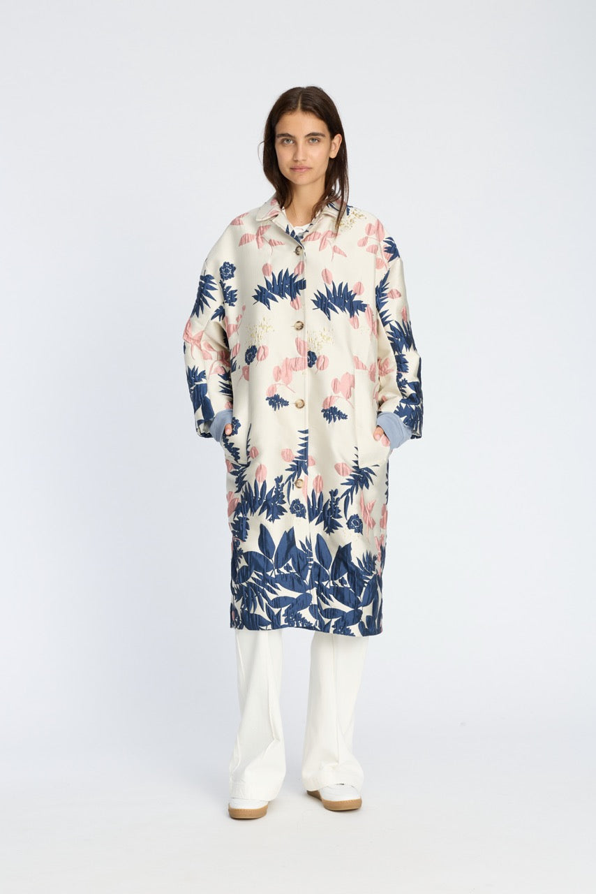 Lange jas met patroon en een rechte, licht ontspannen pasvorm. Ontworpen met knoopsluiting, kraag en twee grote voorzakken. Afgewerkt met artistiek botanisch borduurwerk in contrasterende tinten voor een unieke en verfijnde uitstraling.