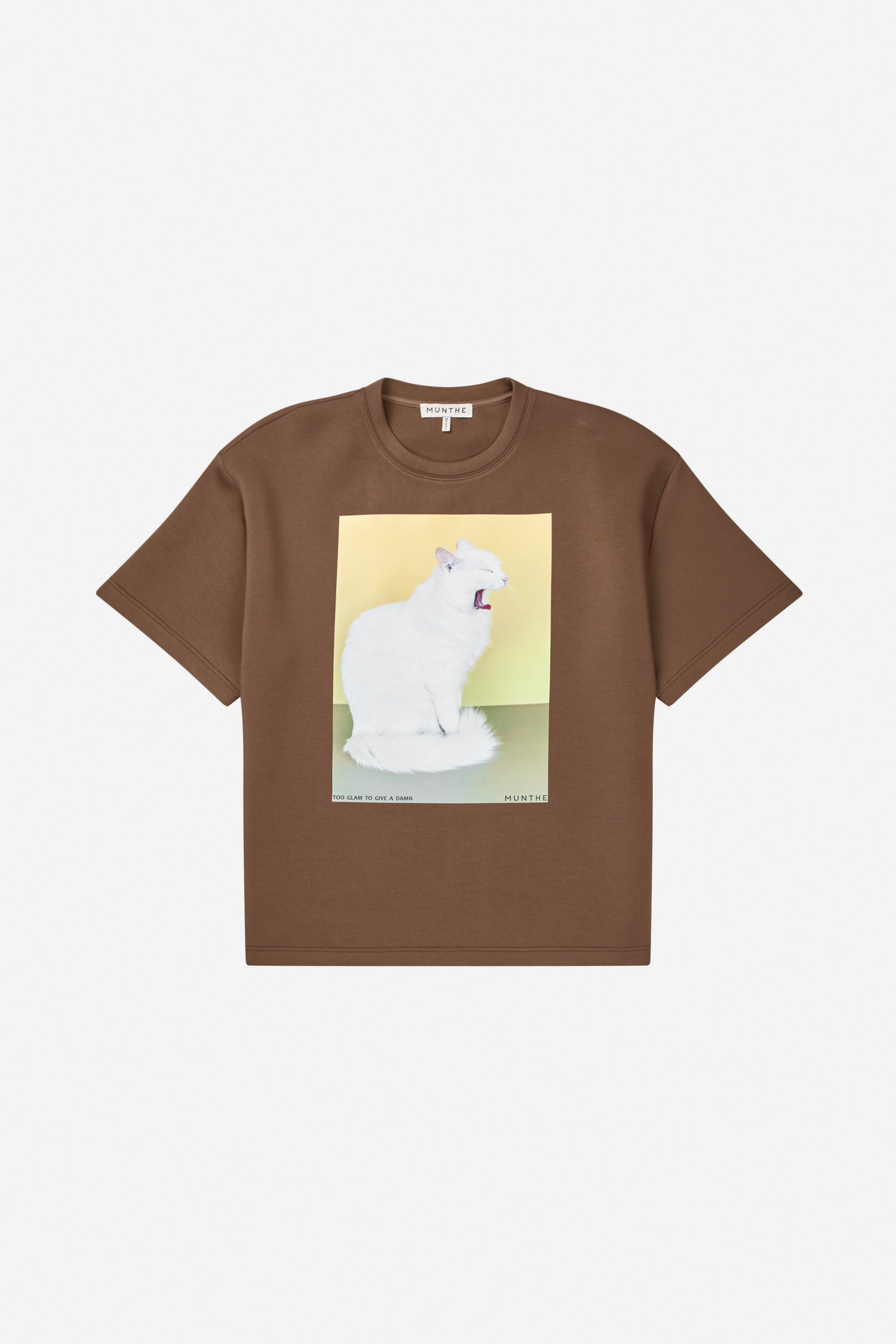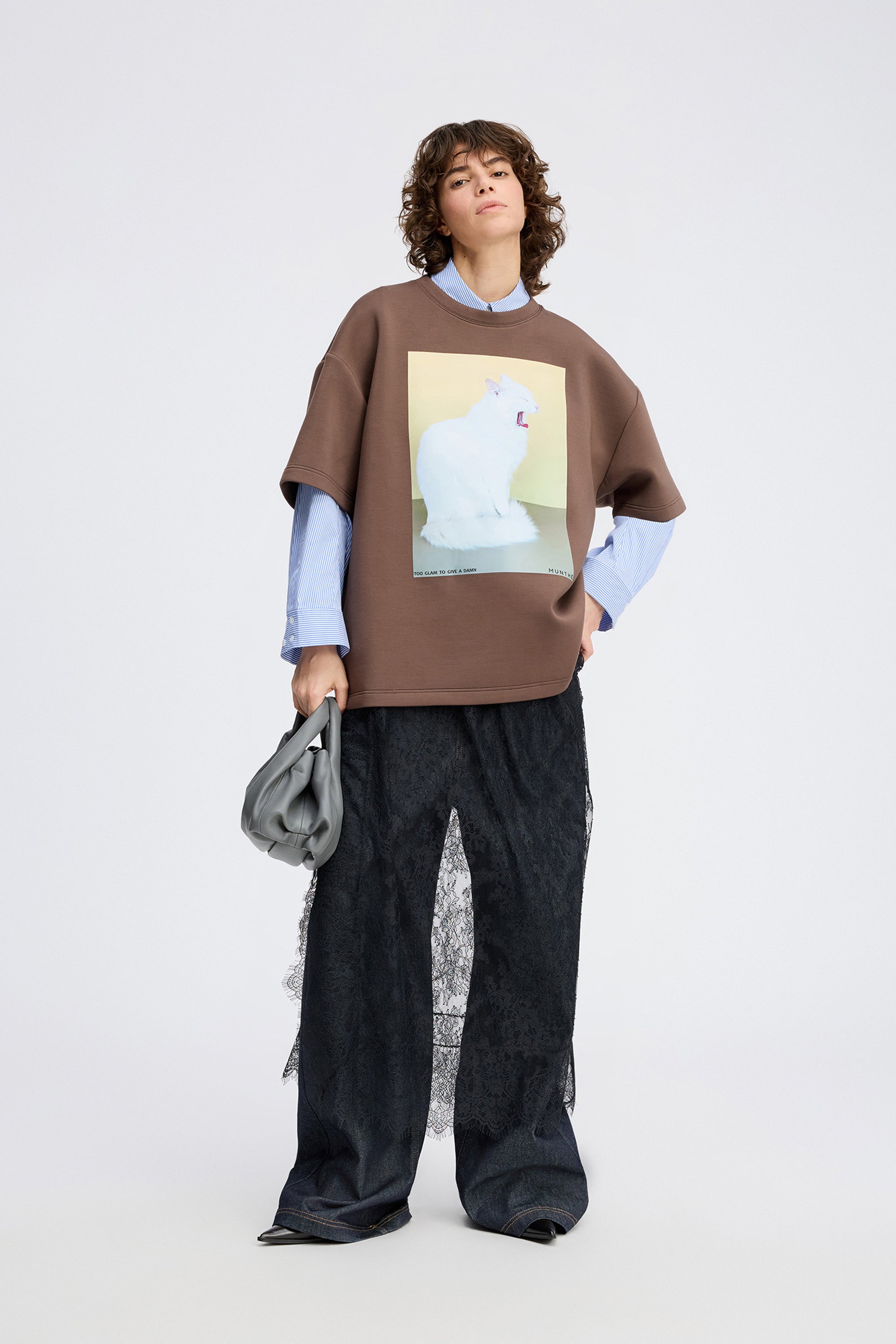Neopreen blouse met een elegante kattenprint. Deze blouse is oversized, heeft korte mouwen en een ronde hals.