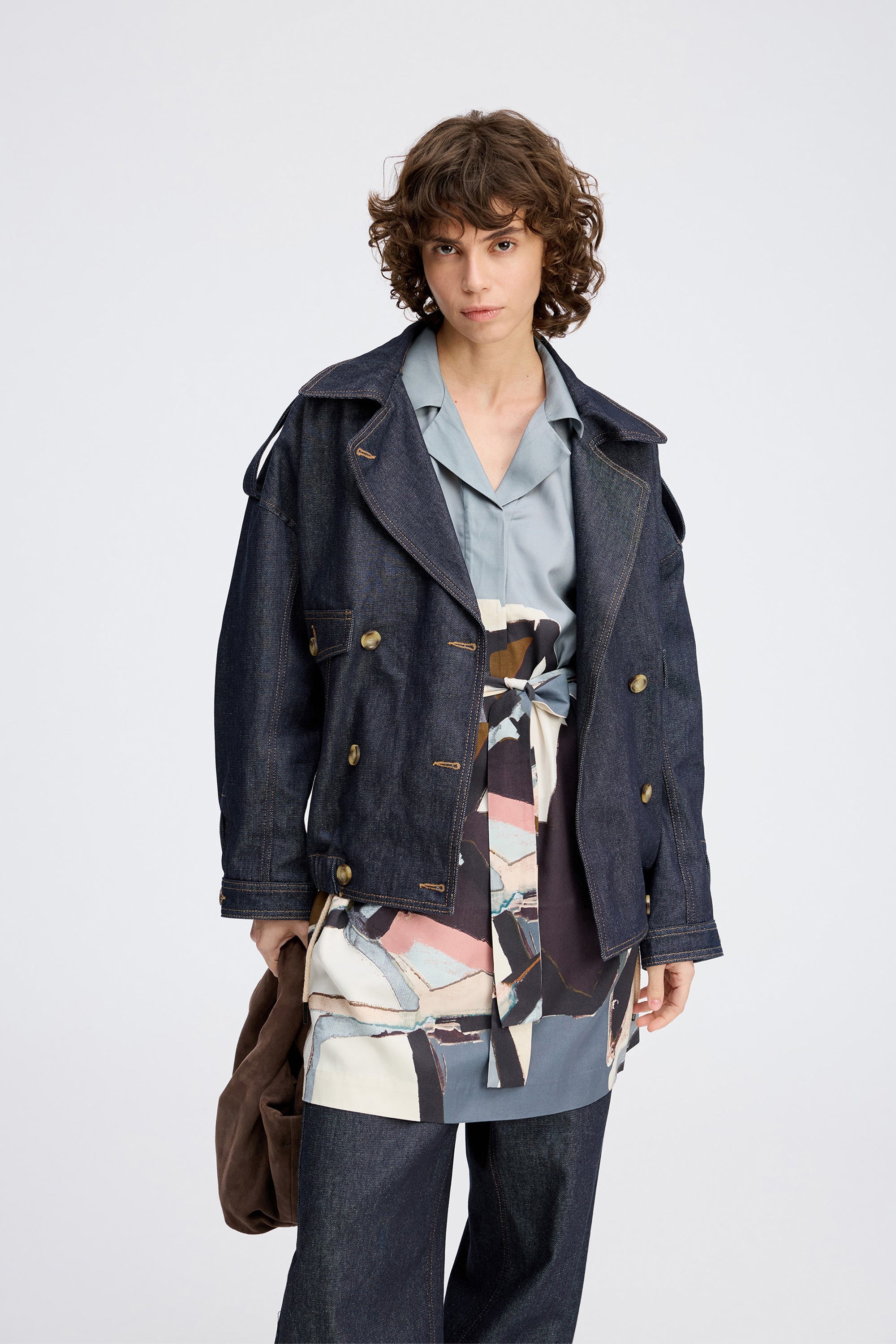 Kortemouwenjurk met een prachtige, kleurrijke kunstprint. Ontworpen met een open kraag en een losse pasvorm – kan worden gestyled met of zonder de afneembare strikriem voor een persoonlijke touch.