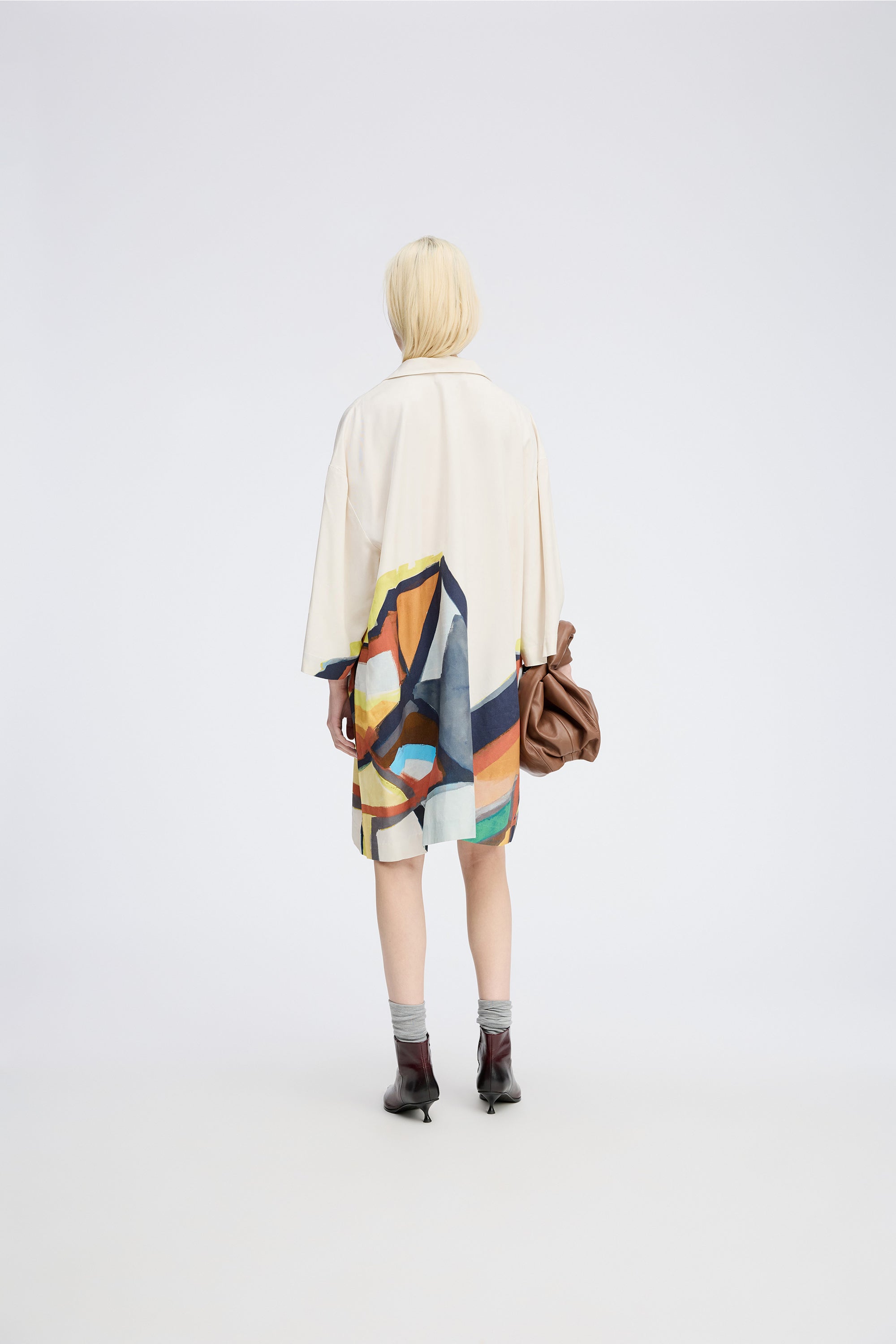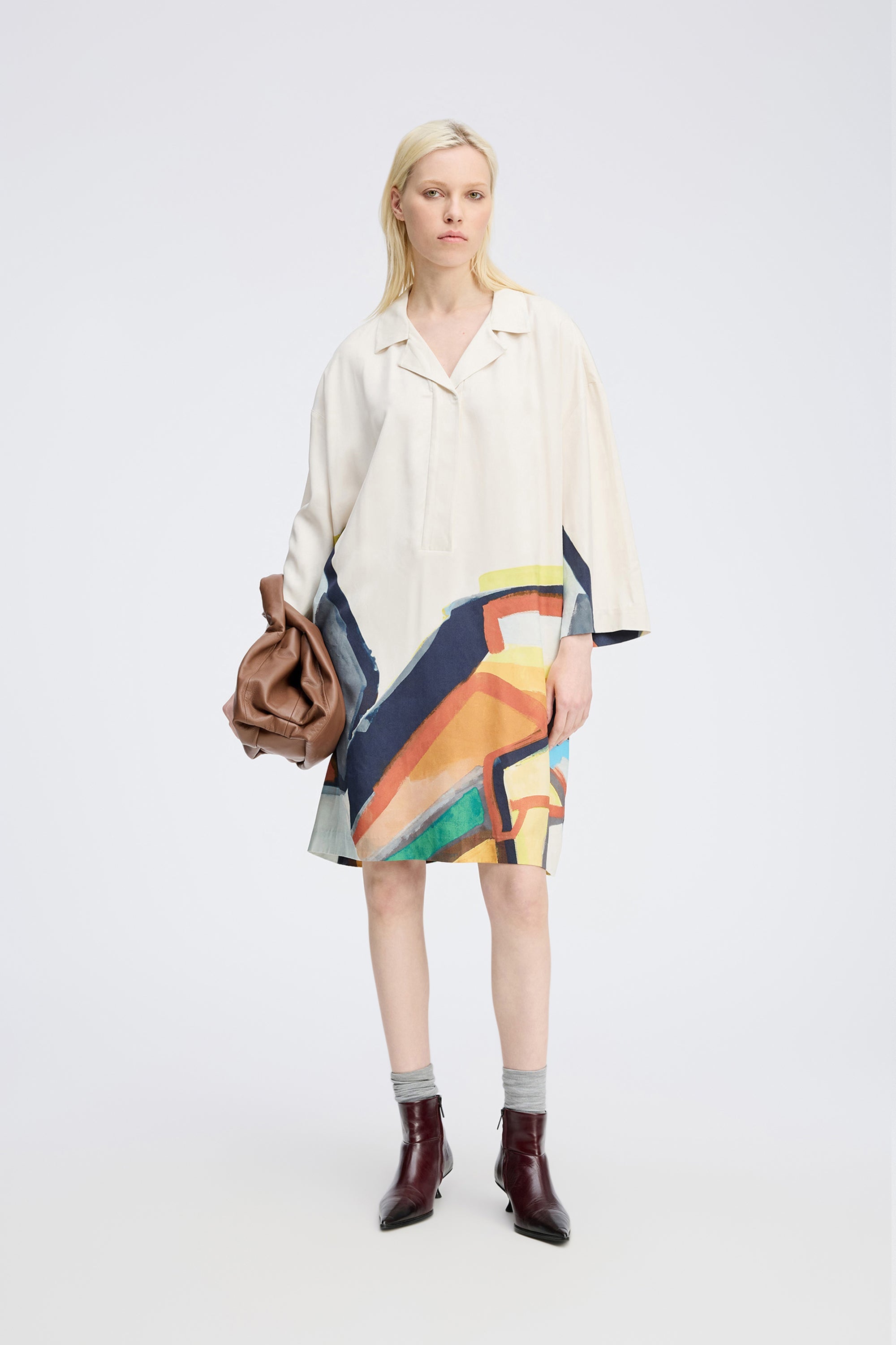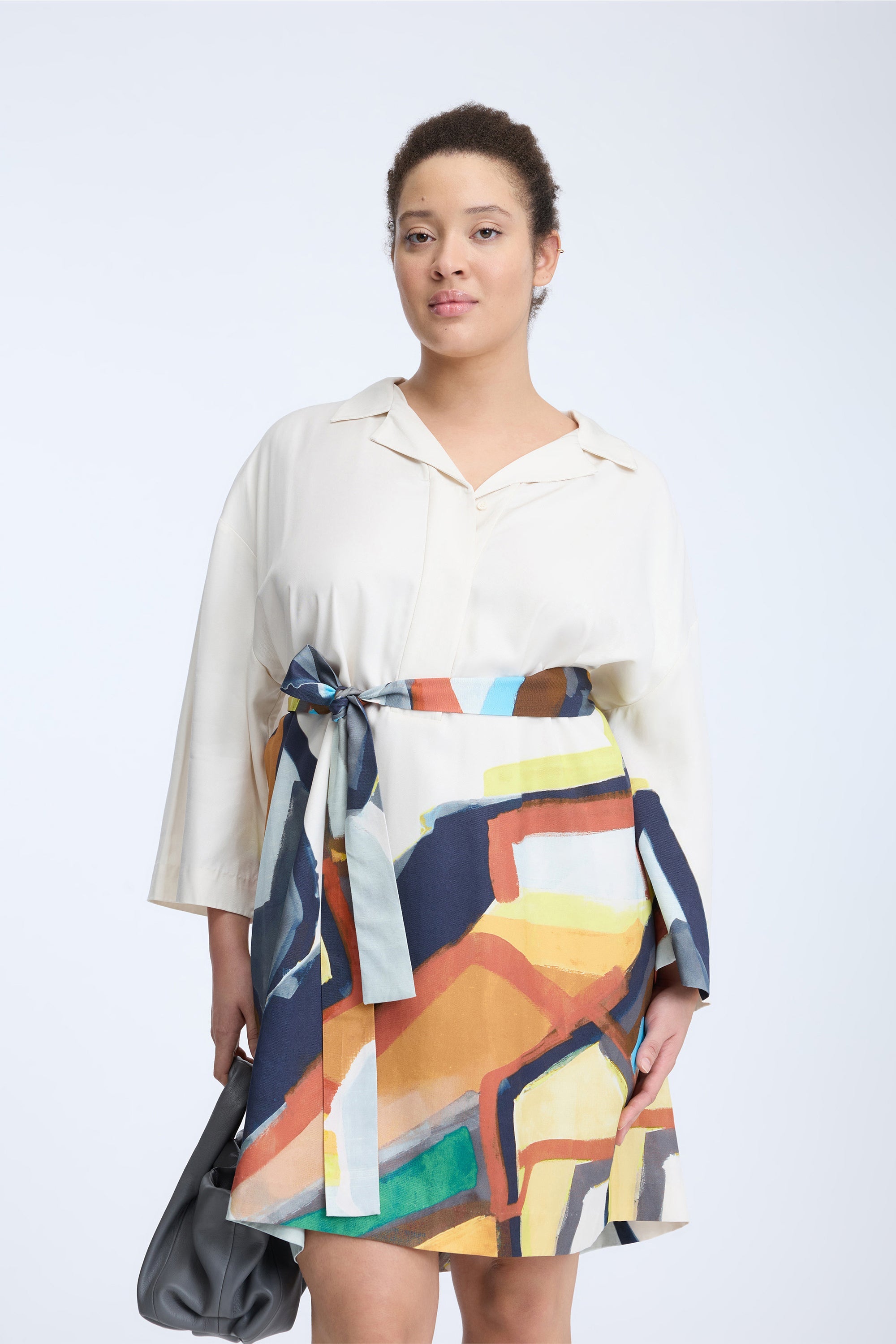 Kortemouwenjurk met een prachtige, kleurrijke kunstprint. Ontworpen met een open kraag en een losse pasvorm – kan worden gestyled met of zonder de afneembare strikriem voor een persoonlijke touch.