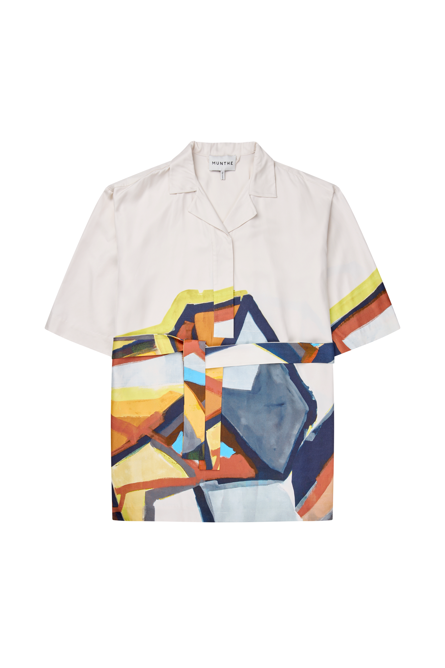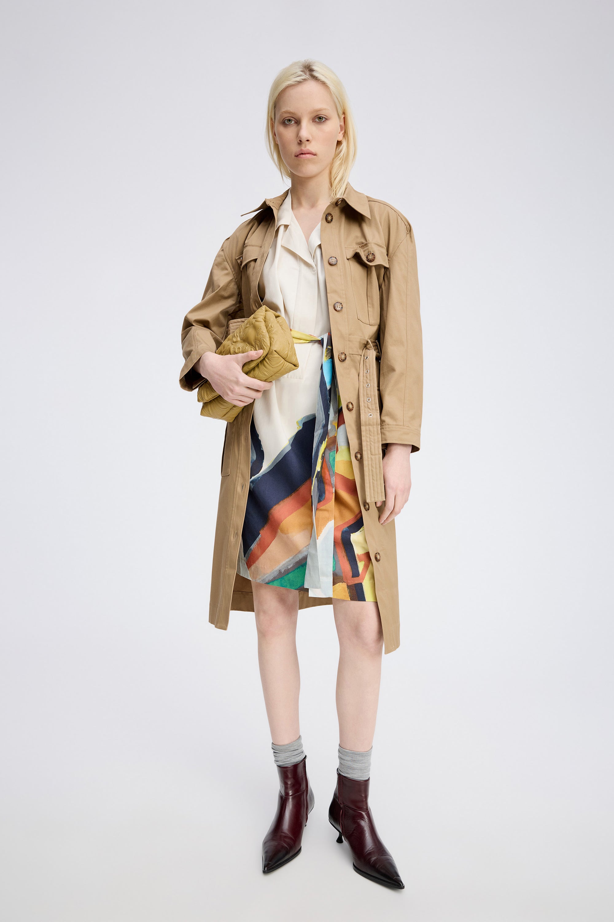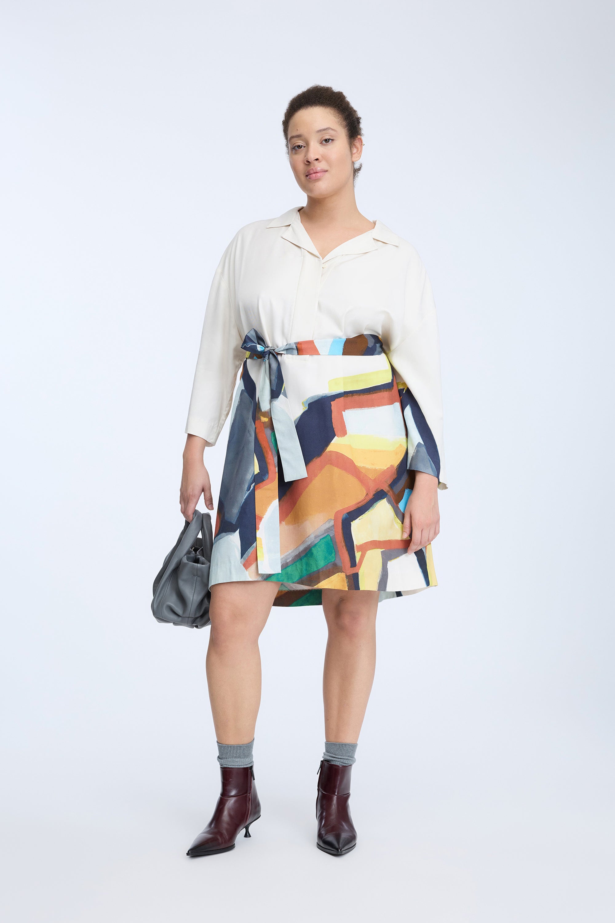 Kortemouwenjurk met een prachtige, kleurrijke kunstprint. Ontworpen met een open kraag en een losse pasvorm – kan worden gestyled met of zonder de afneembare strikriem voor een persoonlijke touch.