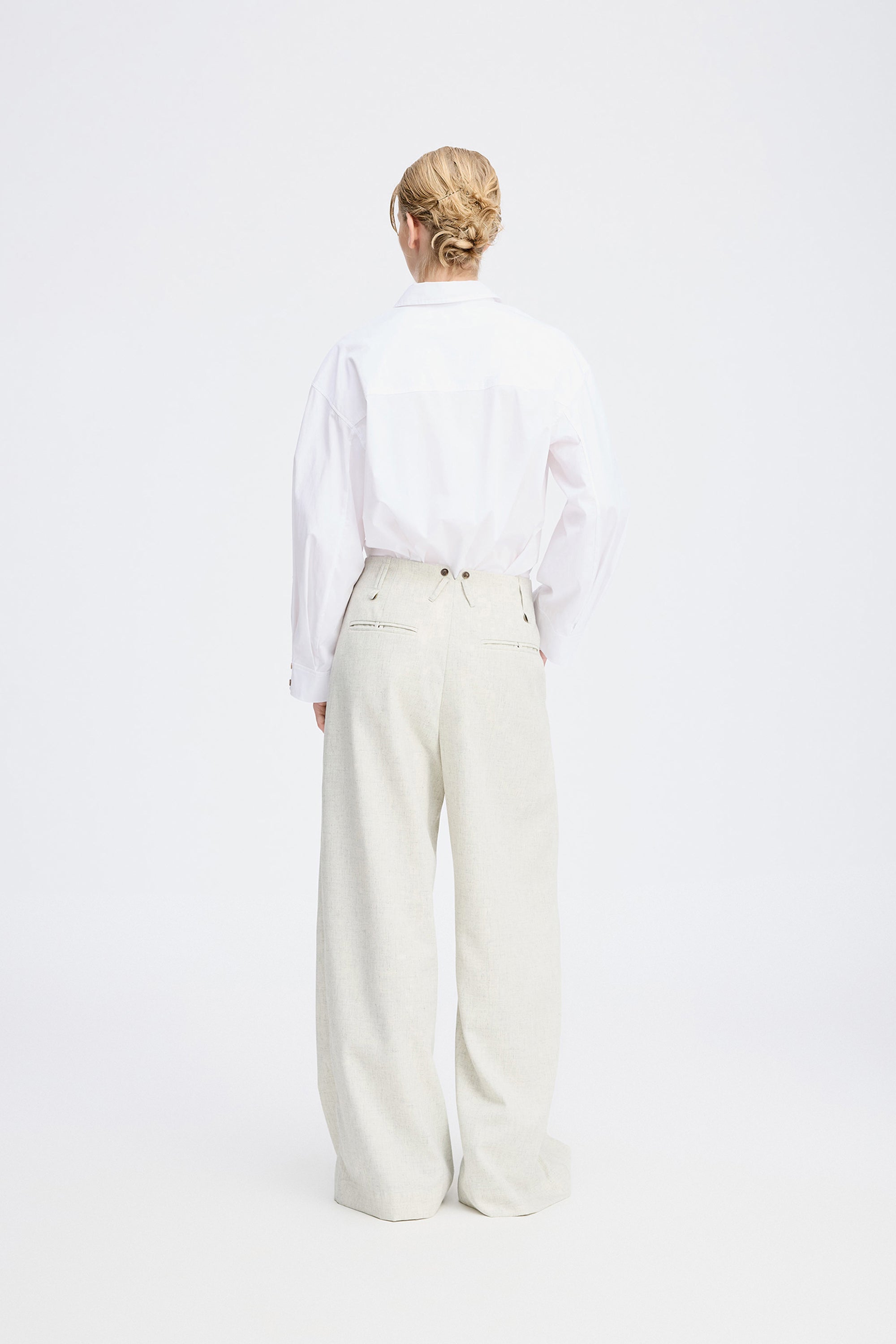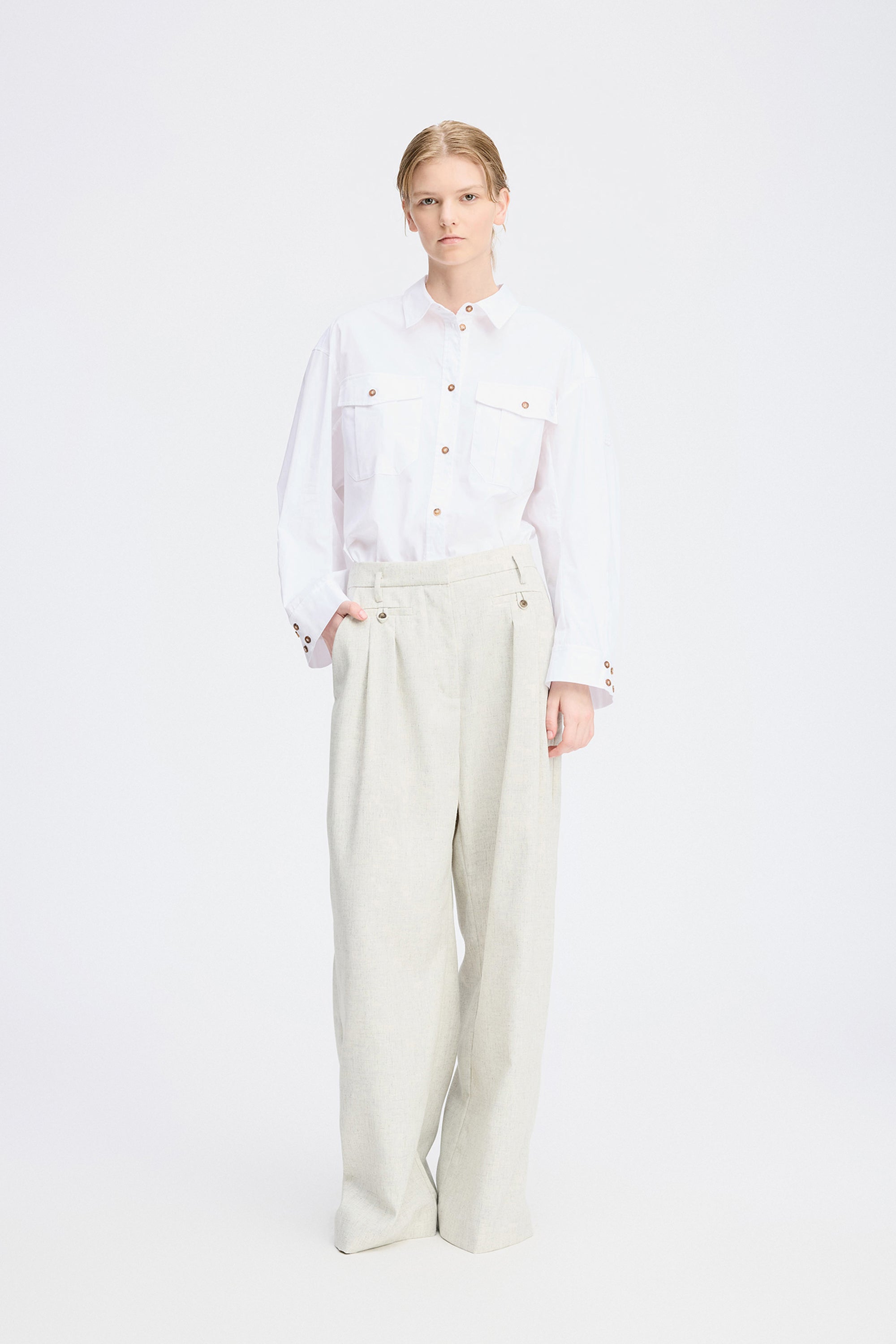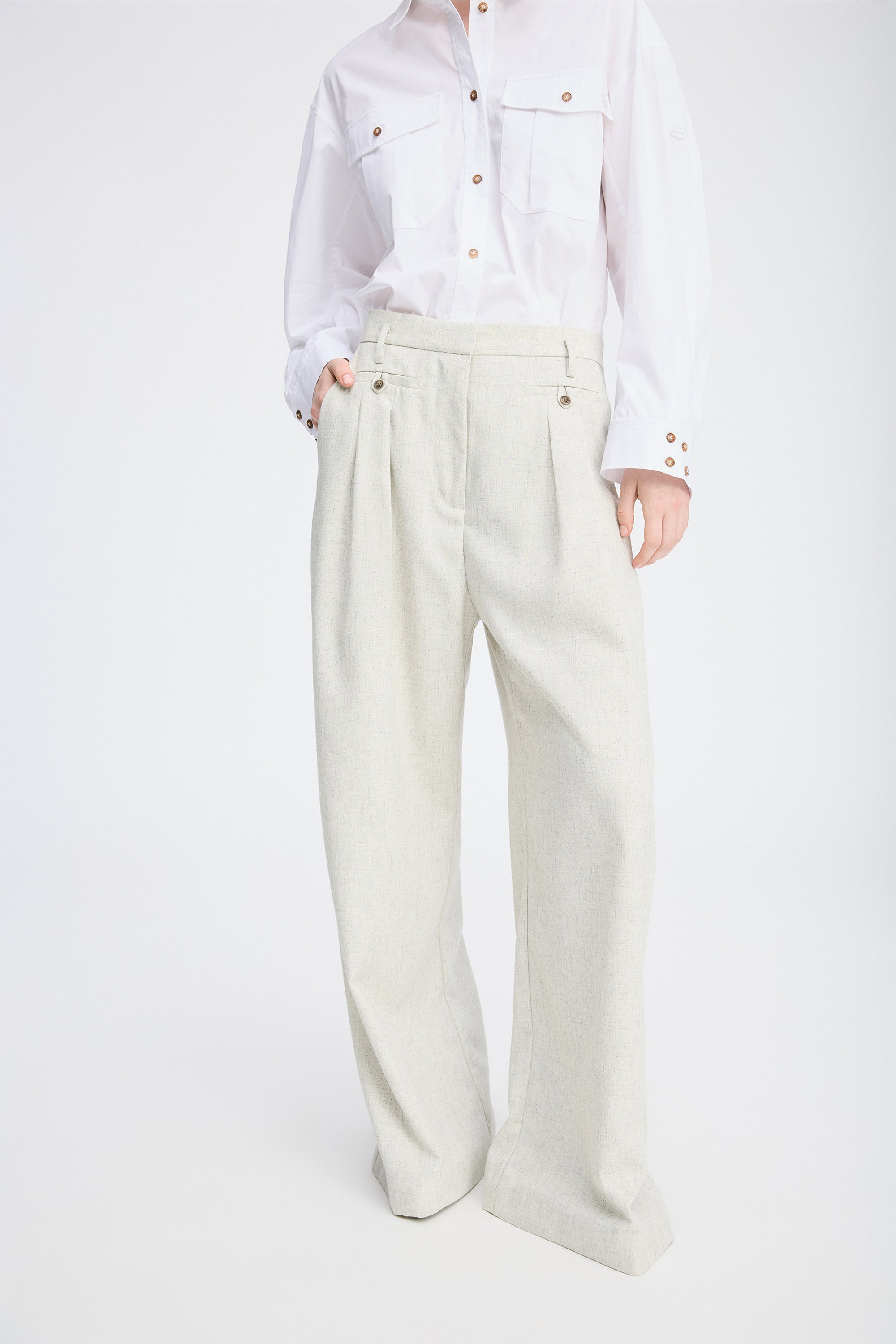 Elegante broek van een gestructureerde stof met wijde pijpen. Deze broek is ontworpen met een hoge taille, plooien aan de voorkant, schuine zijzakken en paspelzakken aan de achterkant met een knoop.