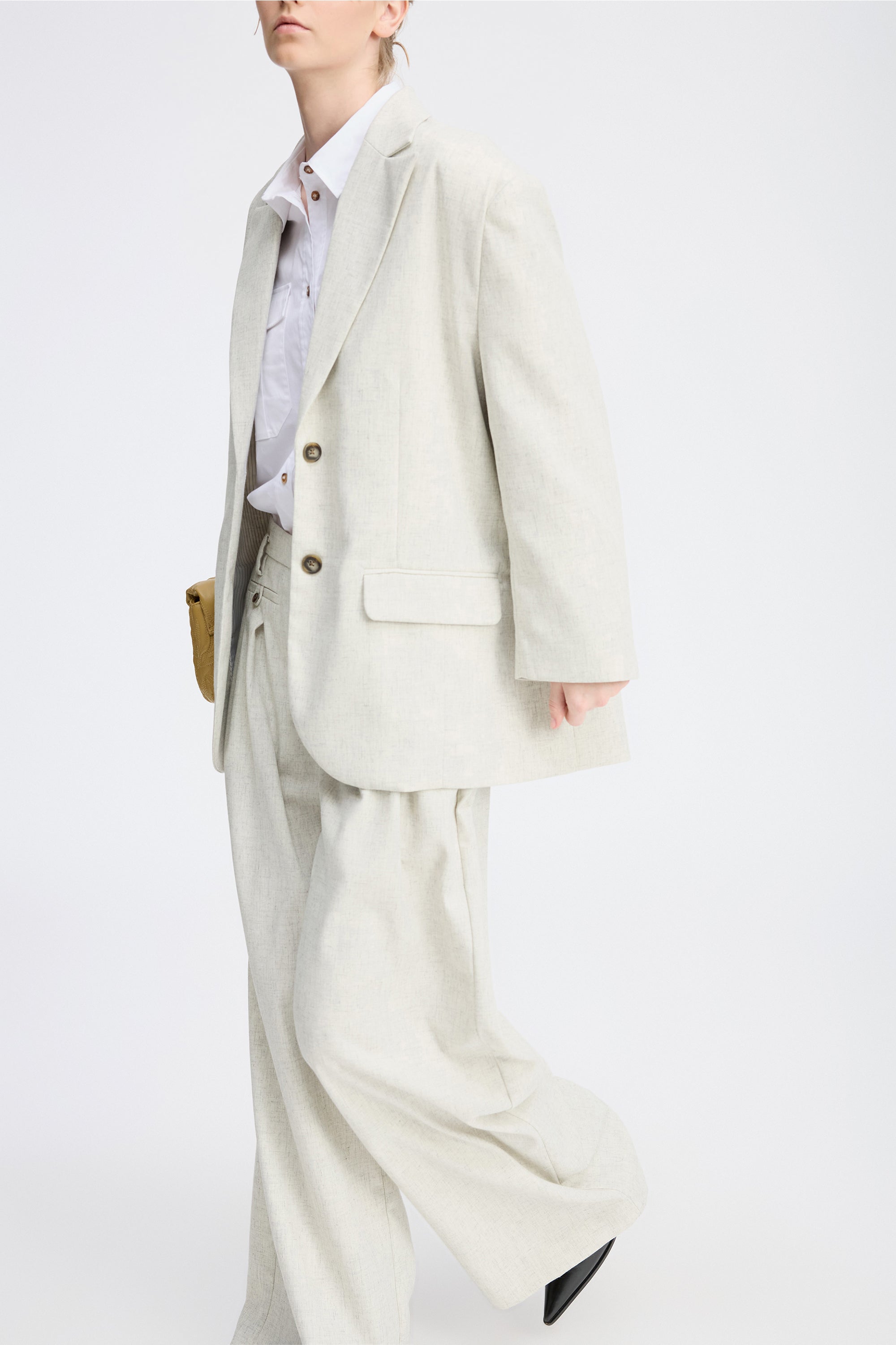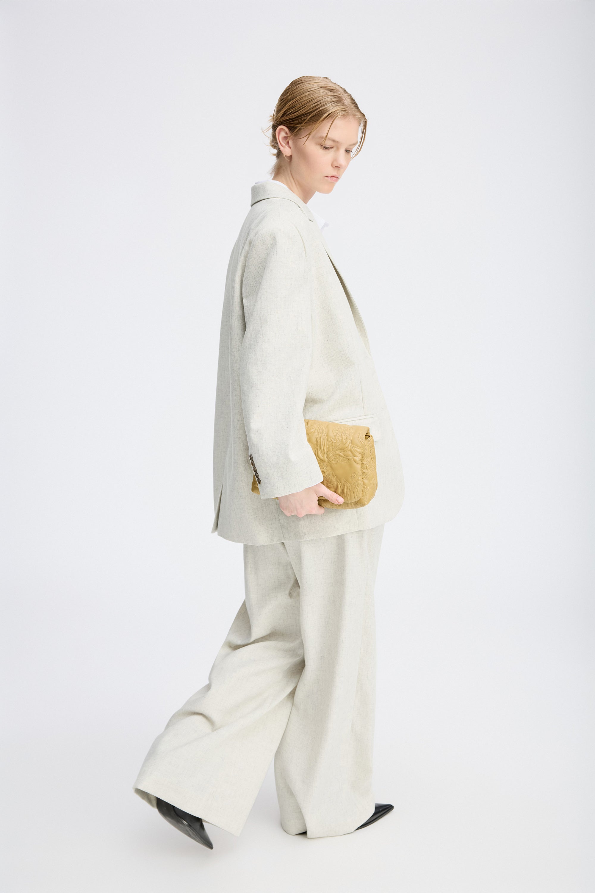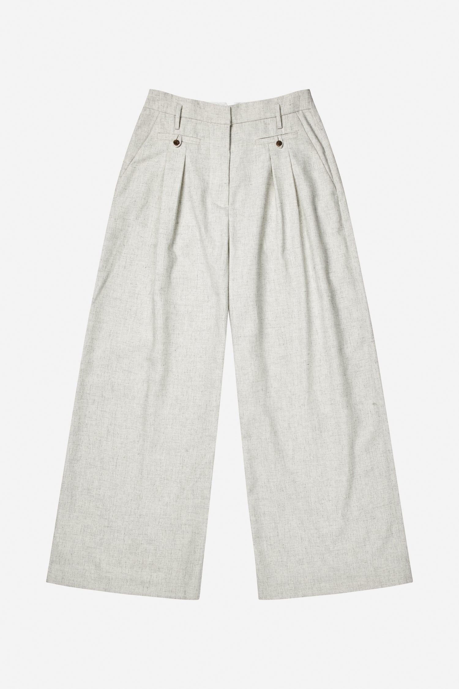 Elegante broek van een gestructureerde stof met wijde pijpen. Deze broek is ontworpen met een hoge taille, plooien aan de voorkant, schuine zijzakken en paspelzakken aan de achterkant met een knoop.
