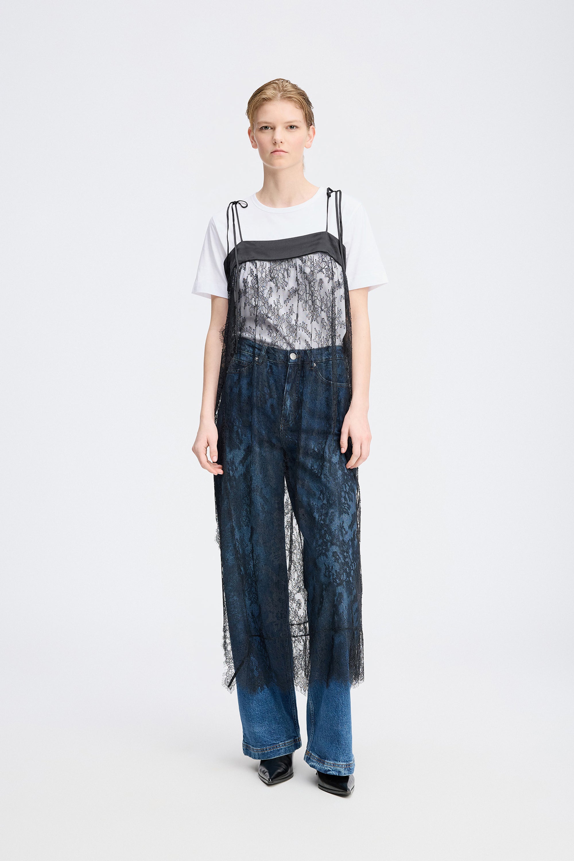 Elegante kanten jurk met delicate kanten randen. Ontworpen met dunne, verstelbare bandjes en een asymmetrische kanten zoom. Draag de jurk op zichzelf of combineer hem met een Rocco Slip eronder.