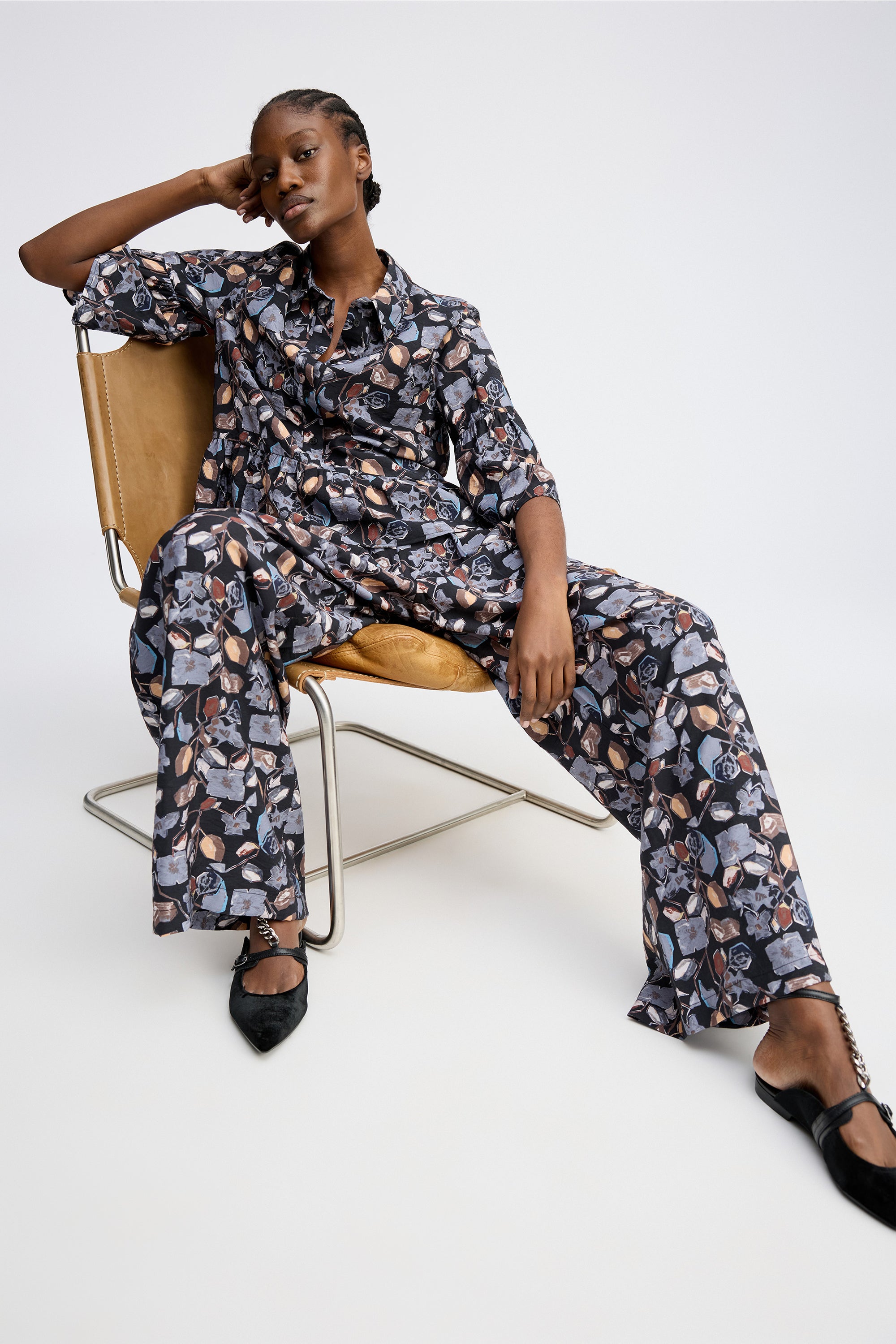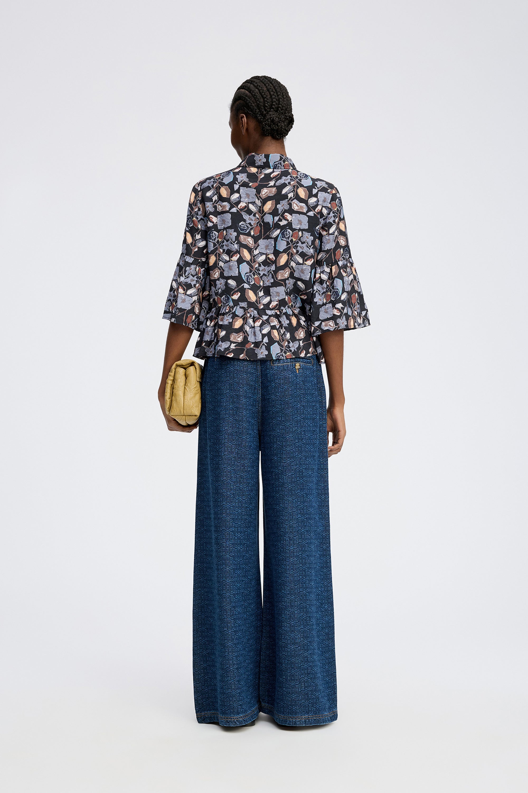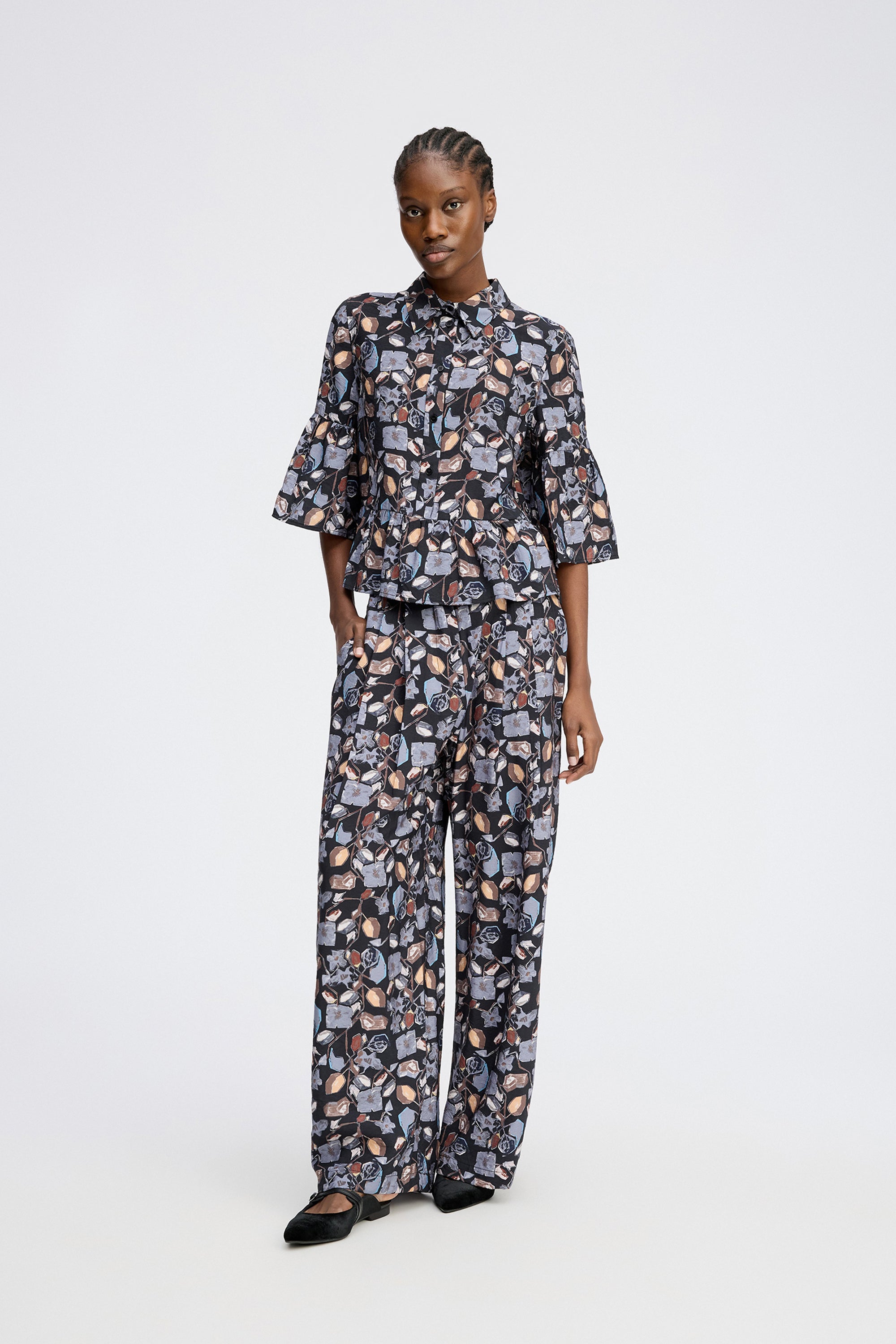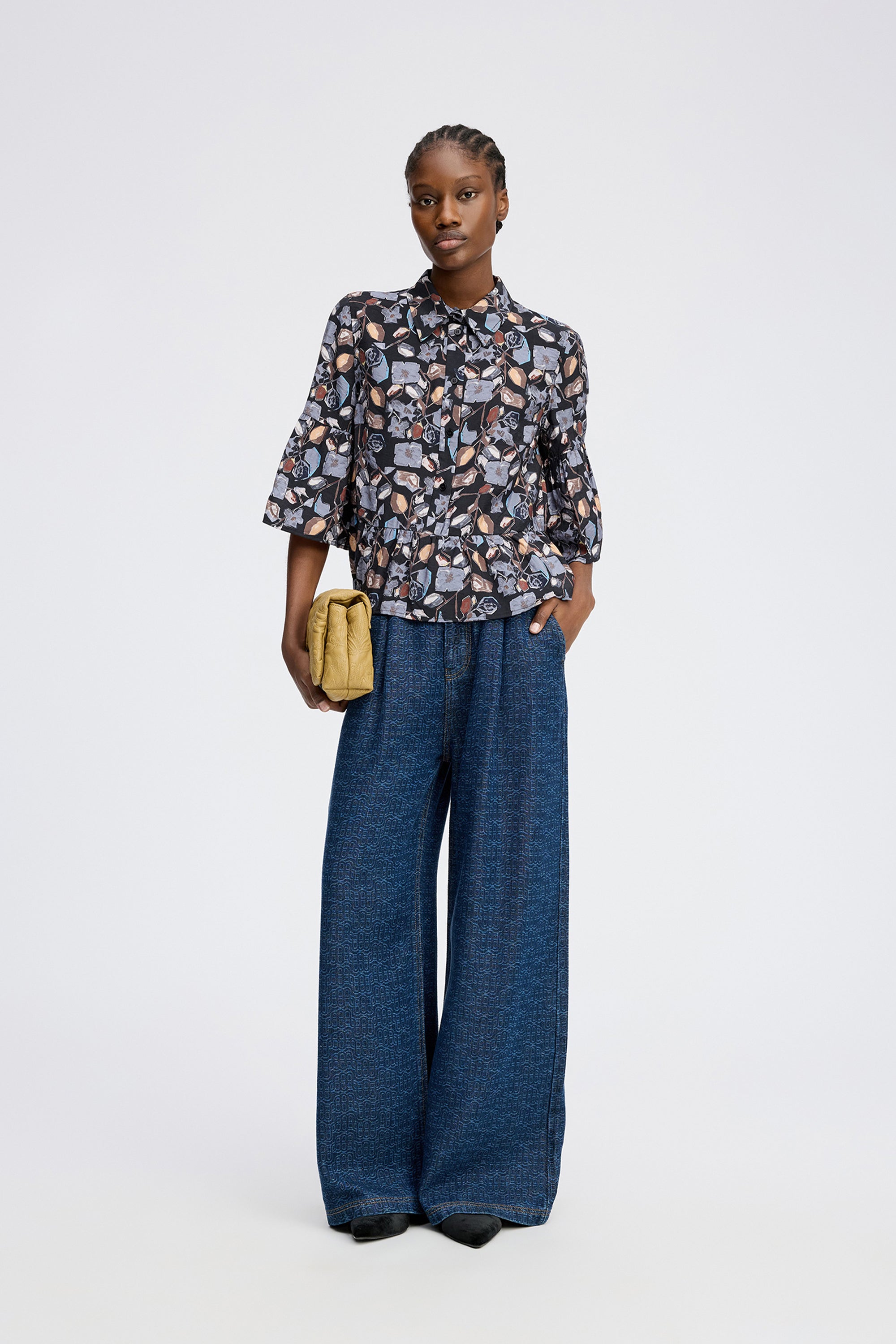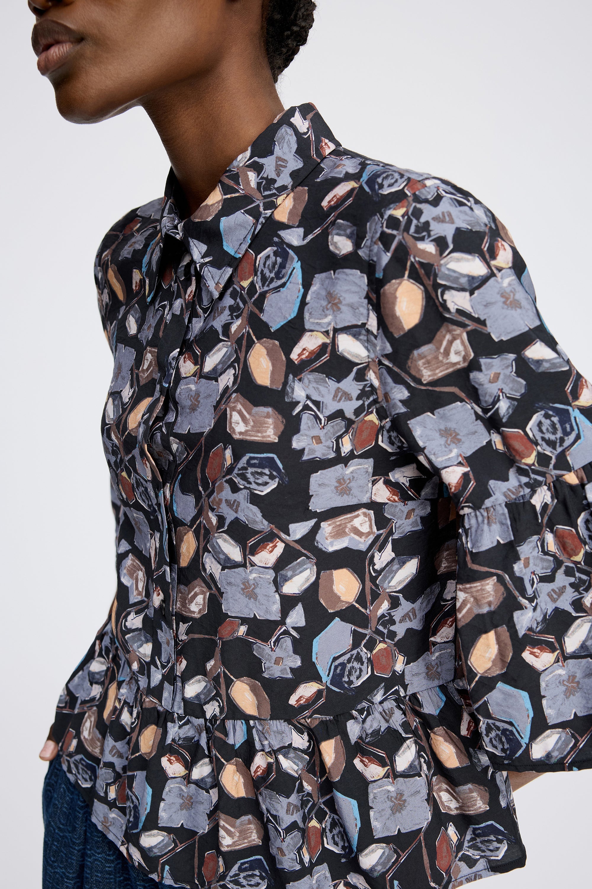 Vrouwelijke blouse met een prachtige bloemenprint. Ontworpen met een klassieke kraag, wijde 3/4-mouwen en een elegante peplumtaille. De blouse sluit met knopen tot halverwege.