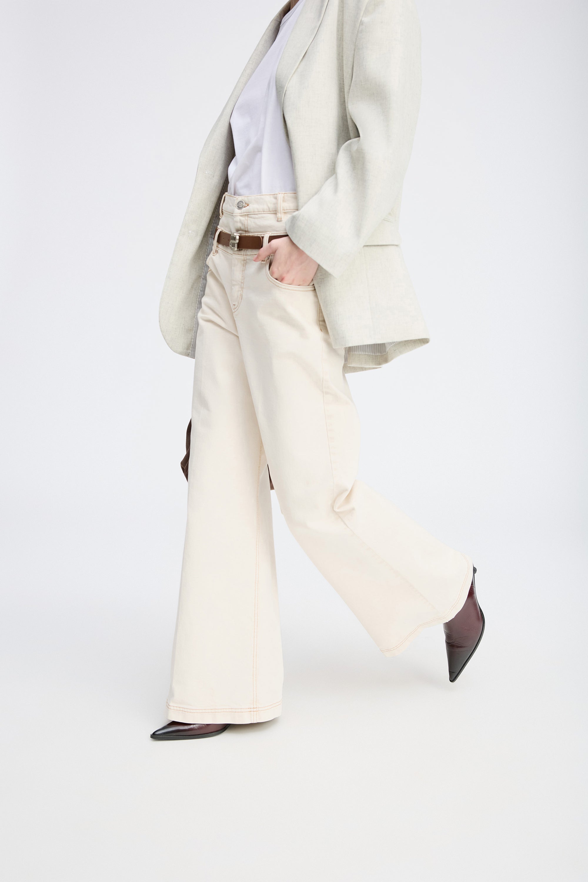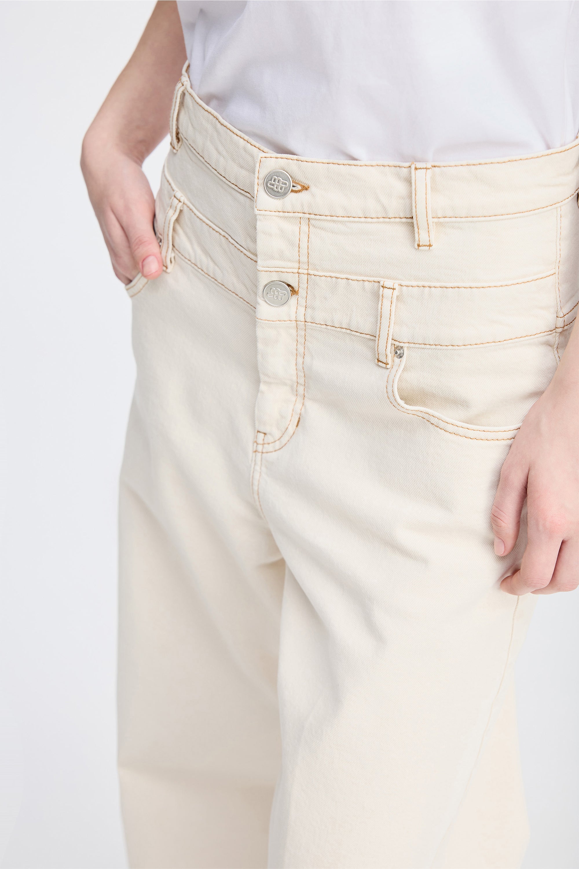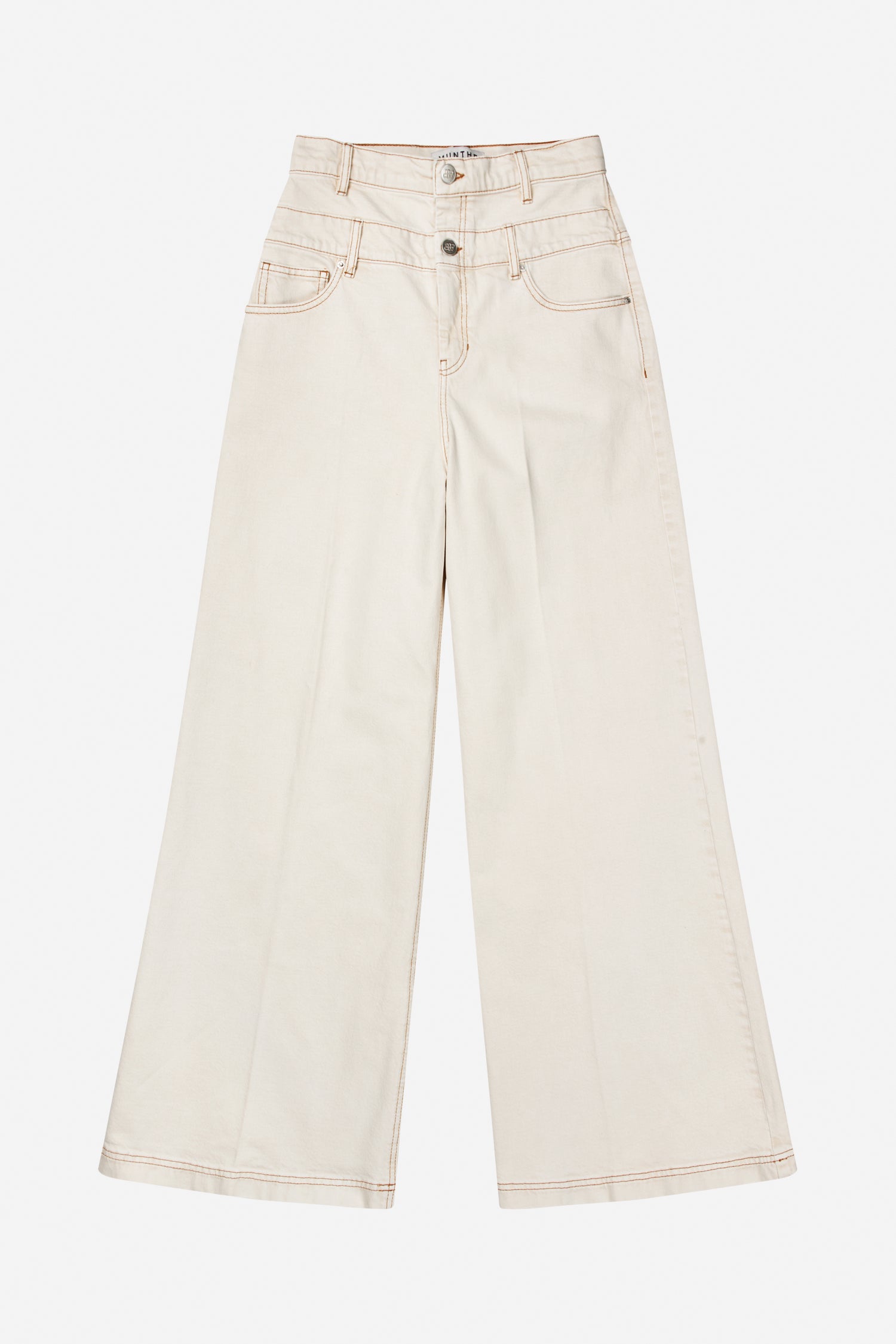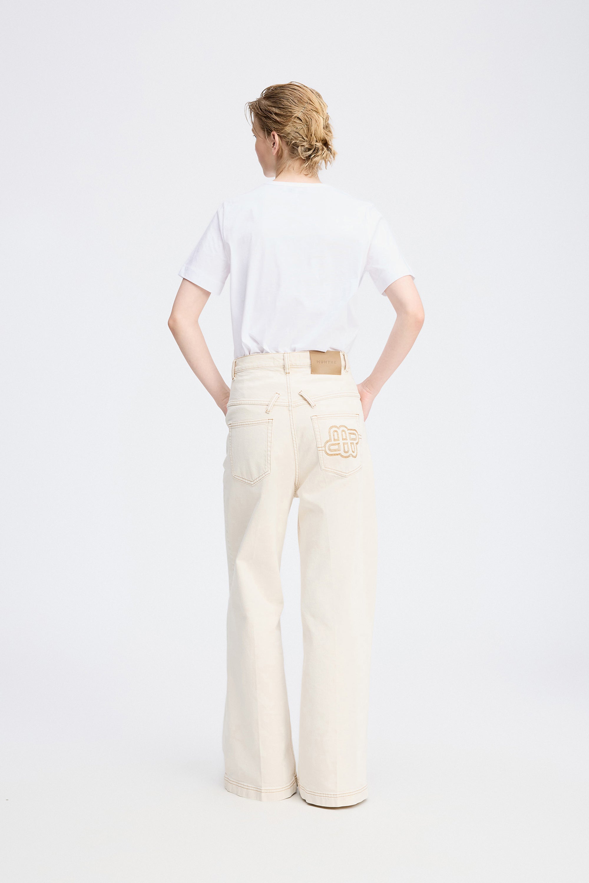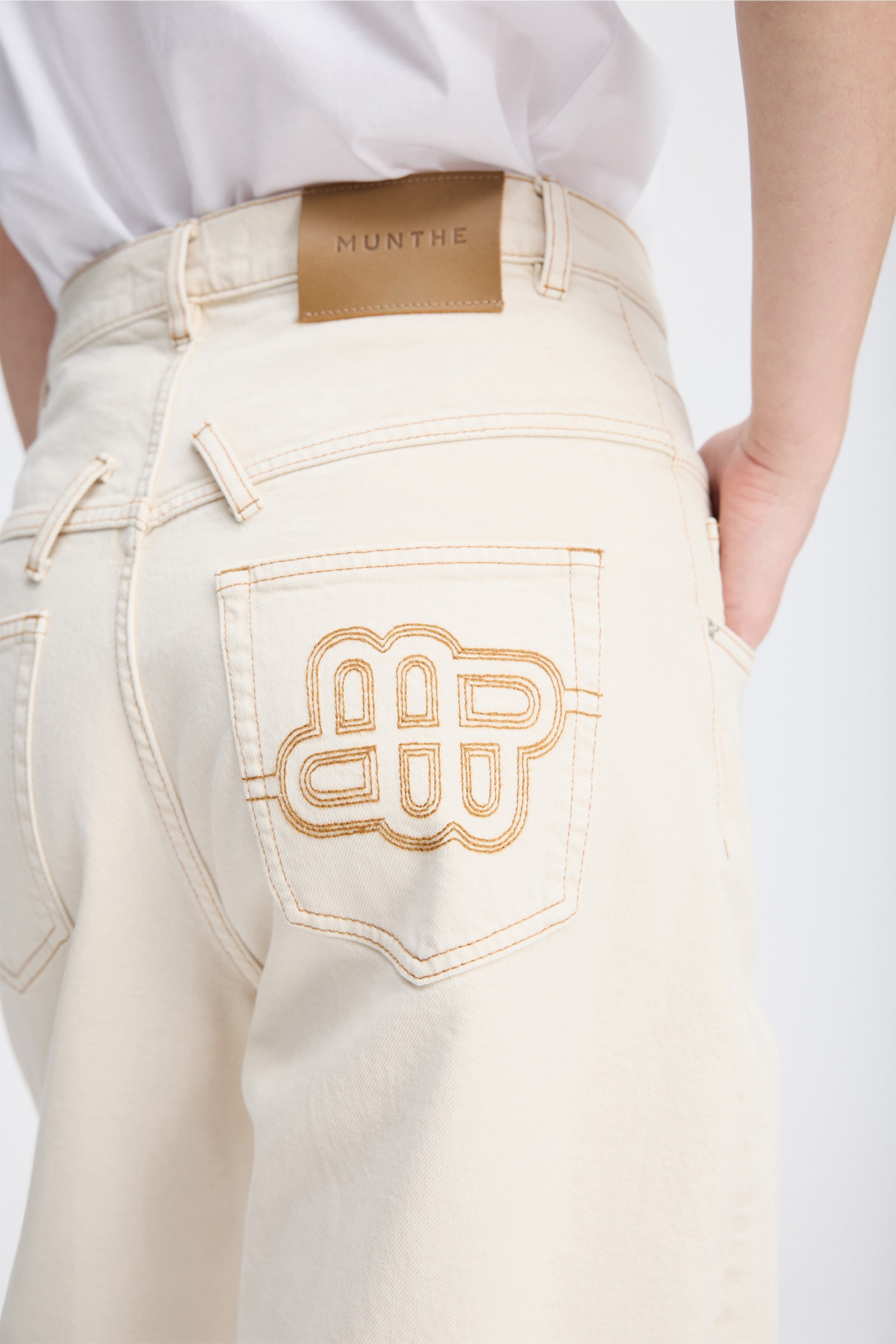 Hoge taille broek in off-white denimkwaliteit met contrasterende stiksels. Deze jeans is ontworpen met een prachtig MUNTHE-embleem op de achterzak, wijde pijpen, riemlussen, zakken en een elegante dubbele knoopsluiting.