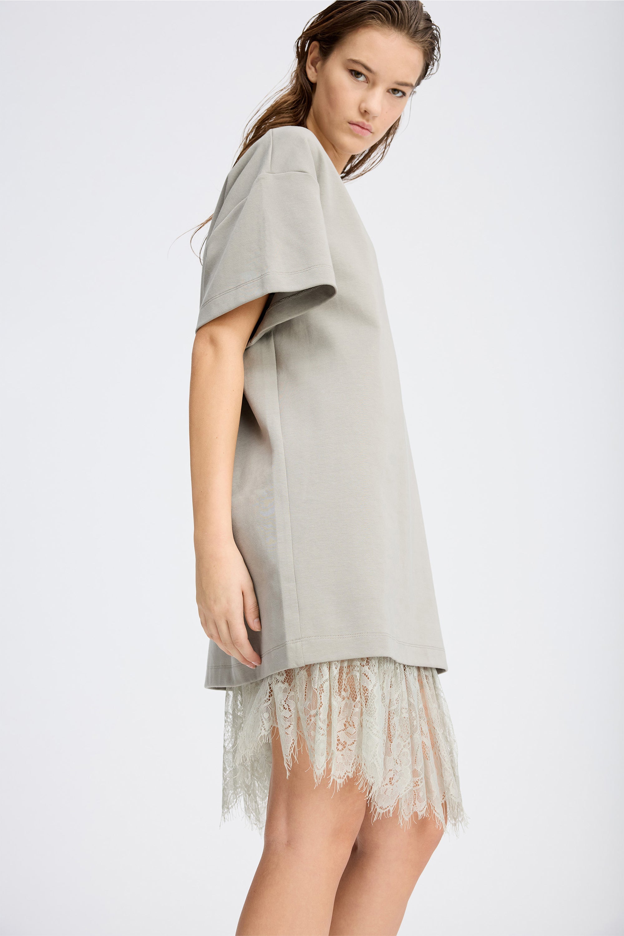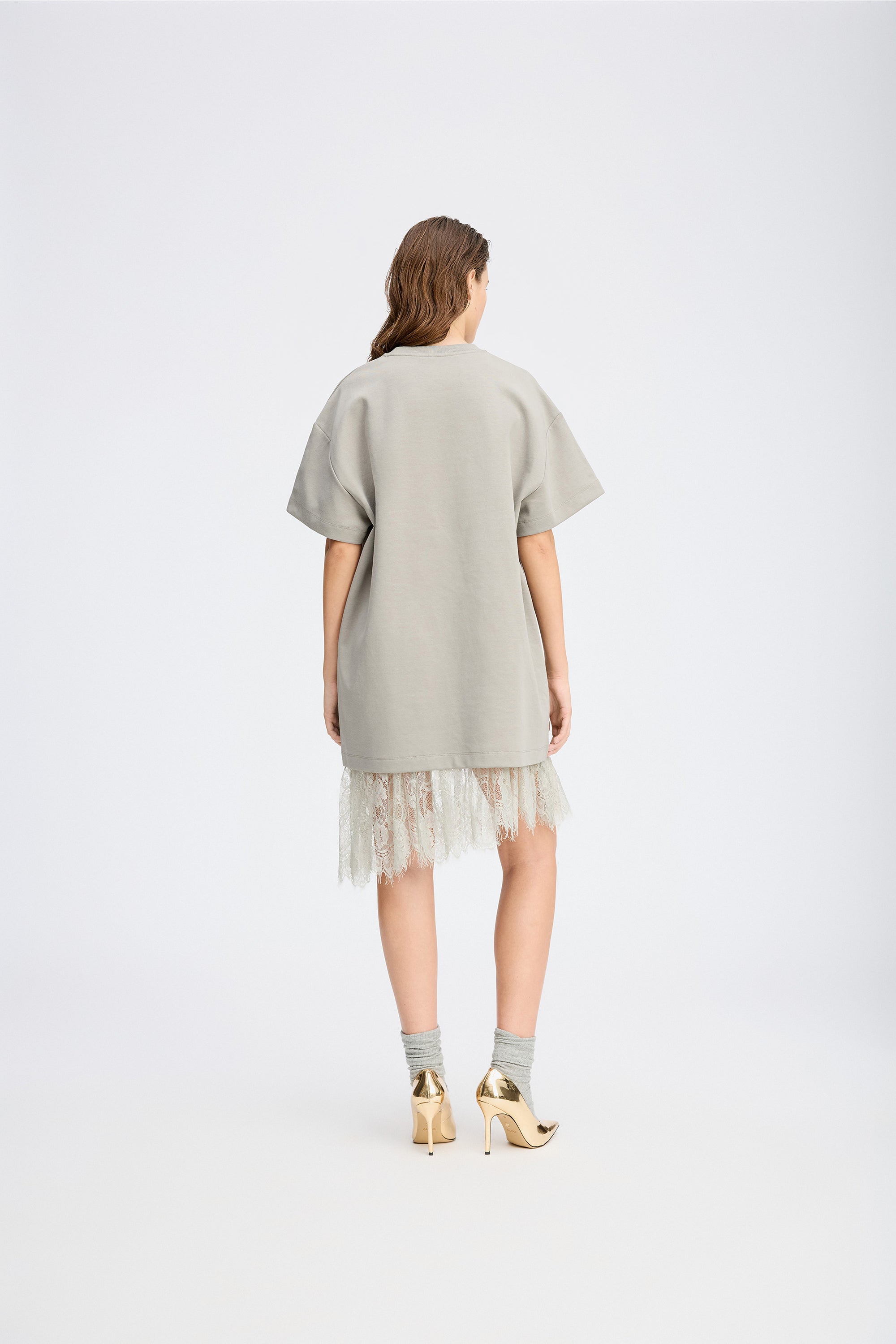 Elegante en veelzijdige stijl bestaande uit een T-shirt met korte mouwen en een losse, lichtgewicht top met een asymmetrische kanten zoom. Het T-shirt kan op zichzelf worden gedragen voor een eenvoudige dagelijkse look, terwijl de kanten top een vrouwelijke touch toevoegt – draag ze samen of apart.