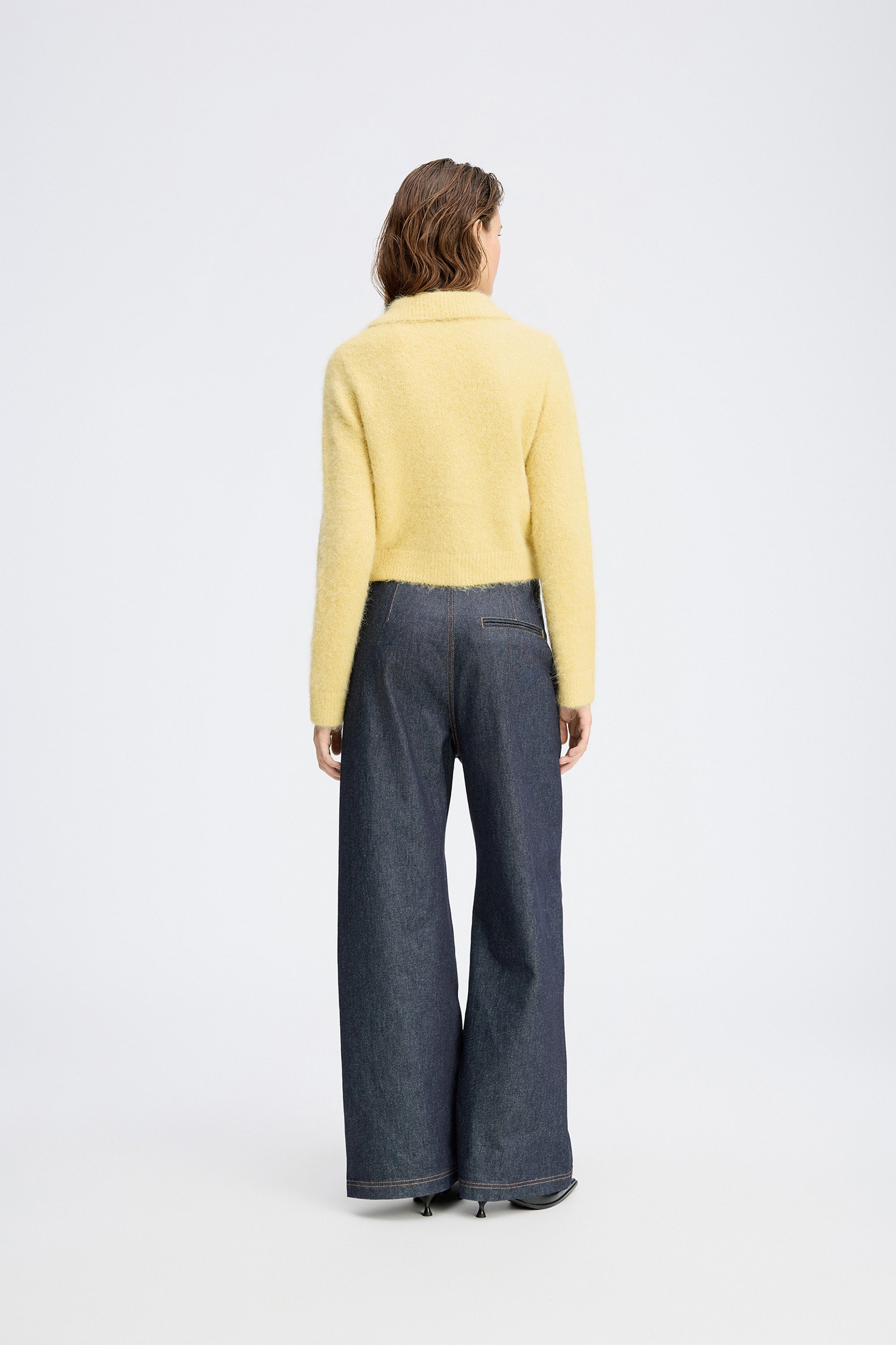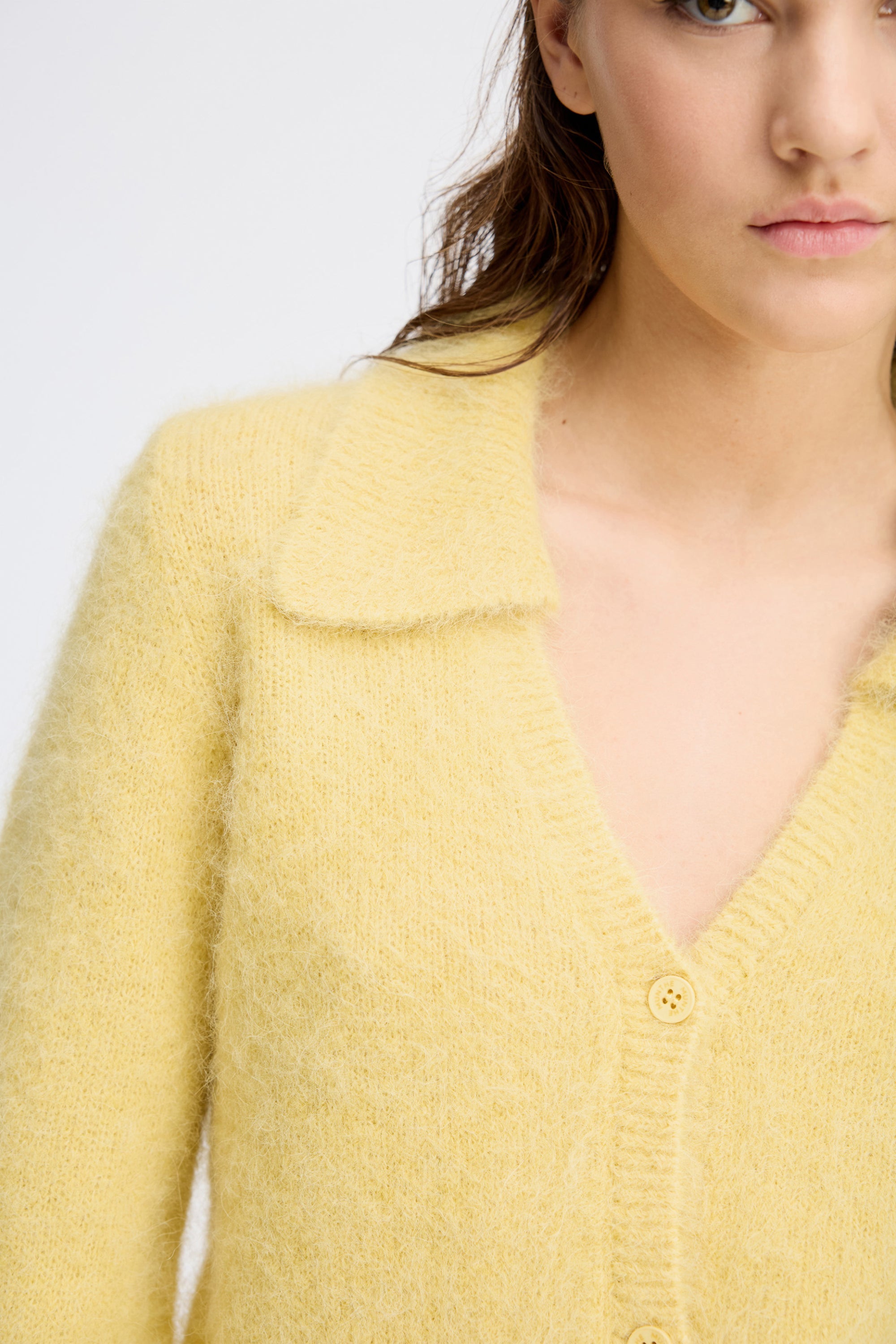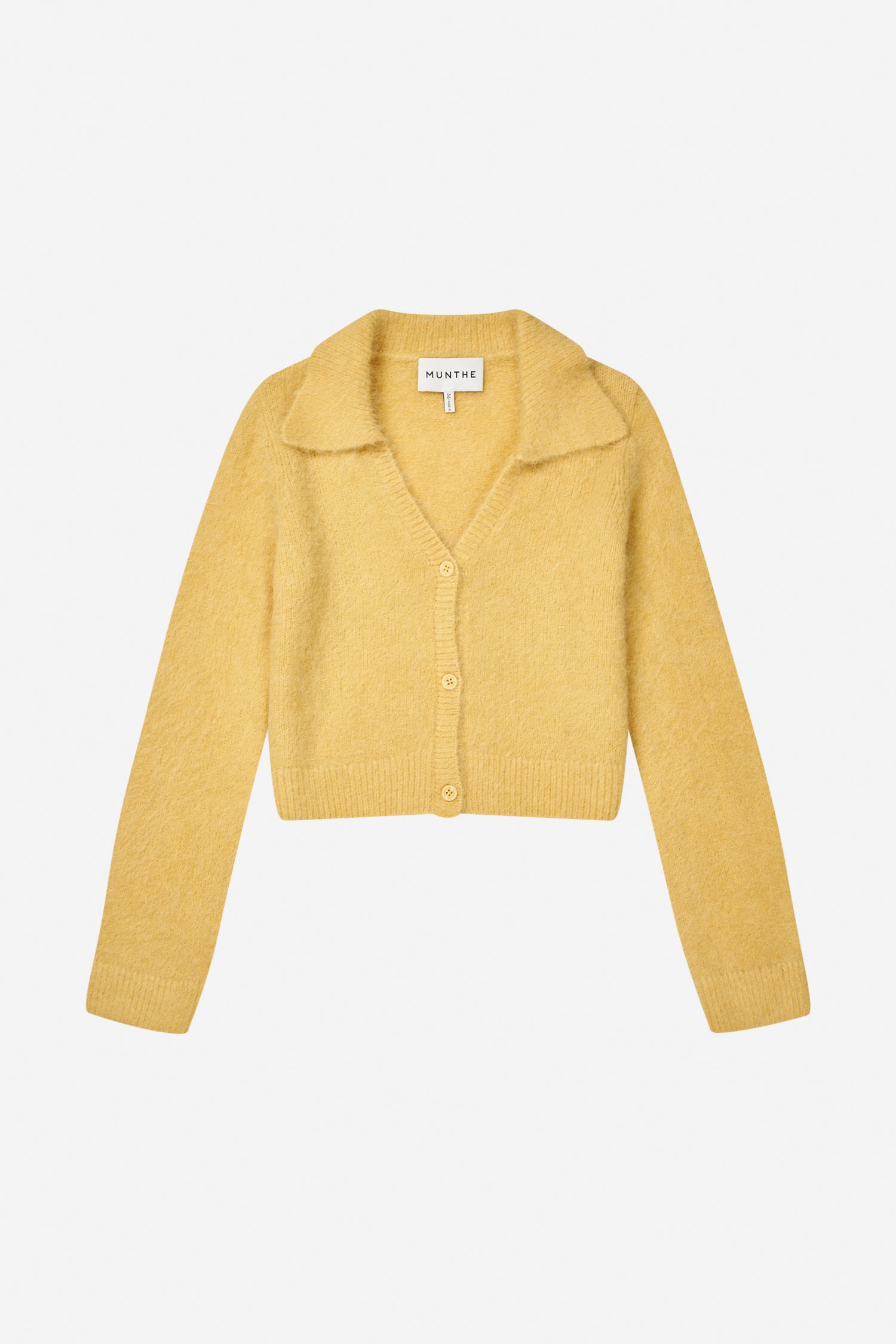Mooie, zachte cardigan met een elegante kraag en geribbelde boorden aan mouwen en zoom. Het gebreide item is ontworpen met een diepe V-hals en een knoopsluiting aan de voorkant.