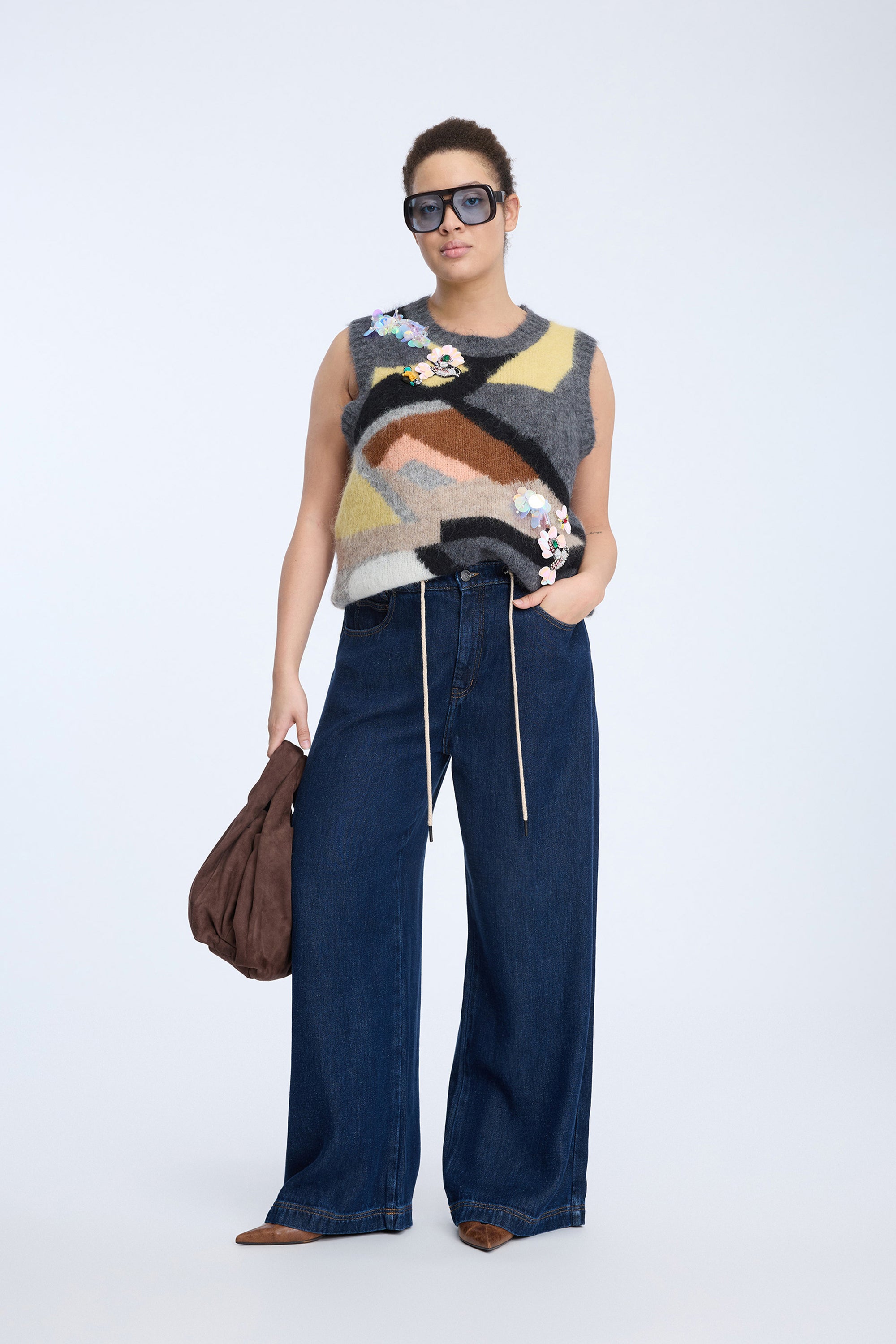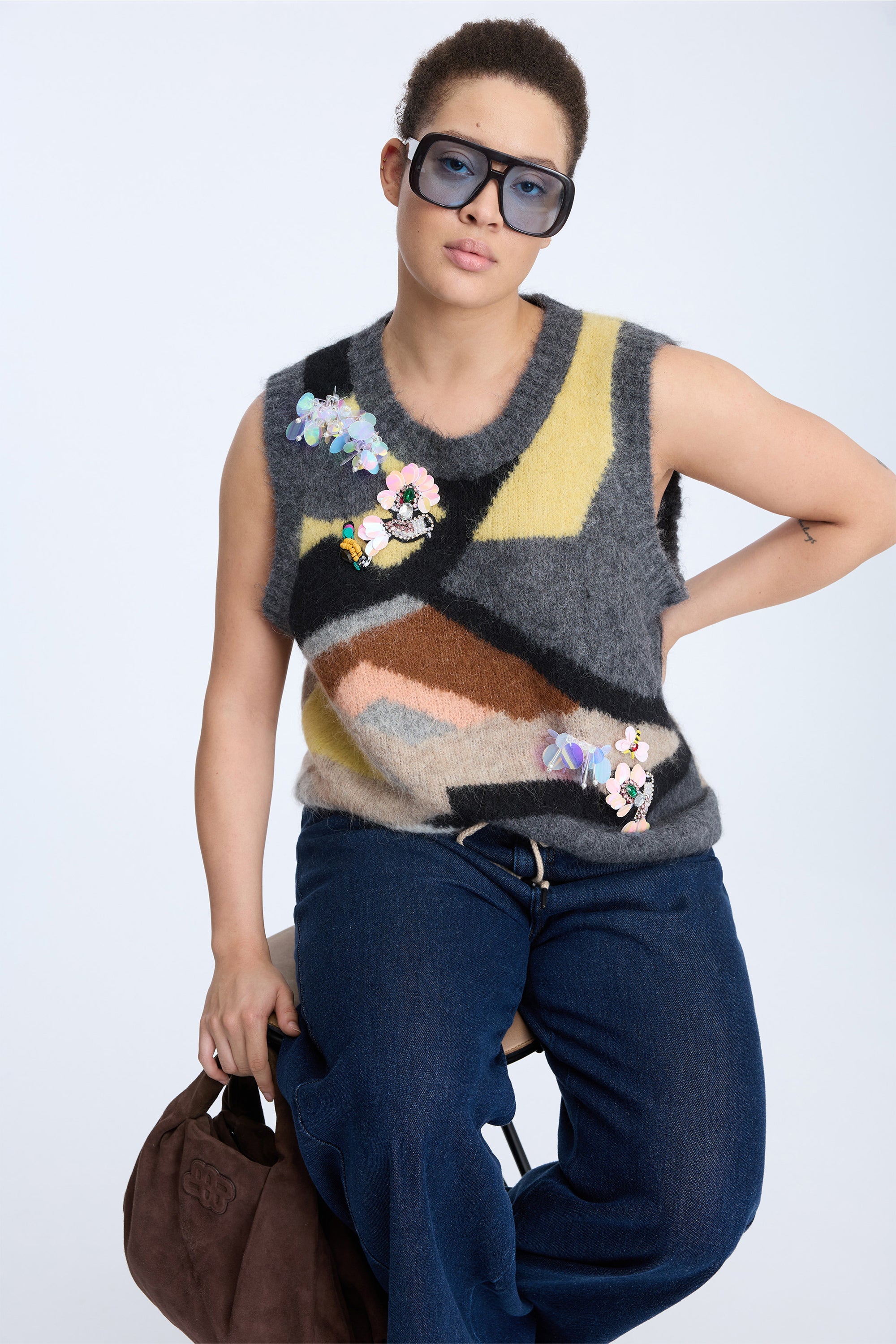Prachtig, zacht gebreid vest met een elegant, abstract patroon in grijze, gele en aardetinten. Het vest is versierd met fonkelende applicaties en bloemdetails, wat zorgt voor een mooie en artistieke uitstraling.