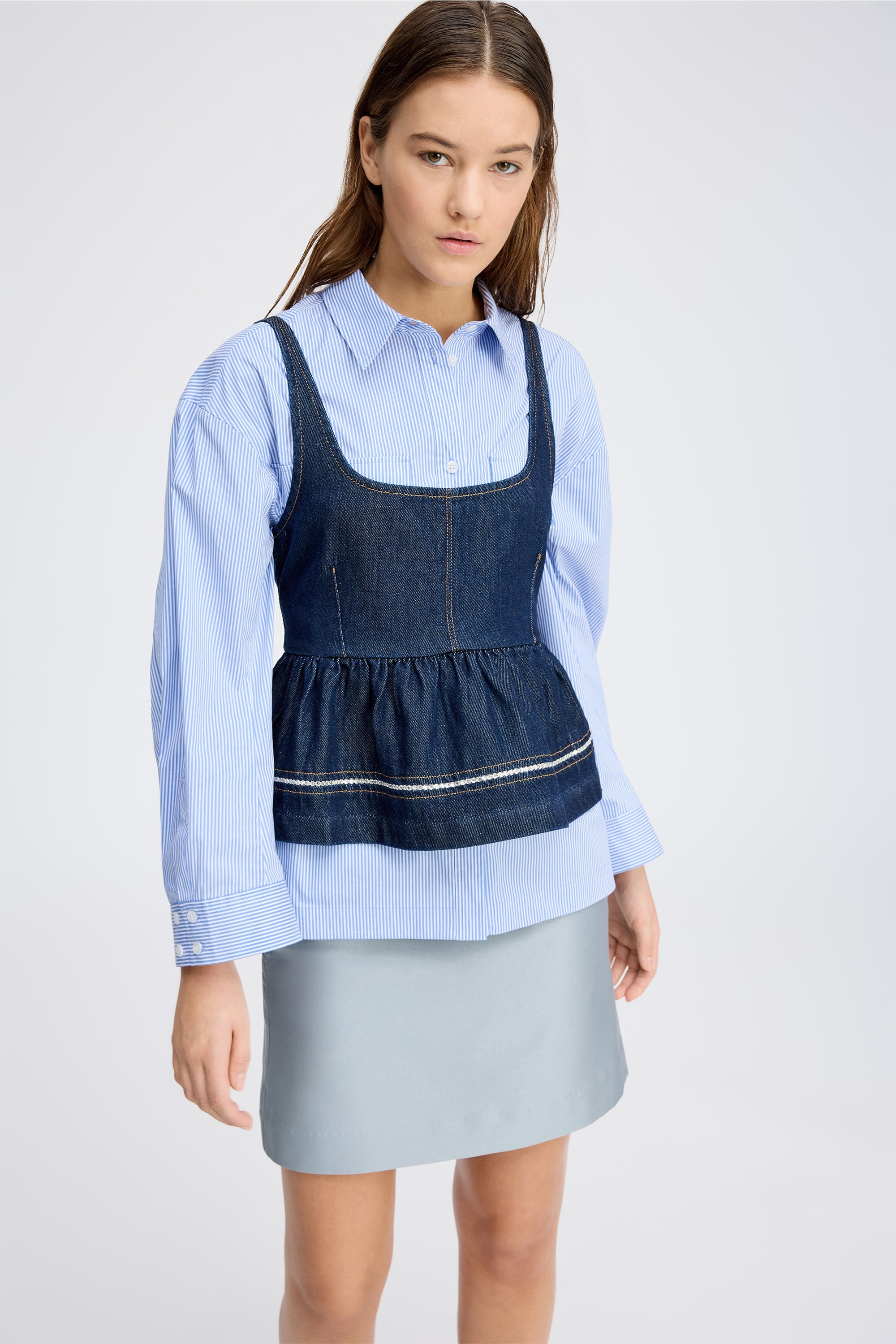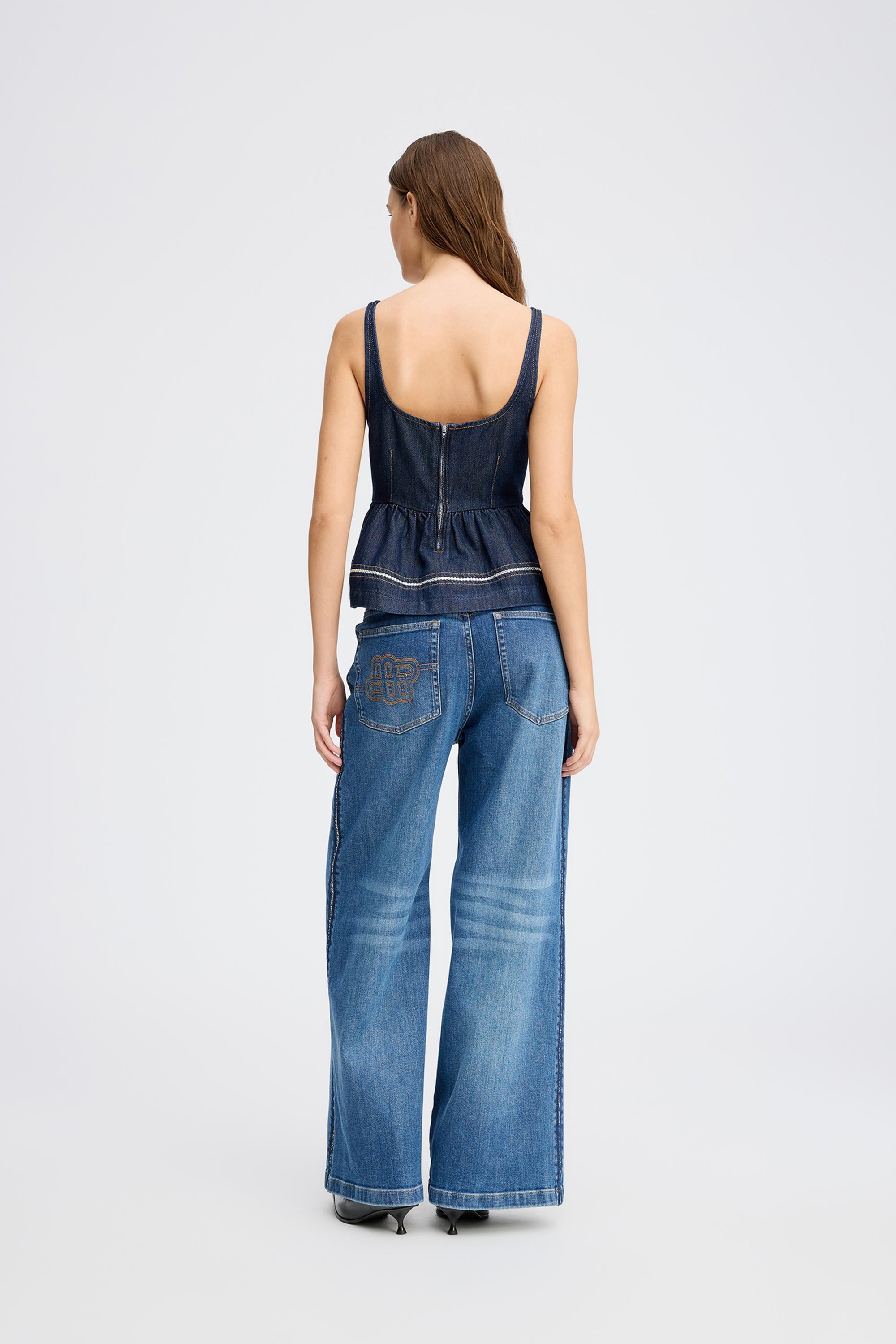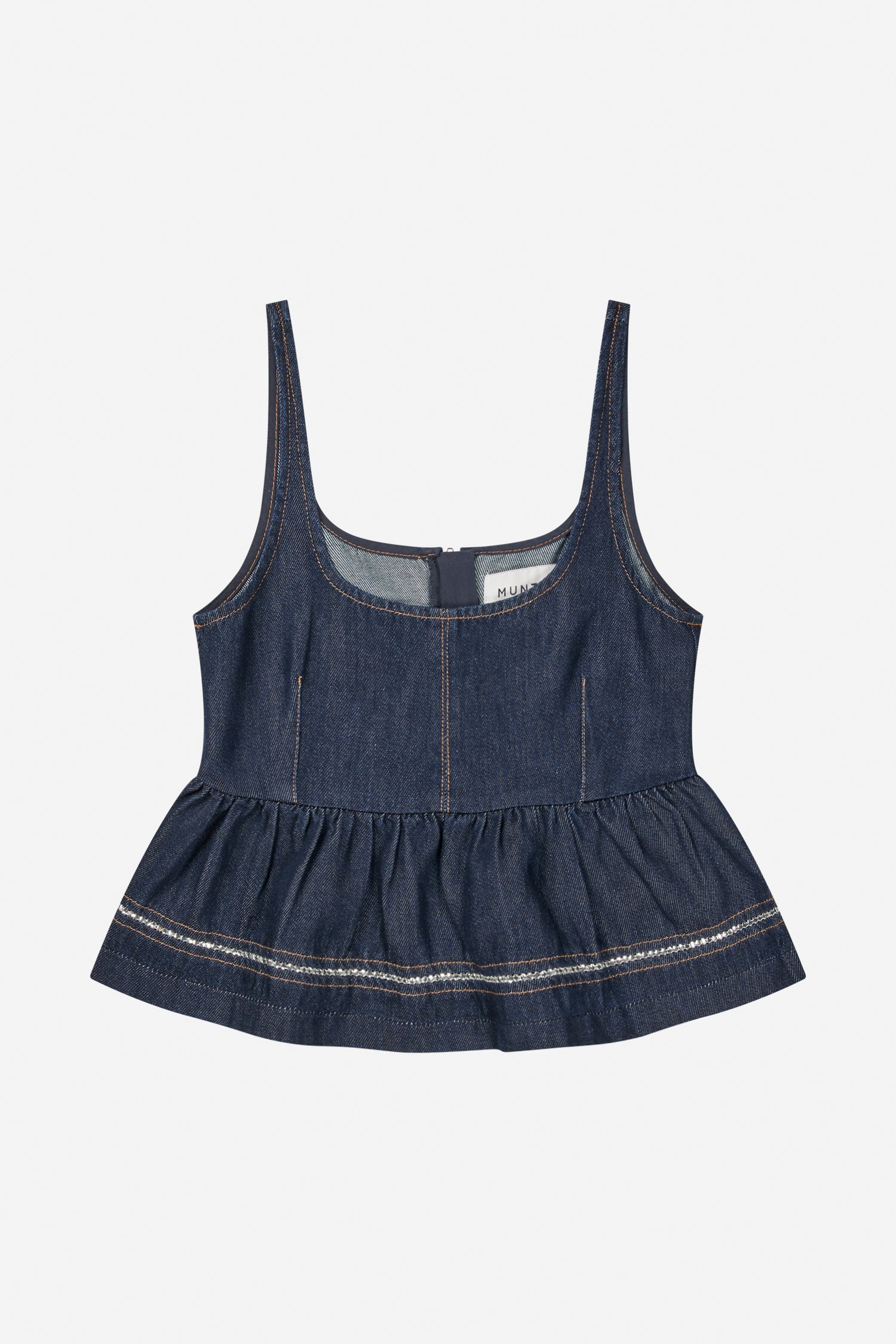 Mooie denimtop met brede bandjes en een elegante peplumvorm. De top heeft decoratieve stiksels en delicate strassdetails langs de rand.