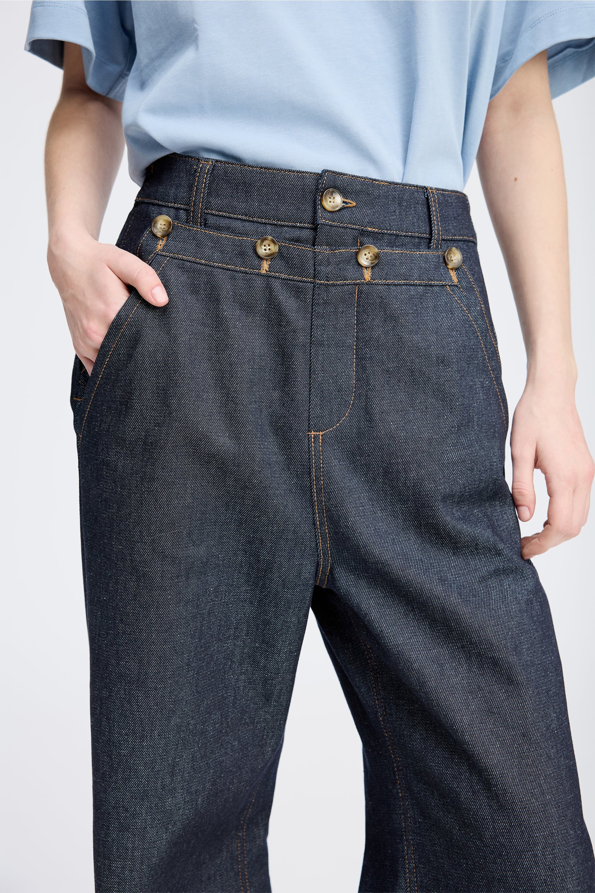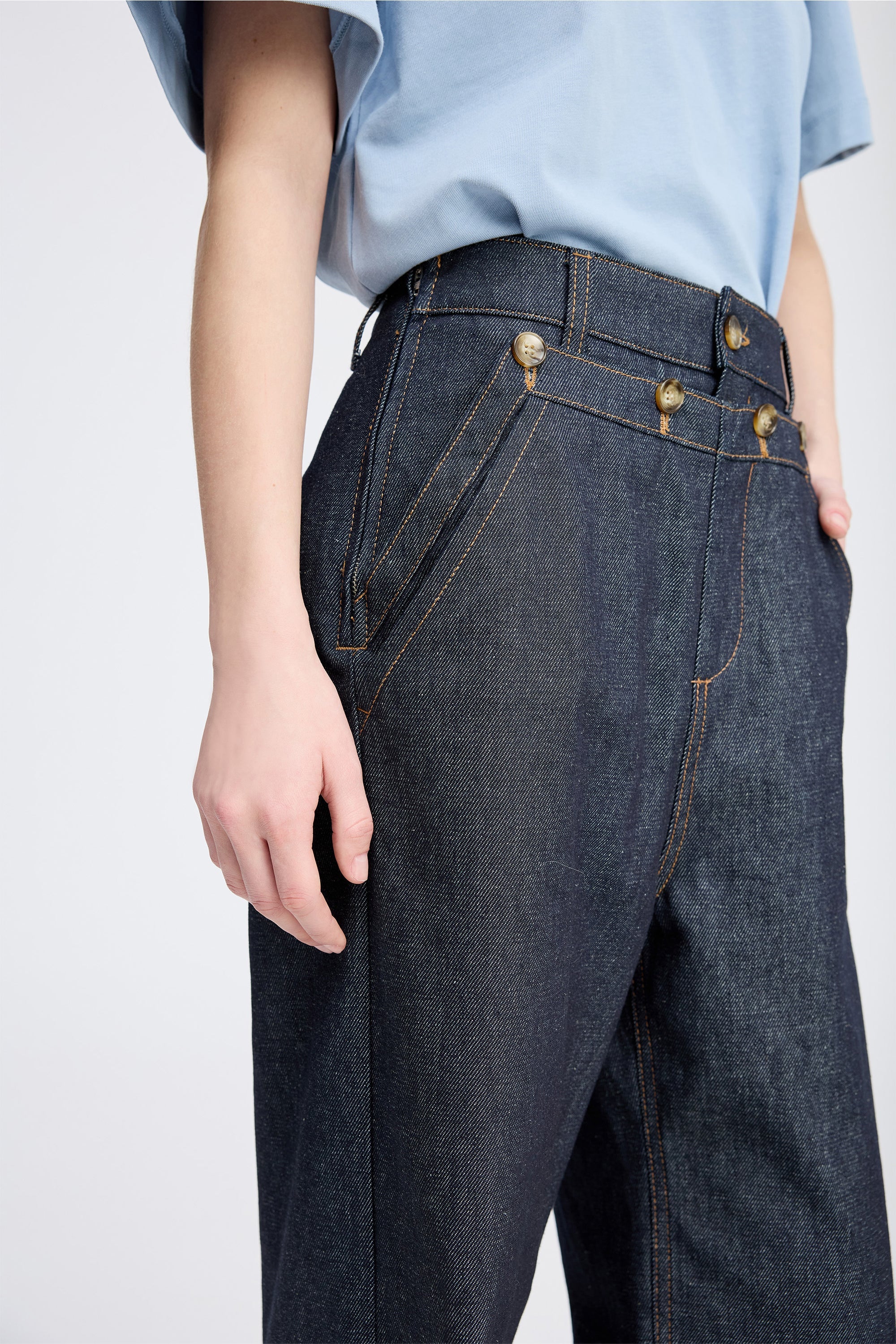 Elegante jeans met een hoge taille en unieke knoopdetails aan de voorkant, die een moderne twist geven aan een tijdloze look. Deze jeans is ontworpen met een zijrits, riemlussen en achterzakken.