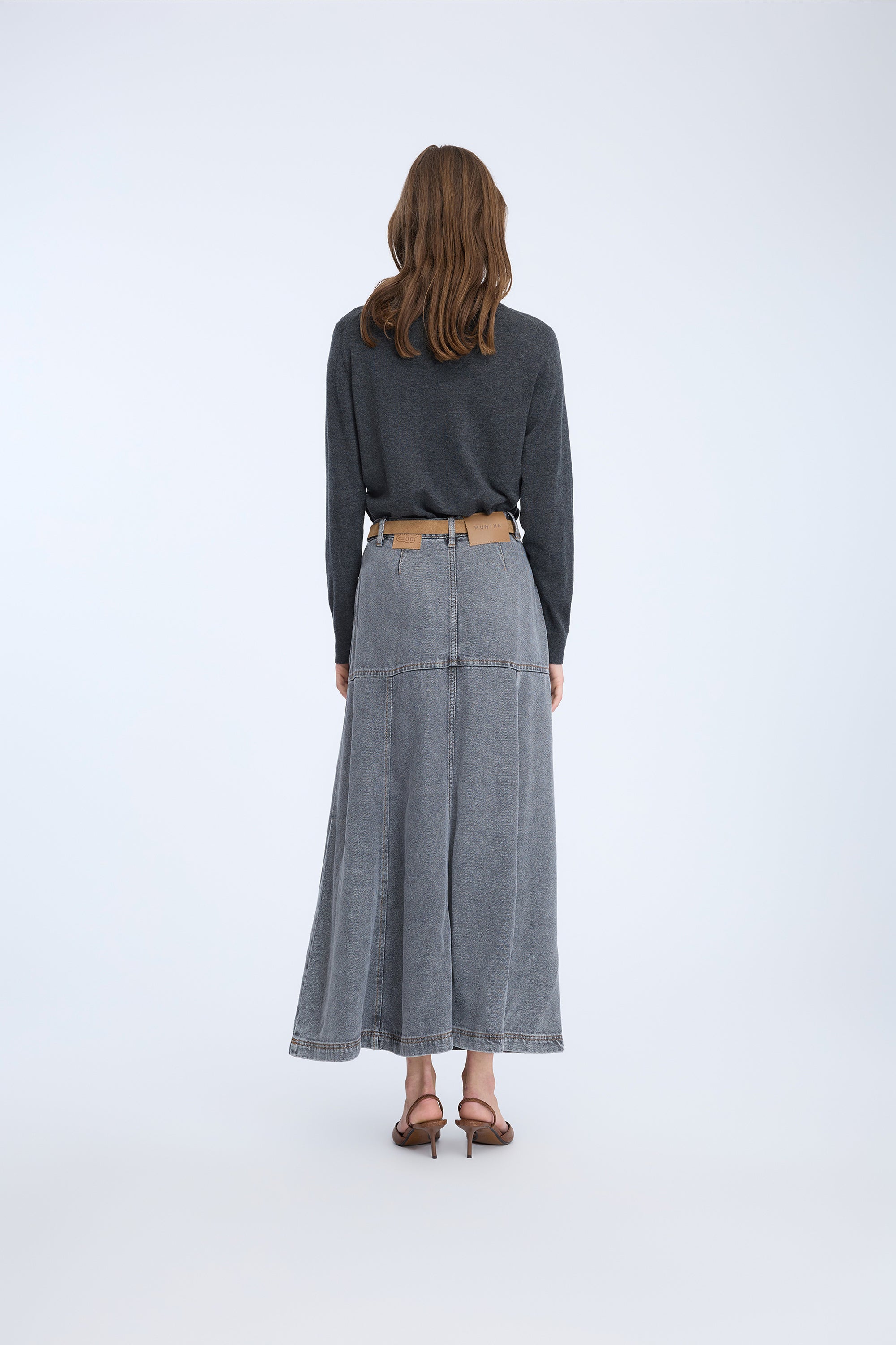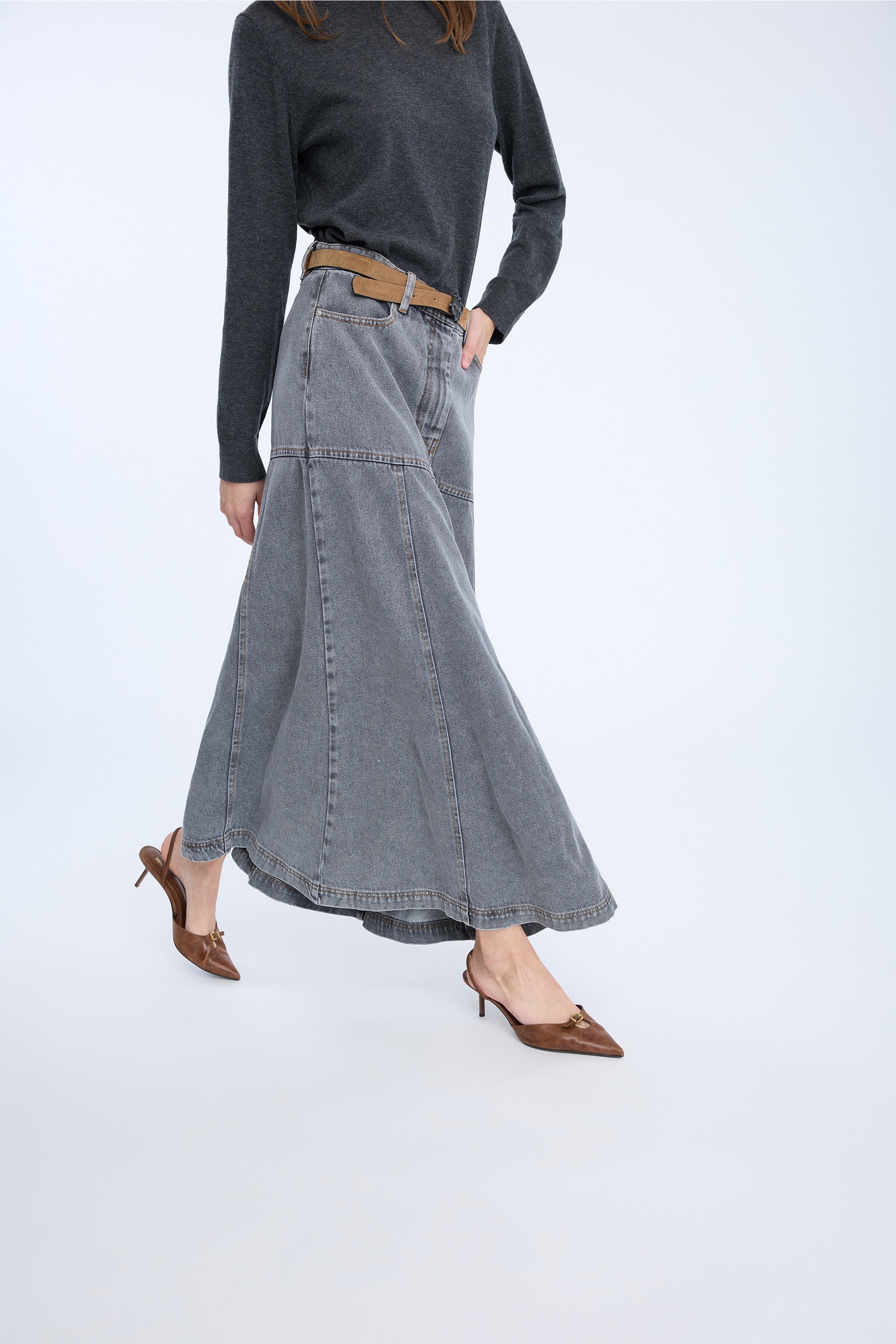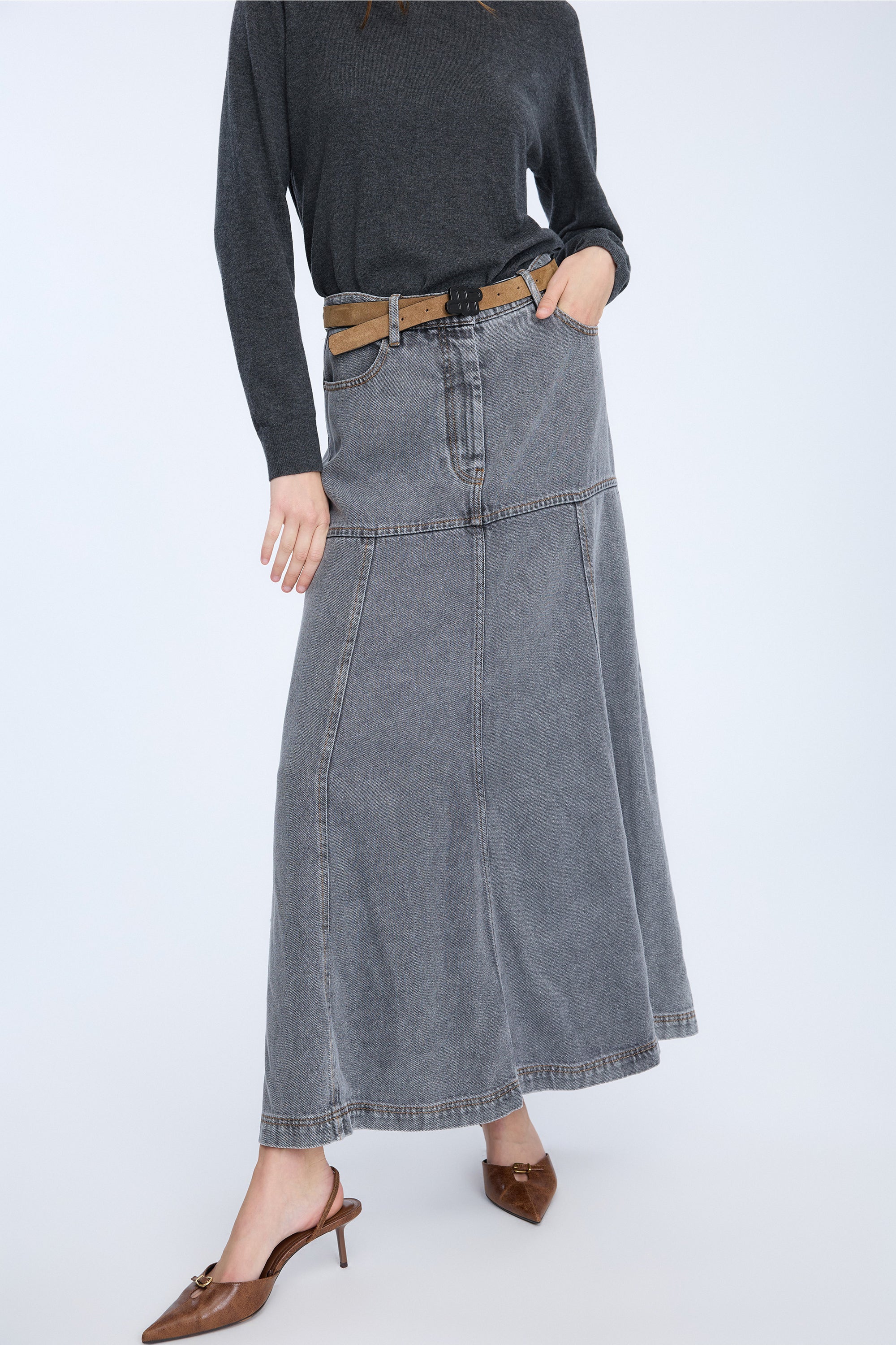 Een prachtige denim rok met een strakke pasvorm rond de heupen en een contrasterend flair effect vanaf de heupen en naar beneden. De rok heeft riemlussen, zakken en een normale pasvorm.